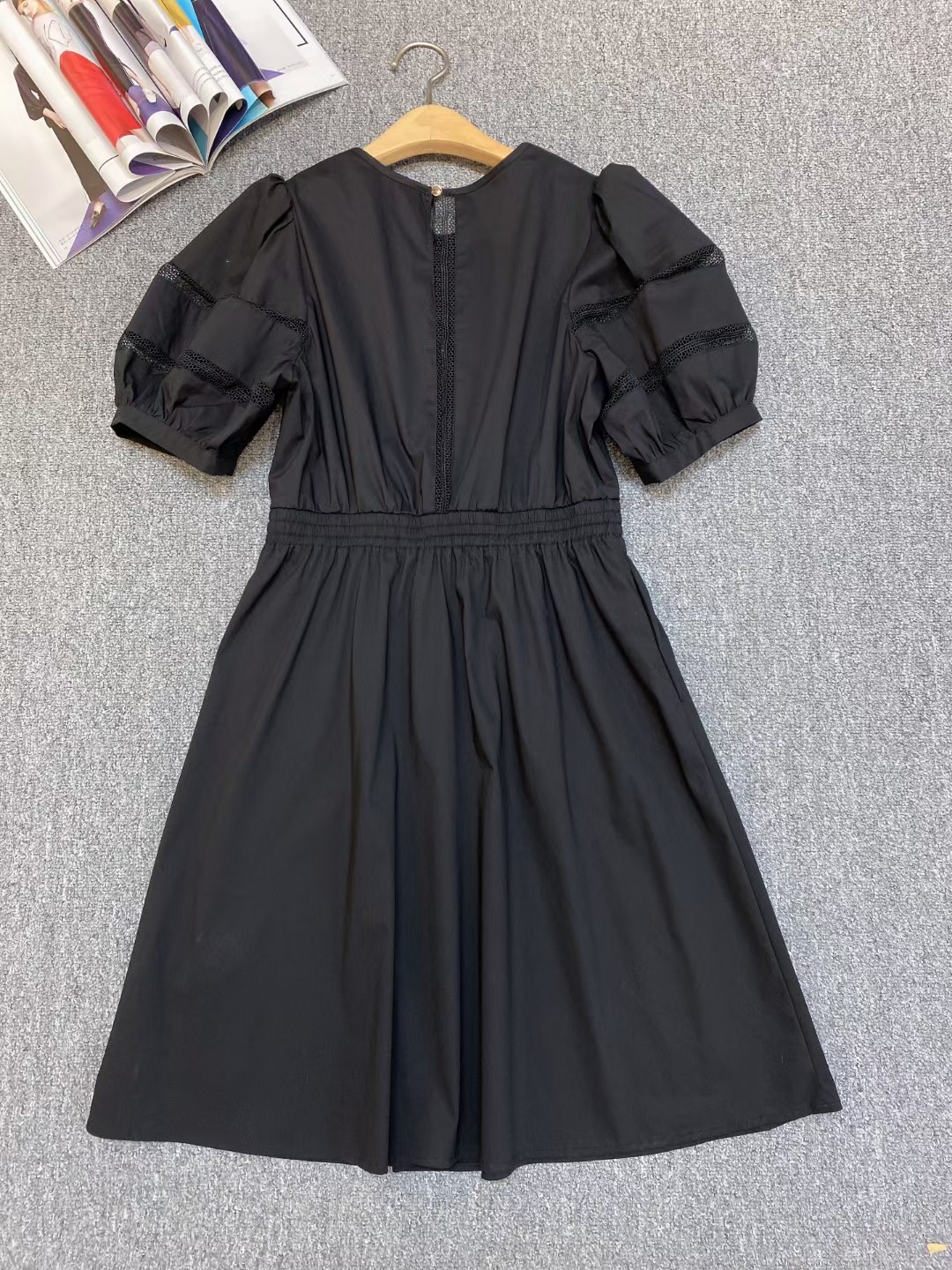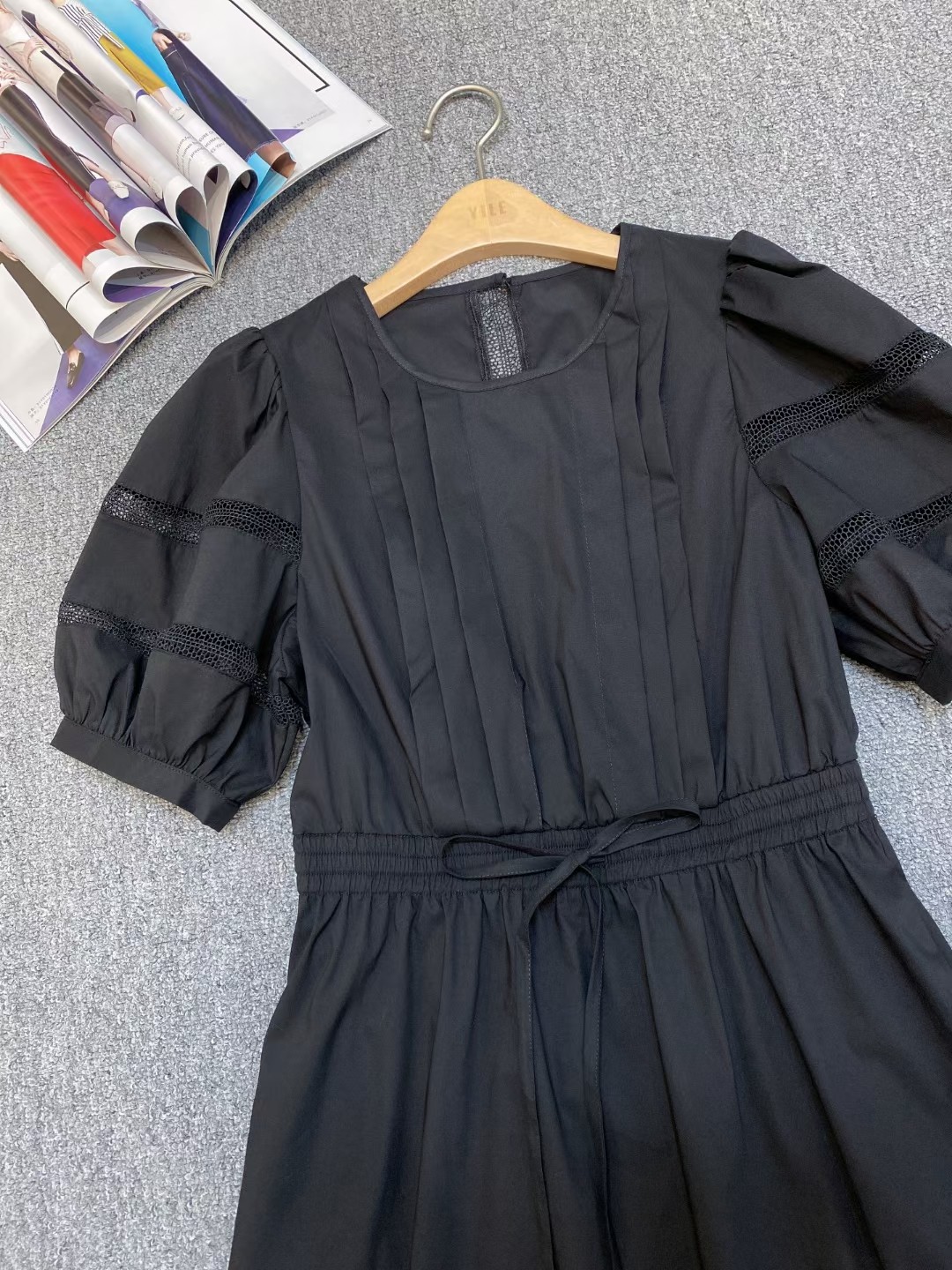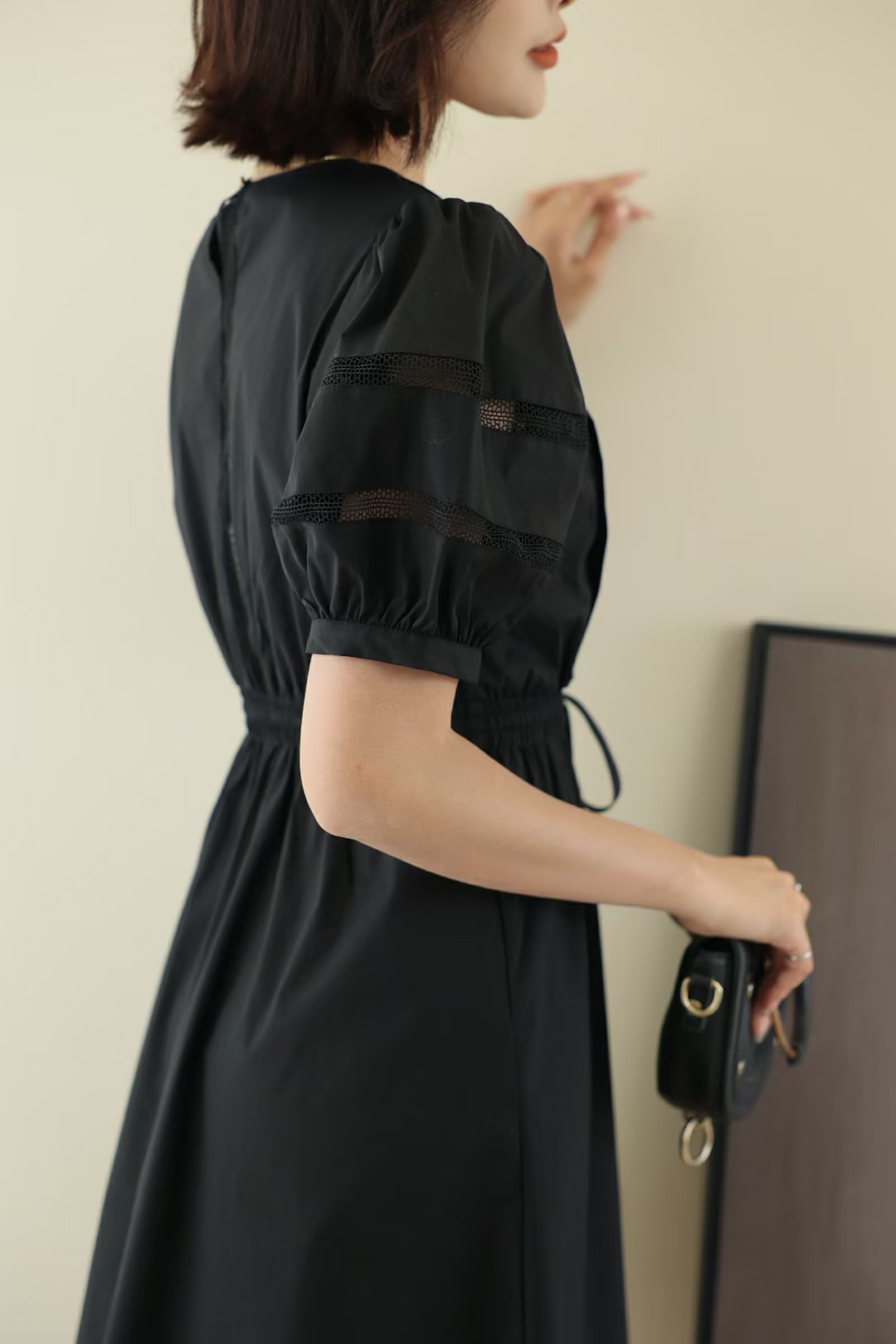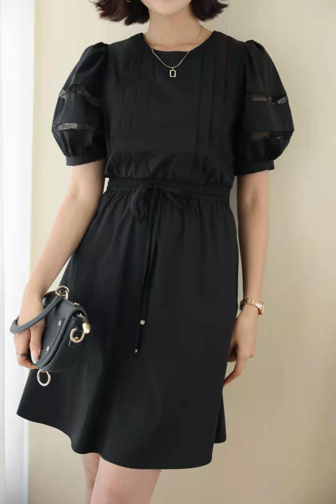 少女感很多人都觉得是专属于少女的一个词,其实并不尽然,毕竟对于现代人来说年龄早就不是一个问题了,维持少女感主要靠氛围感,可以从穿搭和造型下手。这件圆领黑色连衣裙作为基础款的连衣裙也非常有小心机哦,楼空泡泡袖的设计对拜拜肉友好,裙摆更显得慵懒又娇俏。