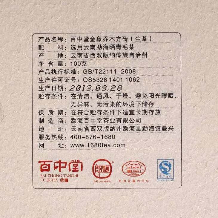 百中堂 2013年金象乔木方砖 高山头春普洱茶 生茶100g