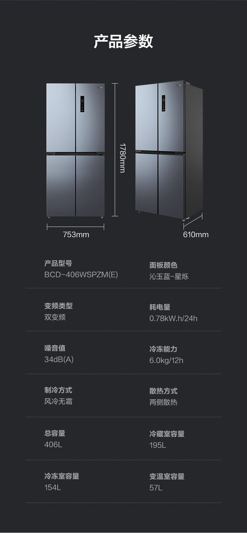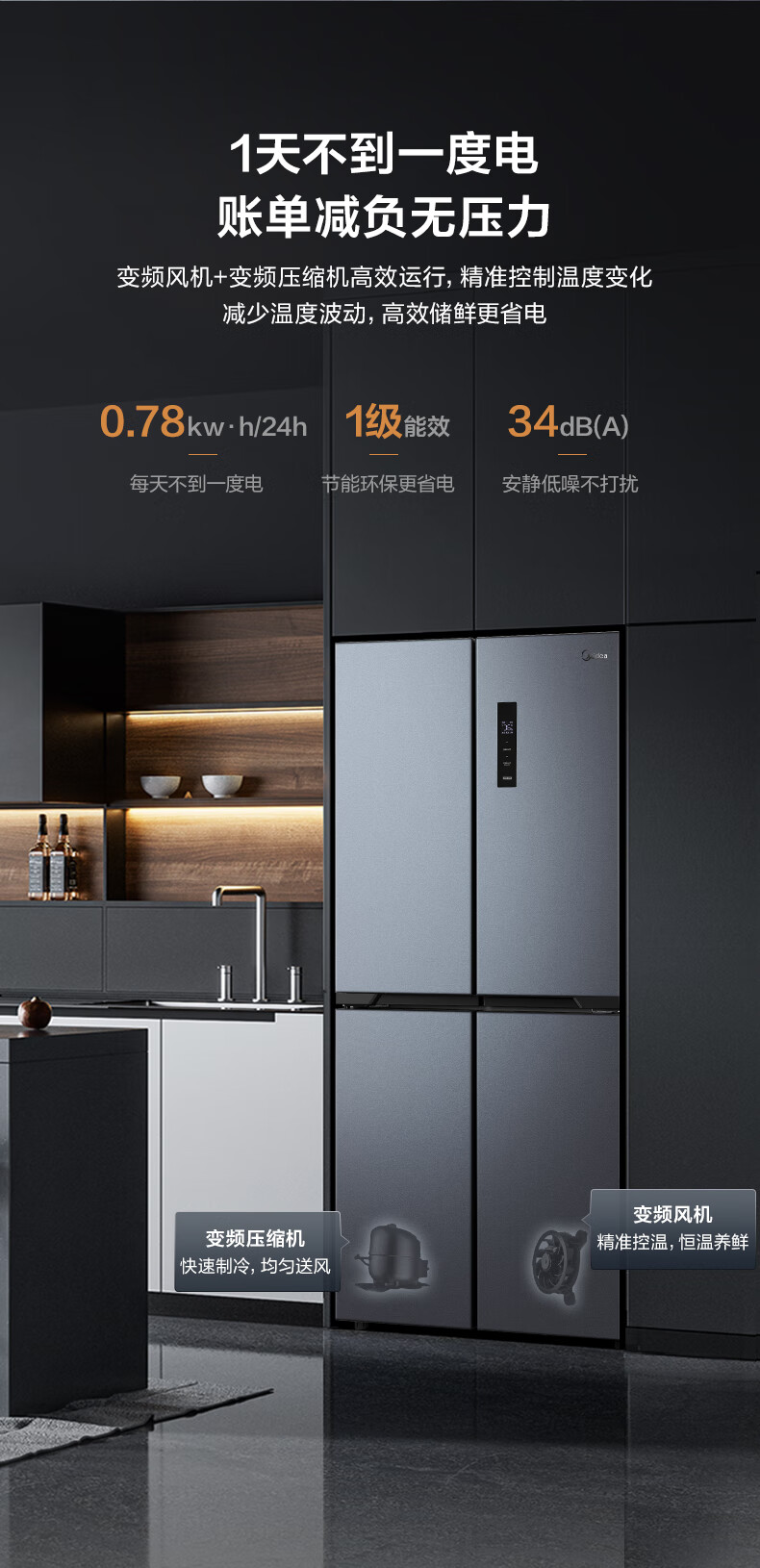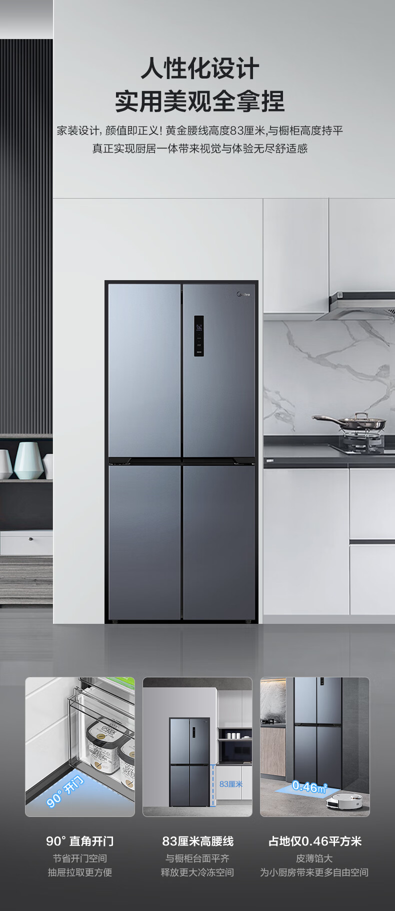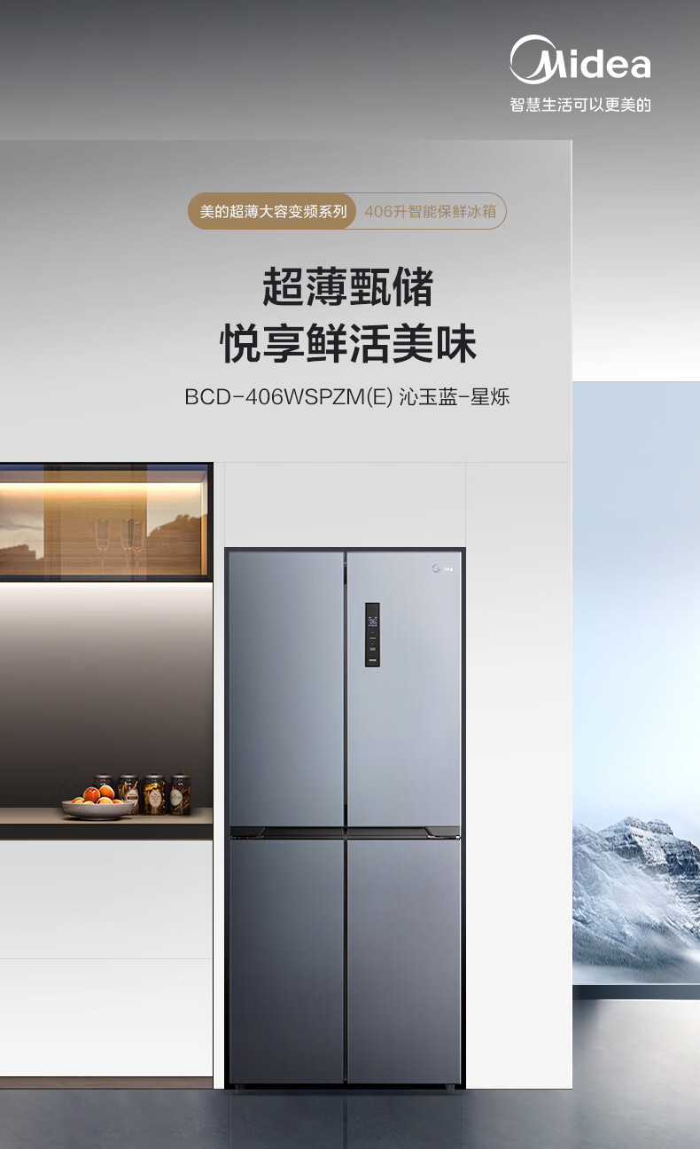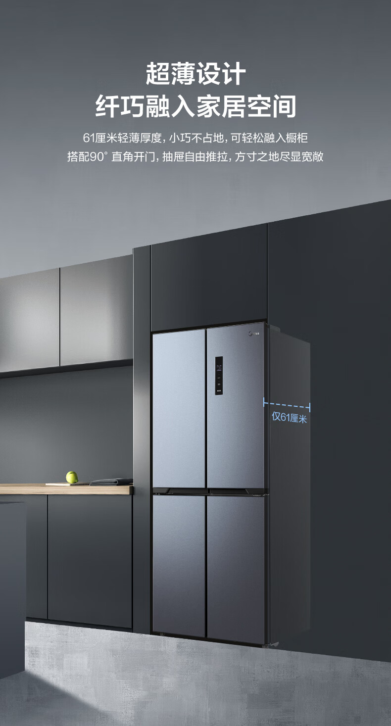 美的61厘米薄406升一级智能双变频十字对开双开门四开门家用电冰箱大容量BCD-406WSPZM(E)