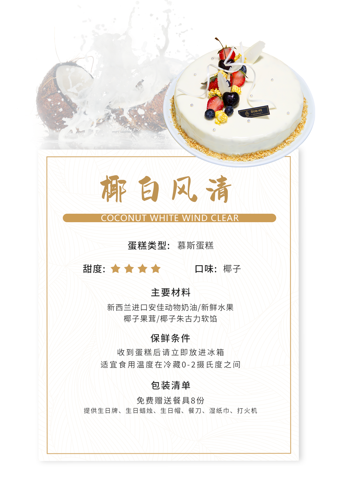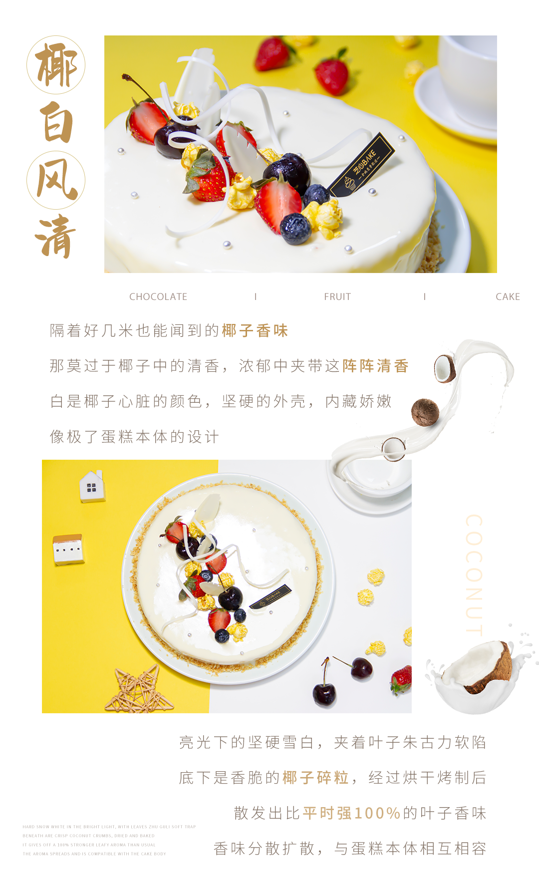【椰白风清】- 白是椰子的心脏的颜色 坚硬的外壳,内藏娇嫩 像极了蛋糕本体的设计