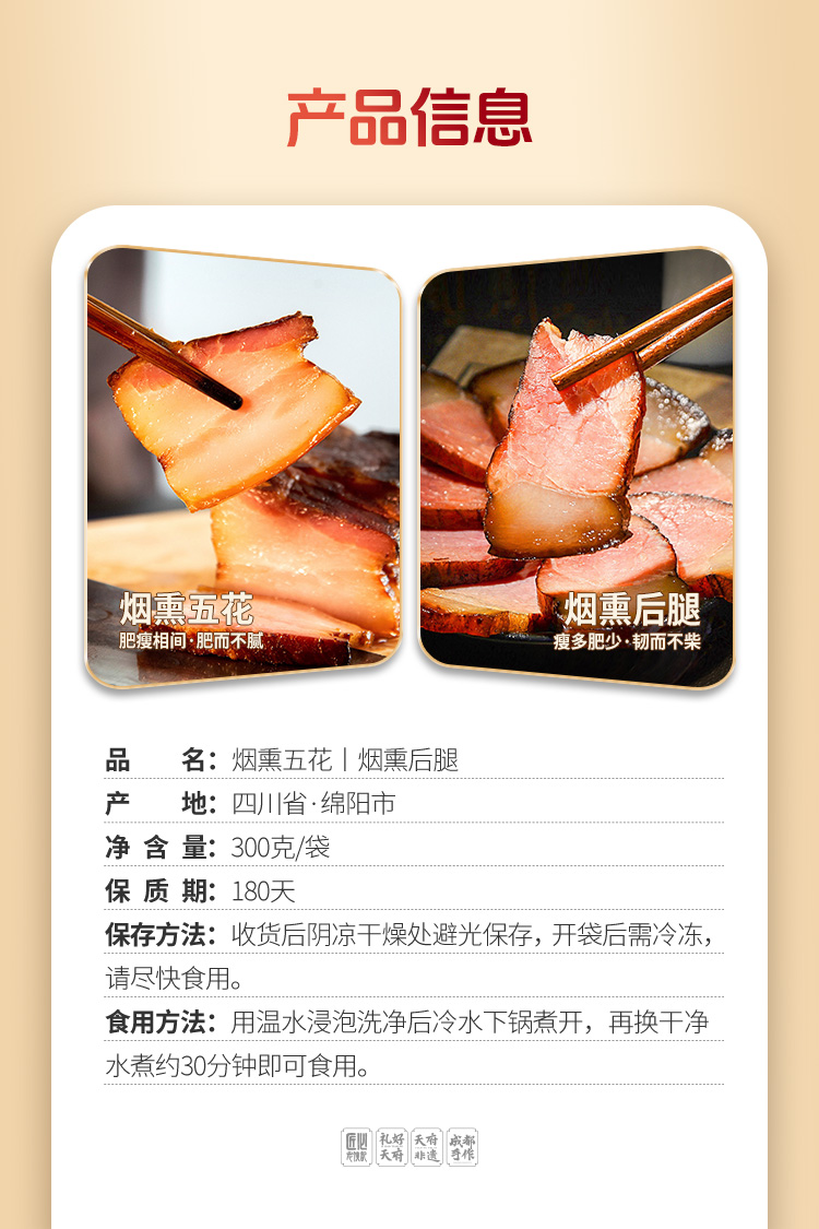 【产品口味】①烟熏后腿300g/袋;②烟熏五花300g/袋;