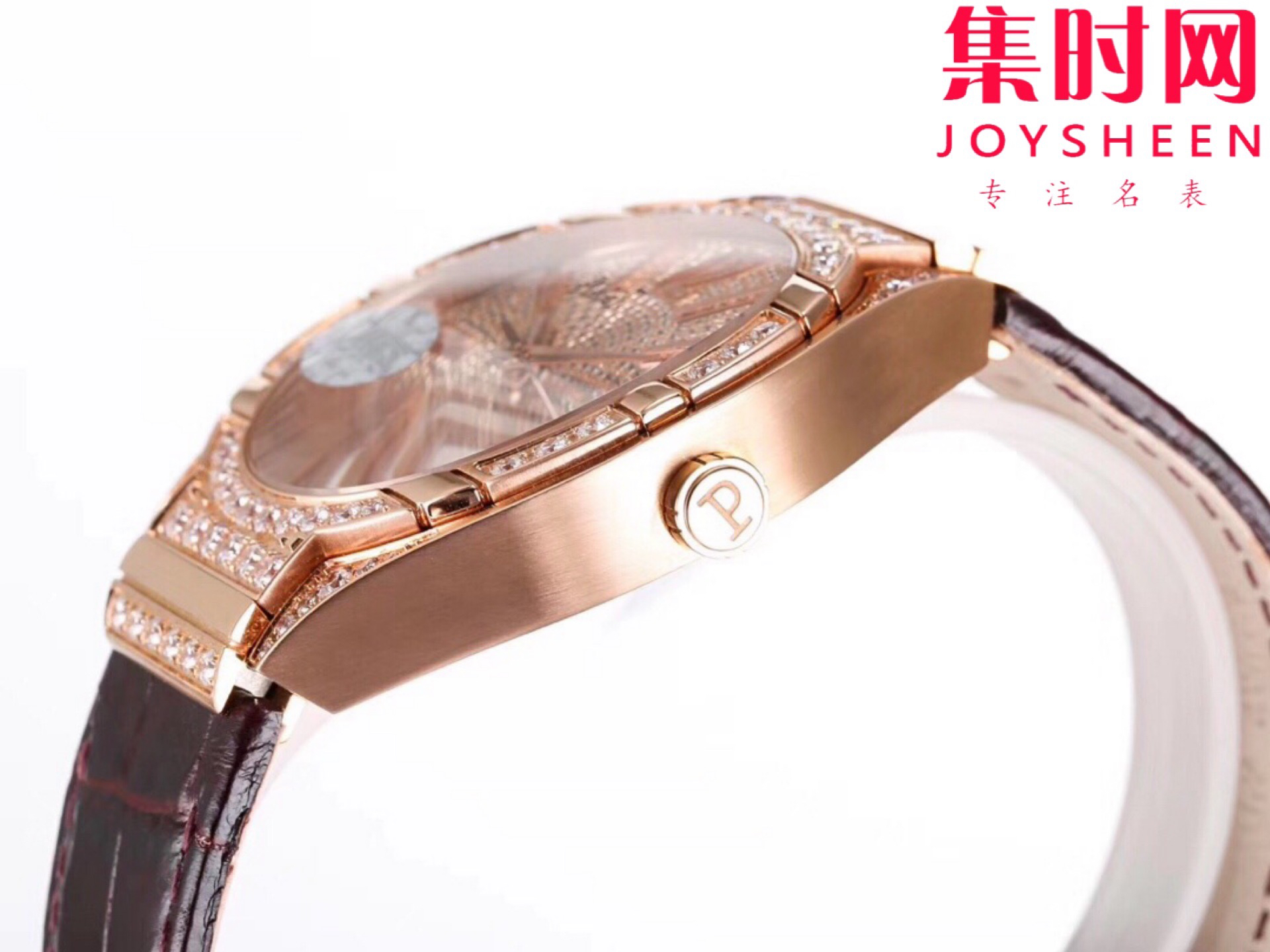 【表盘】价值不菲的盘面共拥有486颗ding级施华洛世奇。宝石的大小,切工和火彩都经过严格筛选,确保一致。12个精品刻度标识,采用CNC切削成型,在由制表师耐心修润,最后镶贴而上。【机芯】9015改伯爵800P自动上链机械机芯,经久耐用,质量稳定。