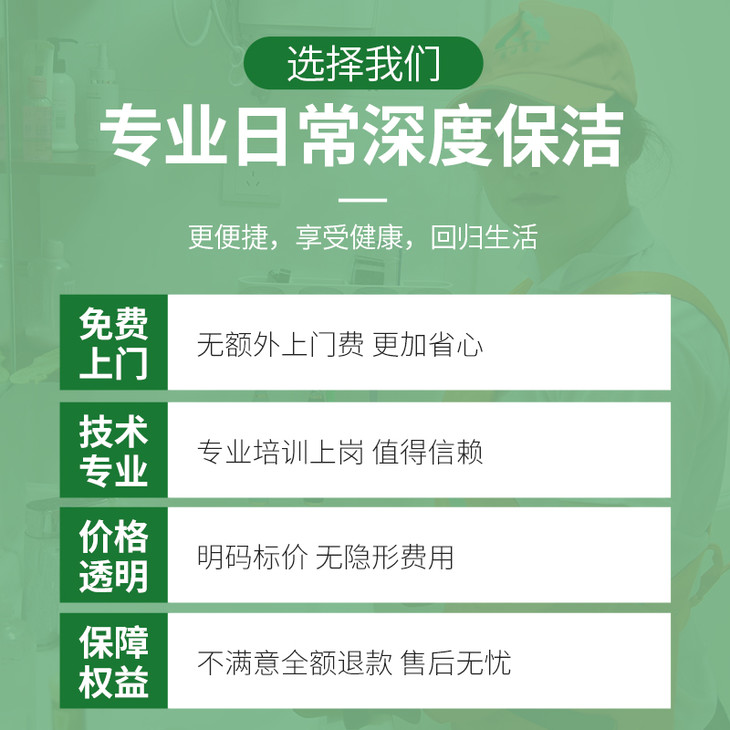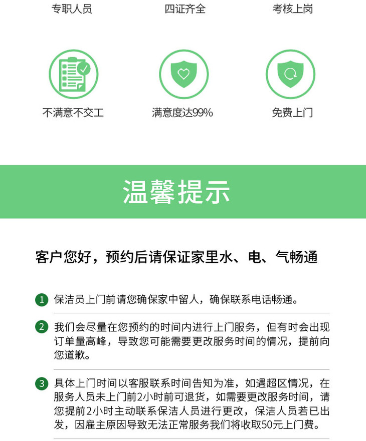 服务说明:临近春节期间库存较满,请提前安排您的保洁服务,若因库存问题导致无法服务,请您谅解!