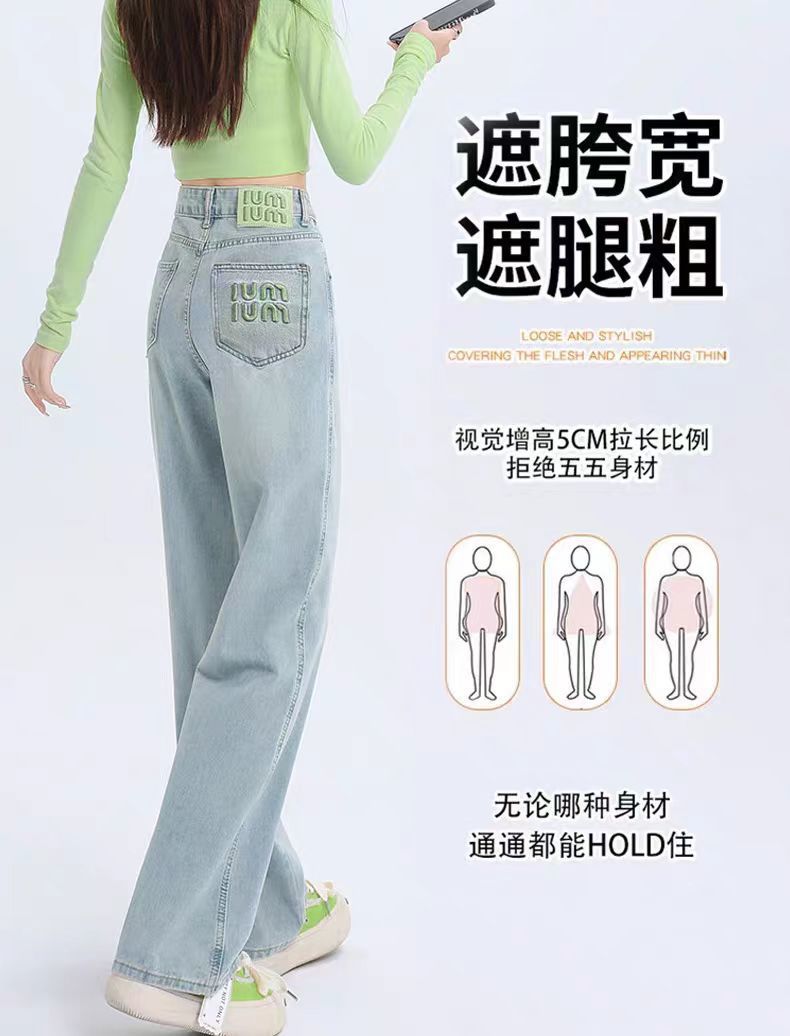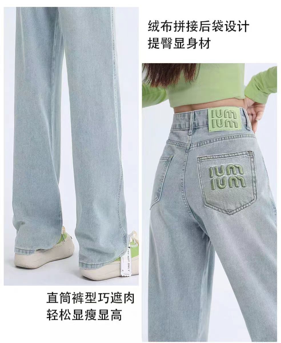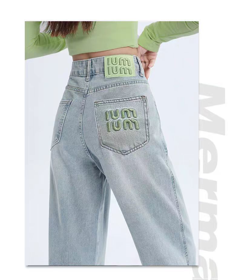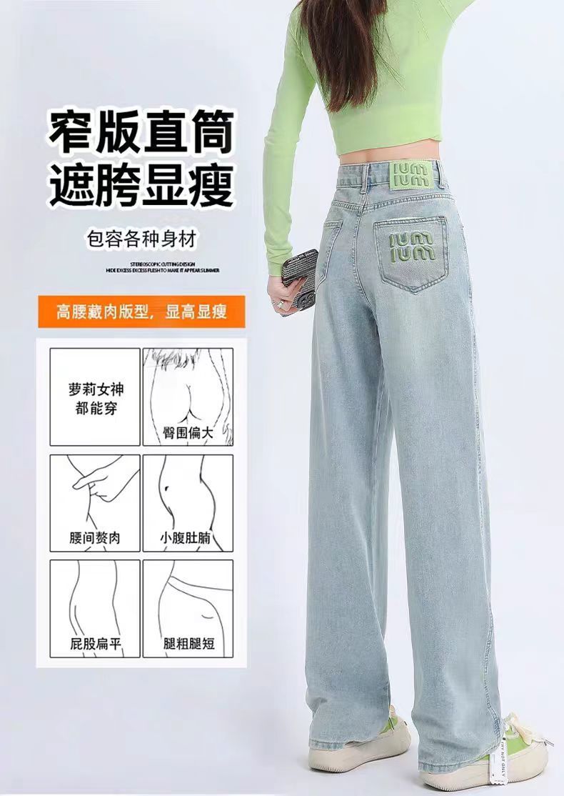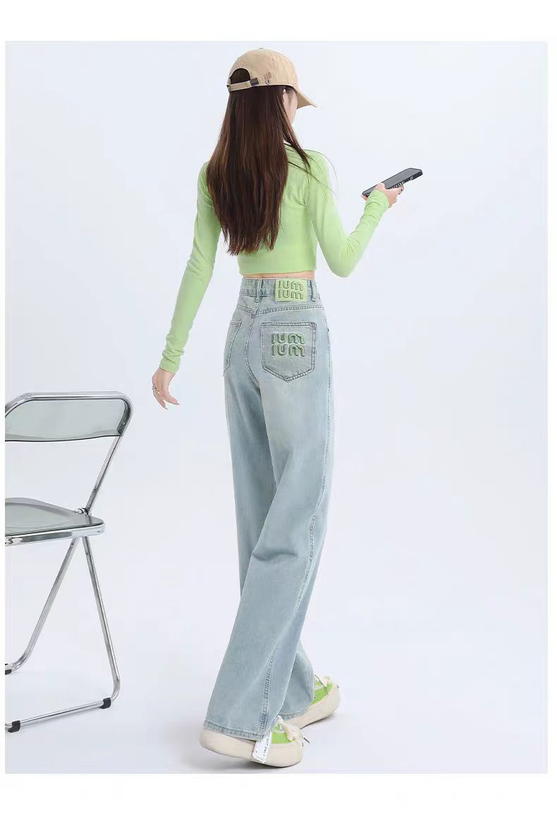 十三行薄荷绿刺绣高腰牛仔裤女2024夏季新款窄版直筒裤子显瘦阔腿