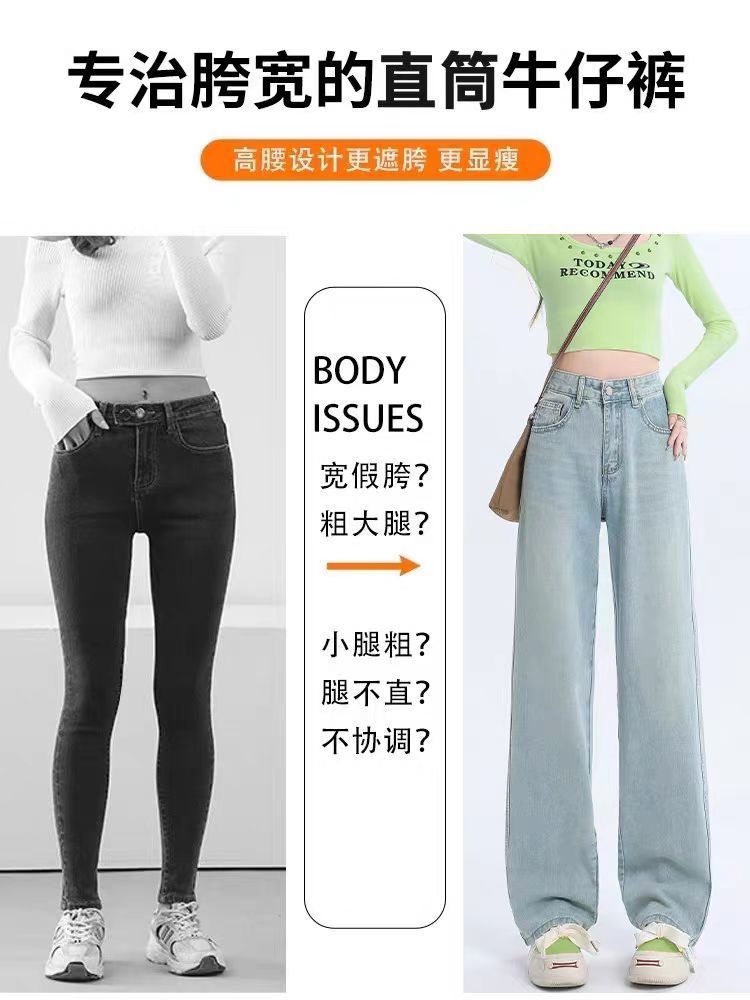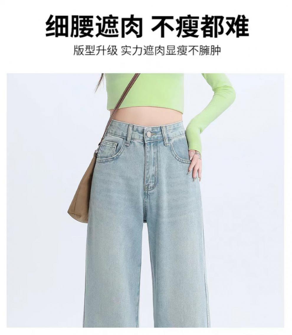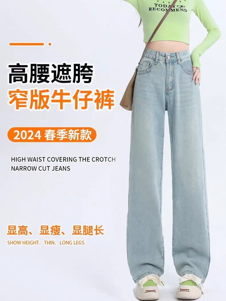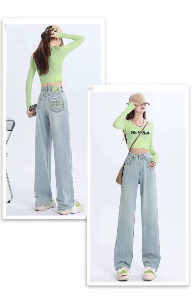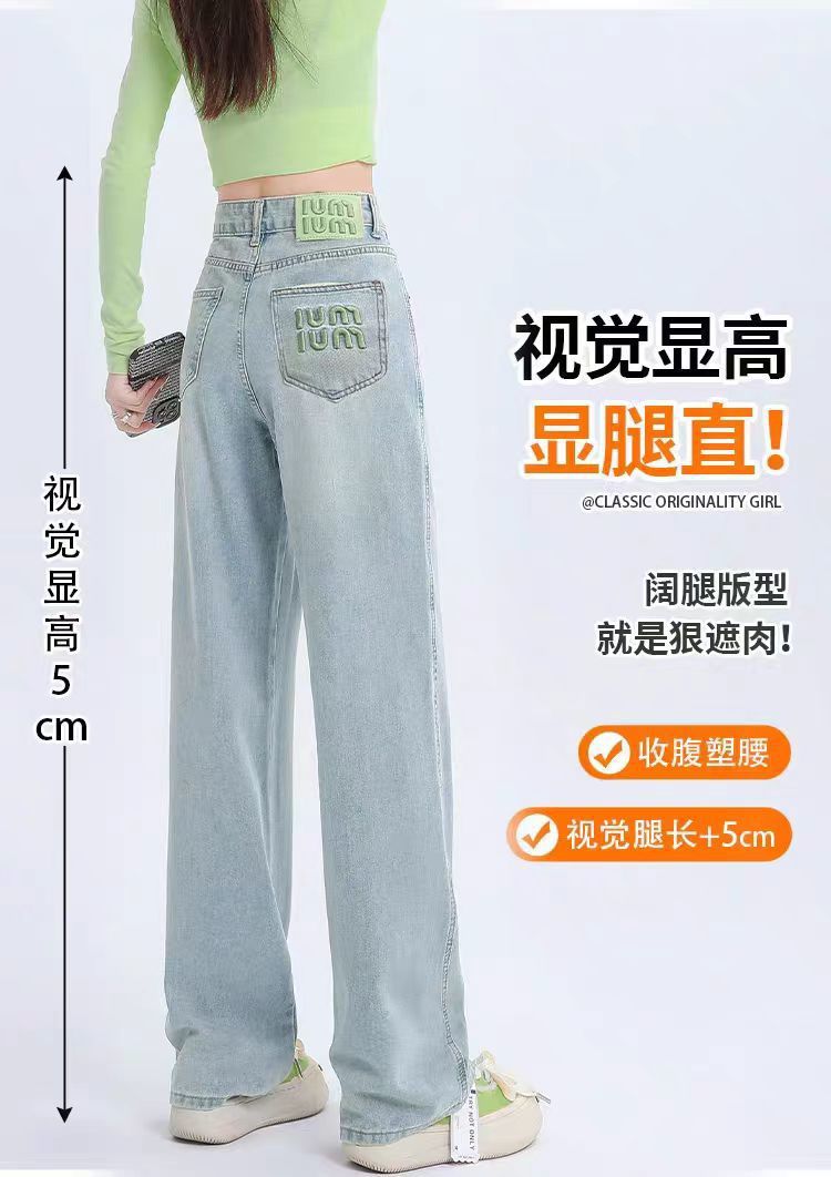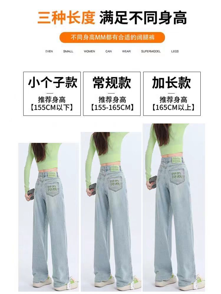 十三行薄荷绿刺绣高腰牛仔裤女2024夏季新款窄版直筒裤子显瘦阔腿