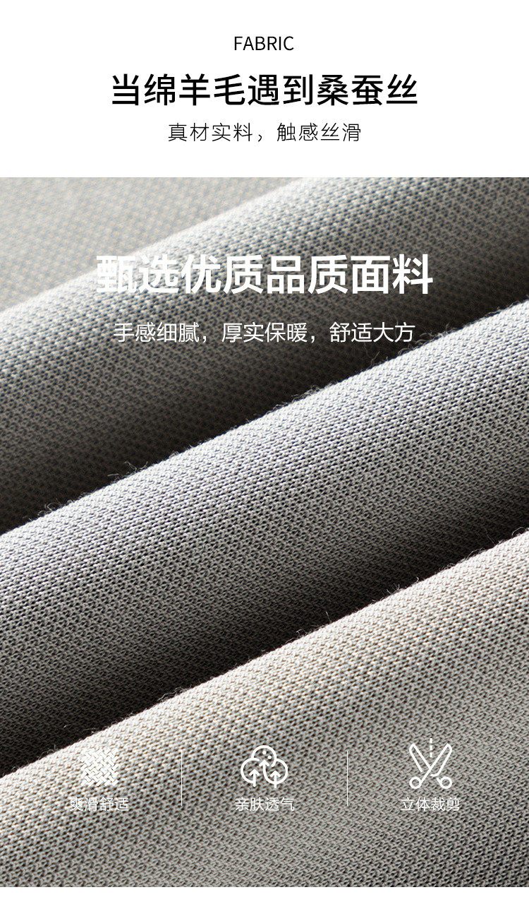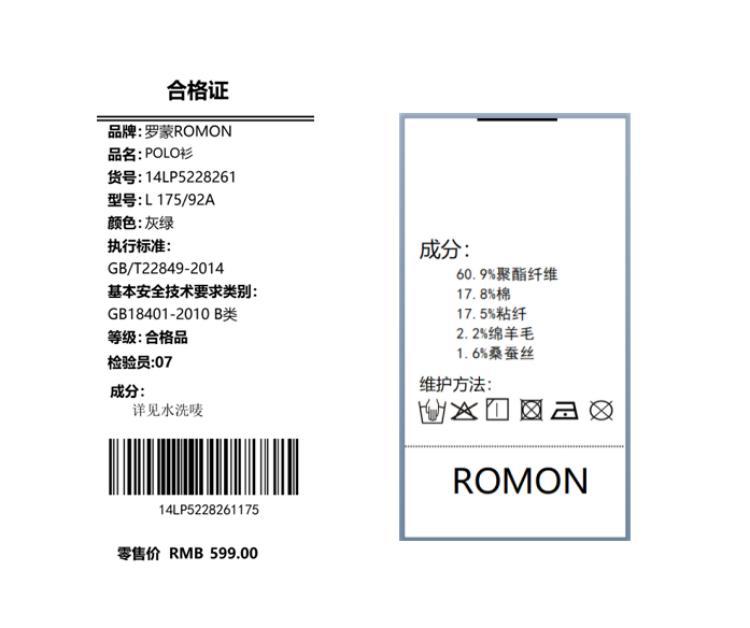面料:60.9%聚酯纤维 17.8%棉 17.5%粘纤 2.2%绵羊毛 1.6%桑蚕丝
