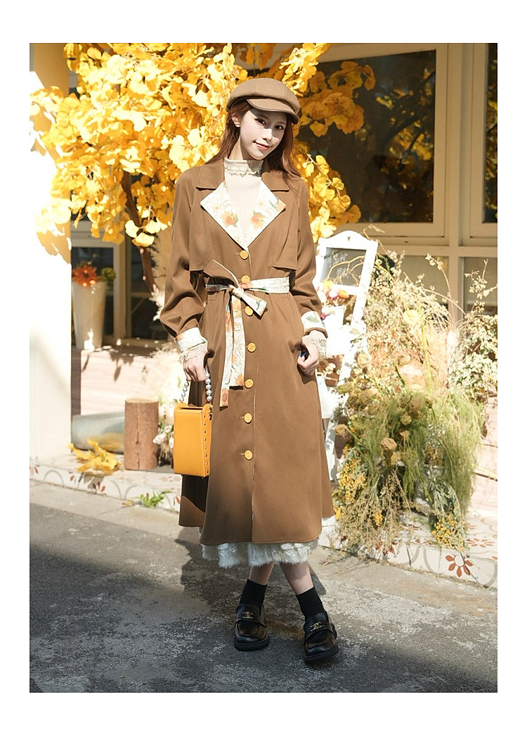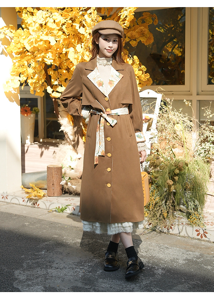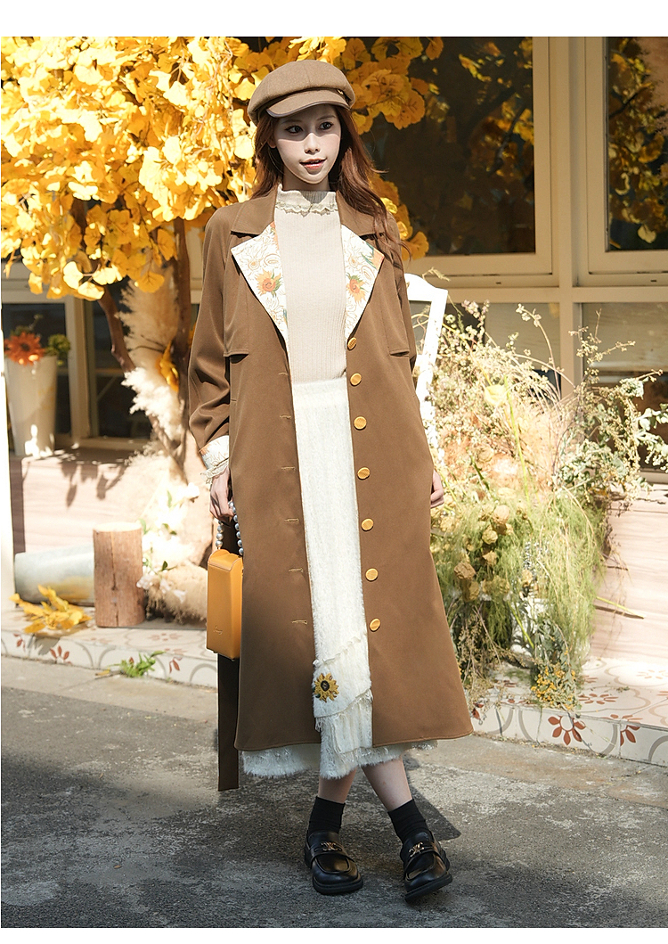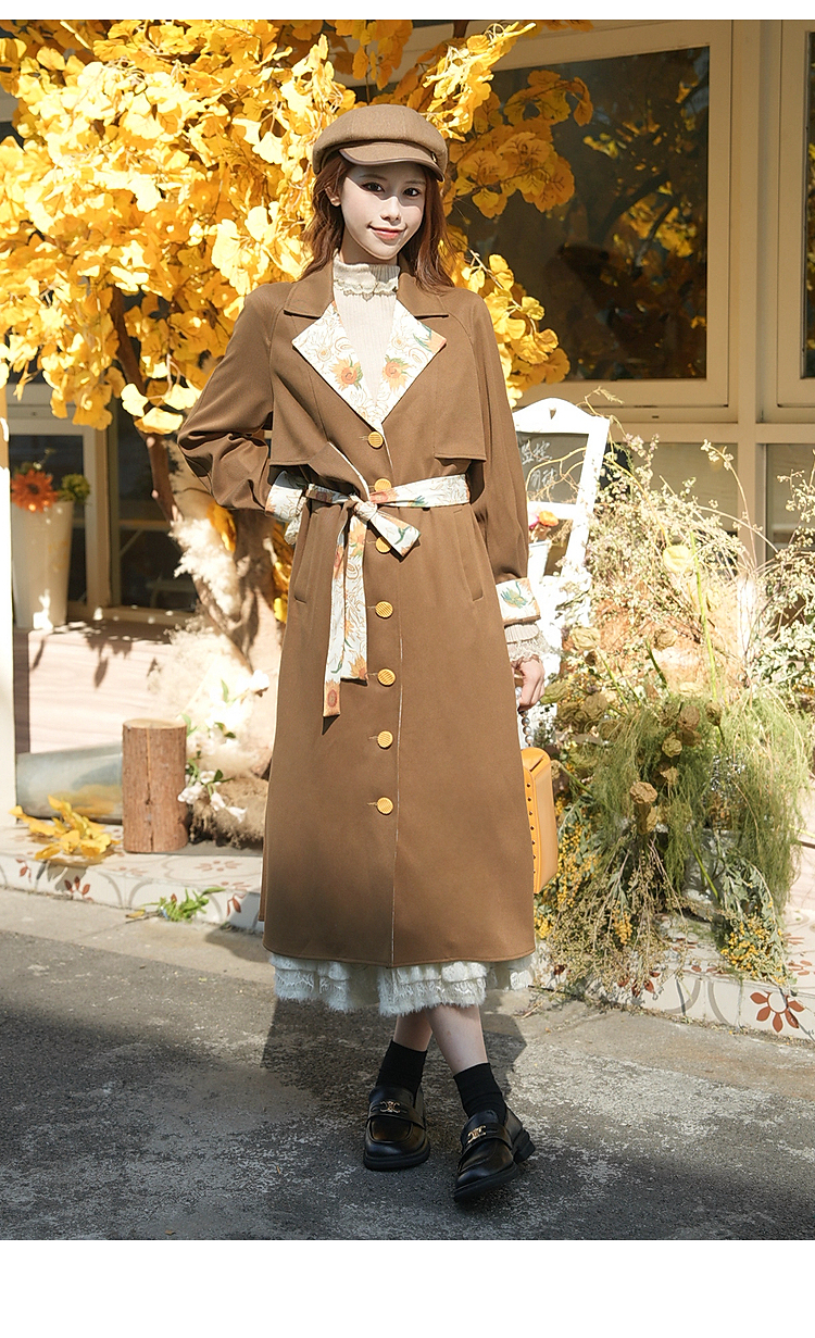 两三事梵高文艺大地诗行2025冬新款复古印花拼接绑带风衣外套女