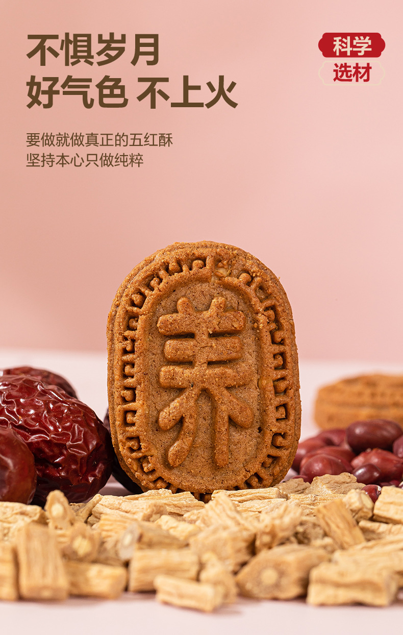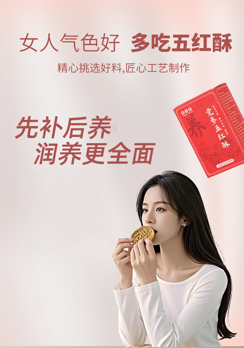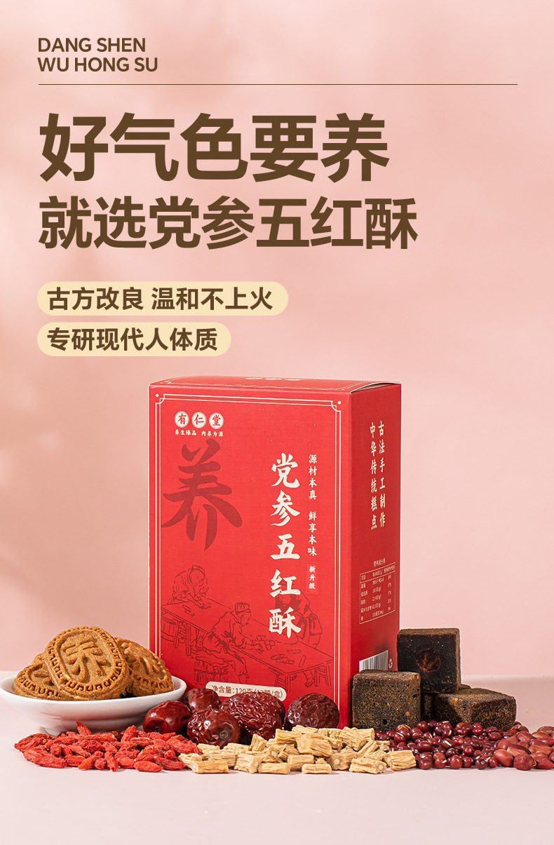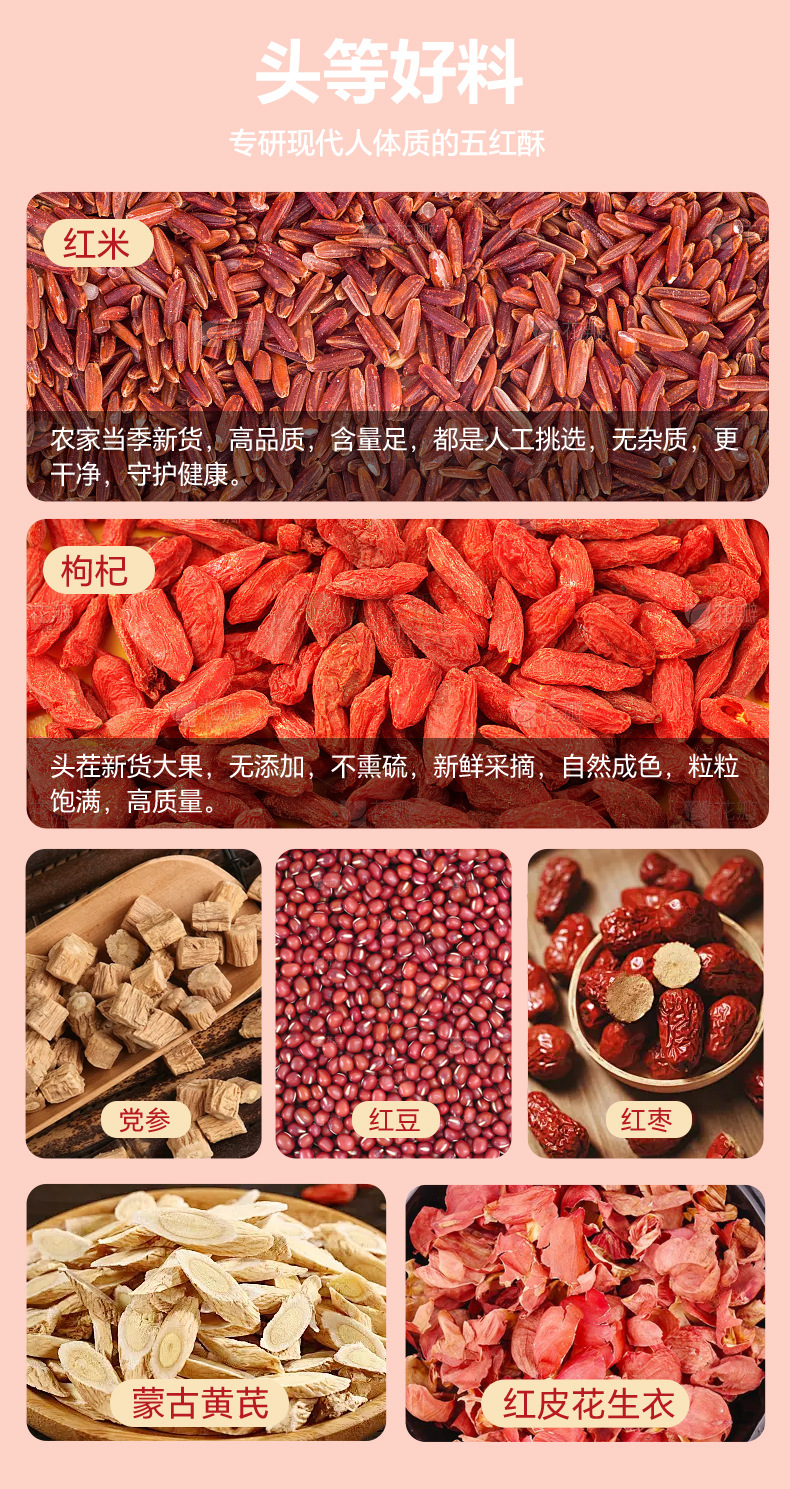 【以红养红!党参五红酥不单独添加蔗糖】甄选党参、蒙古黄芪、红豆、红枣、红皮花生衣、 红糖、红米、枸杞子等,全麦酥代餐双补女性月月舒五红汤