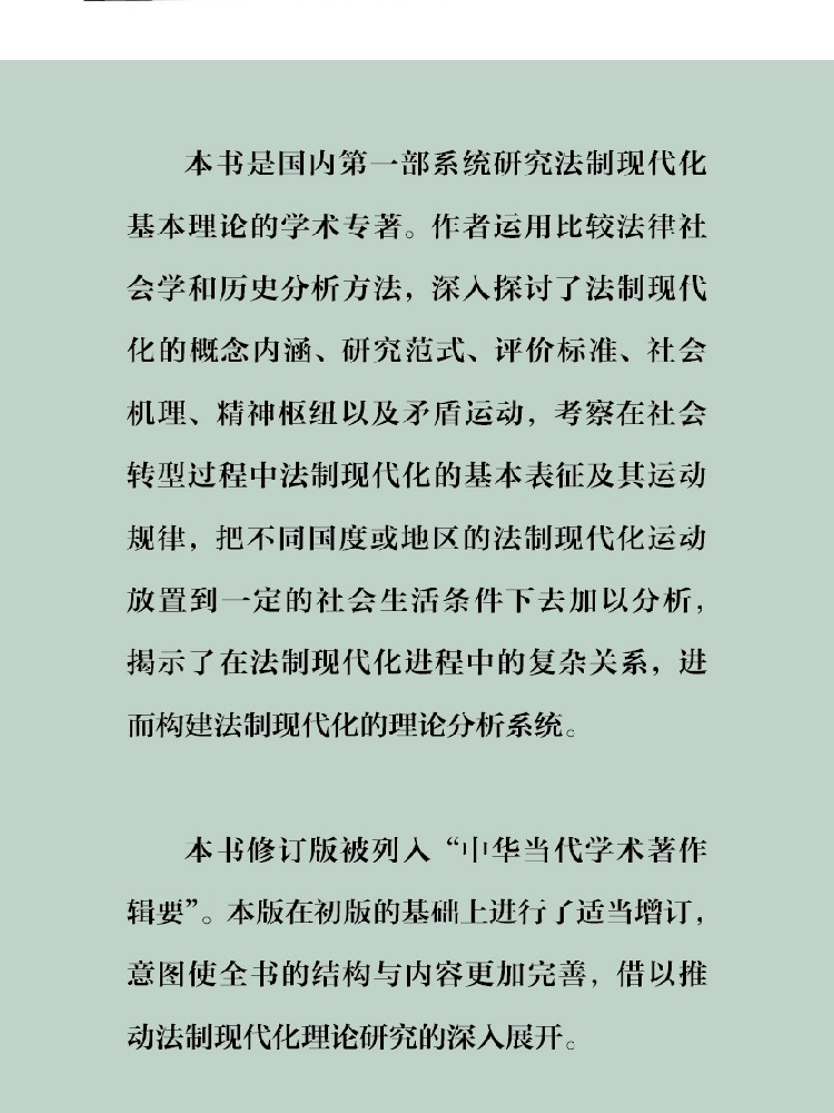 编辑推荐:本书是国内一部系统研究法制现代化基本理论的学术专著, 修订版被列入“中华当代学术著作辑要”。修订版在初版(中国政法大学出版社1999年版)的基础上进行了适当增订,意图使全书的结构与内容更加完善, 借以推动法制现代化理论研究的深入展开。