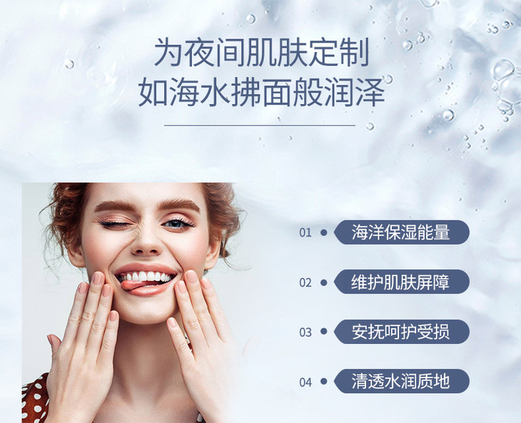 1、深海红藻提取物,海蓝*谜核心配方,修护一把好手,富含丰富微生物活性能量,有效激发面部细胞活力,刺激皮肤神经酰胺的合成,稳固角质层,强韧肌底,拯救熬夜暗沉脸,改善干燥、泛红现象!