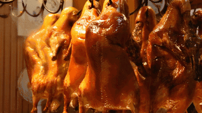 烤鸭出炉时色泽饱满