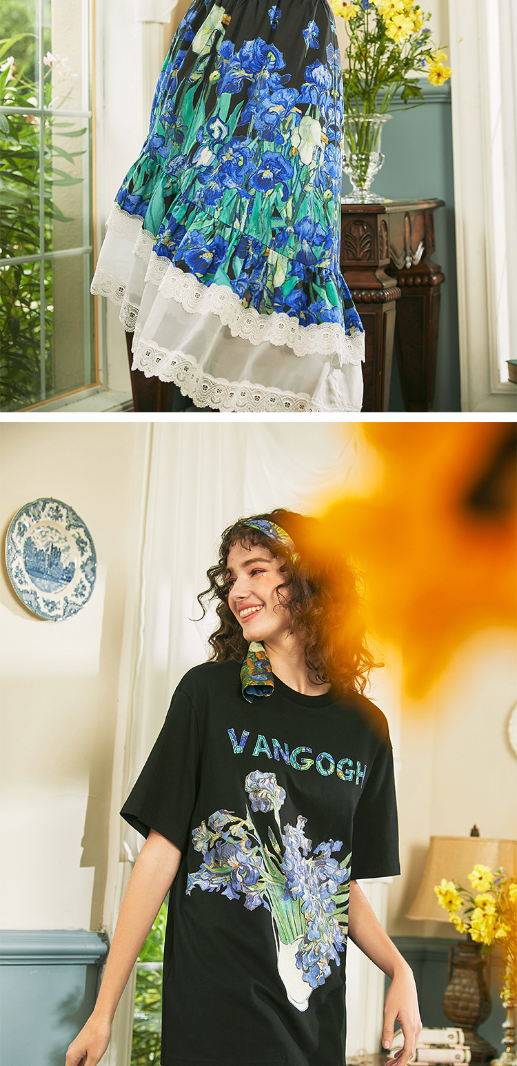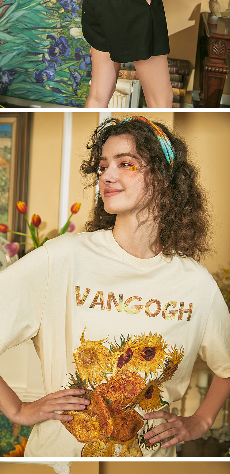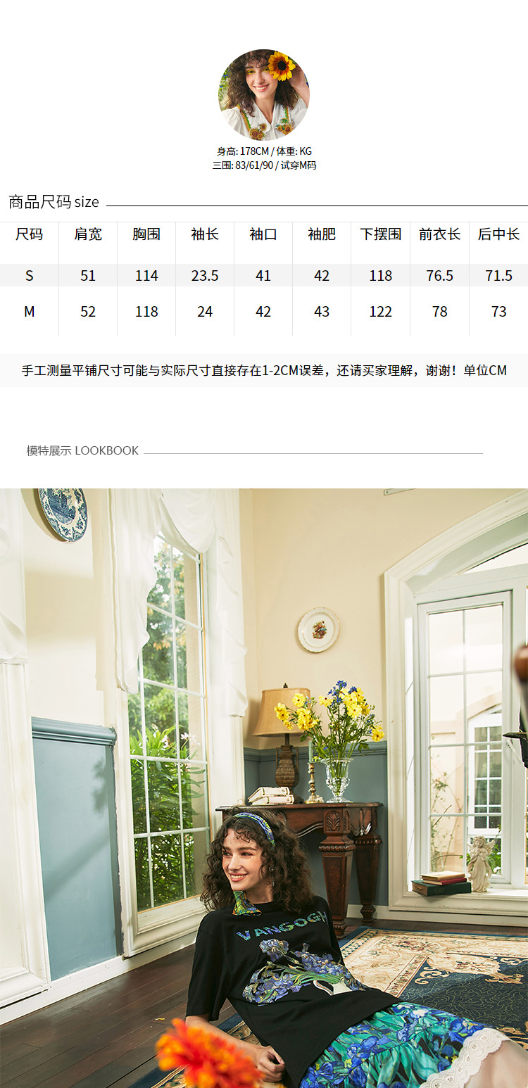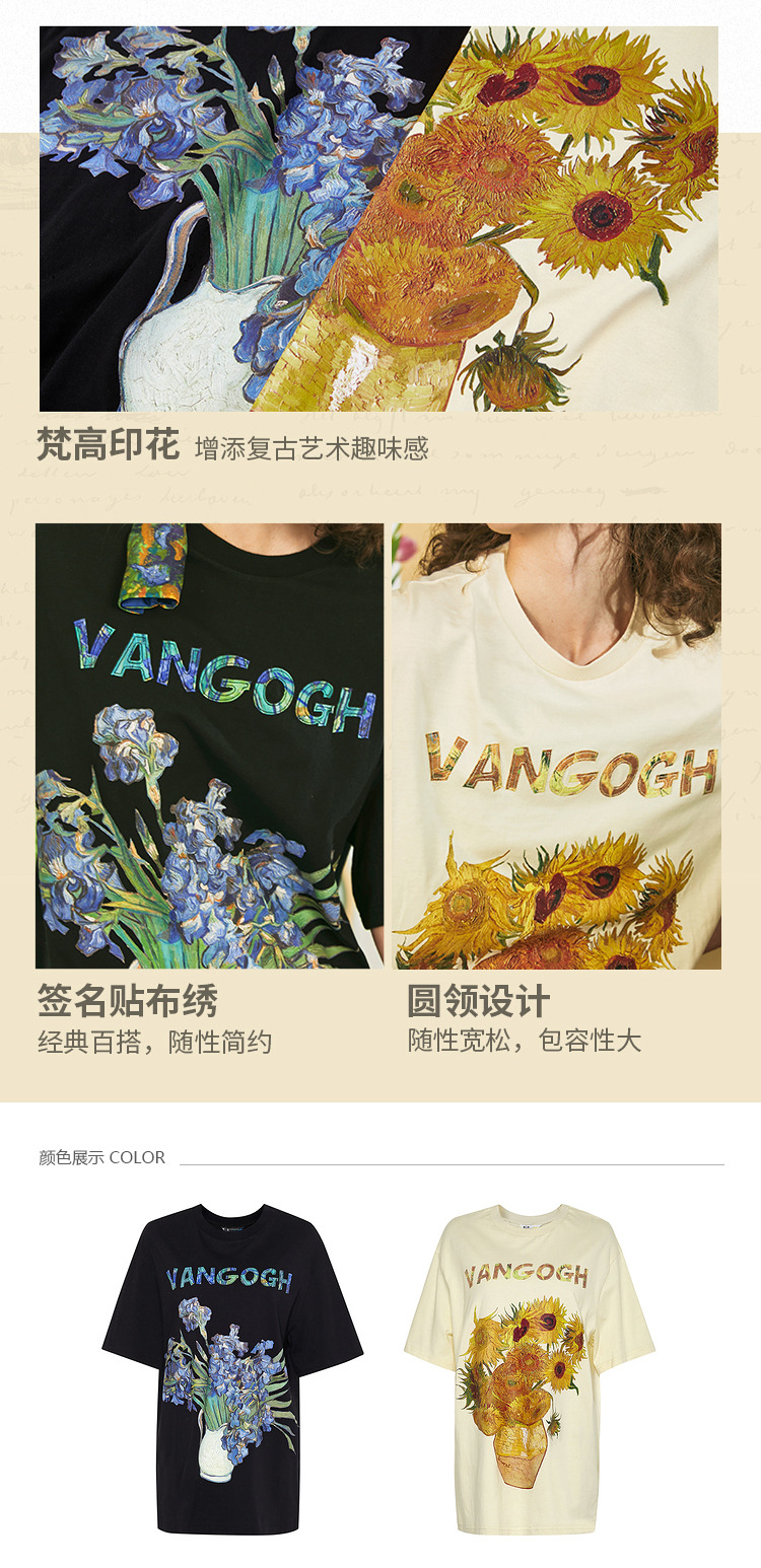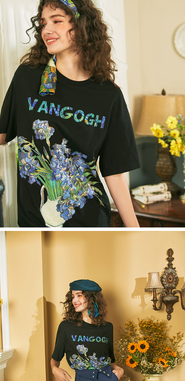 T恤 两三事梵高艺术花丛撒野夏新款短袖t恤女黑色设计感宽松上衣