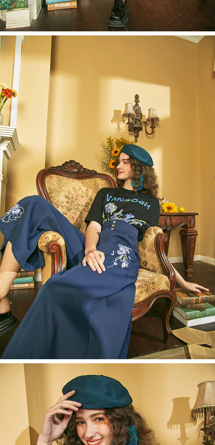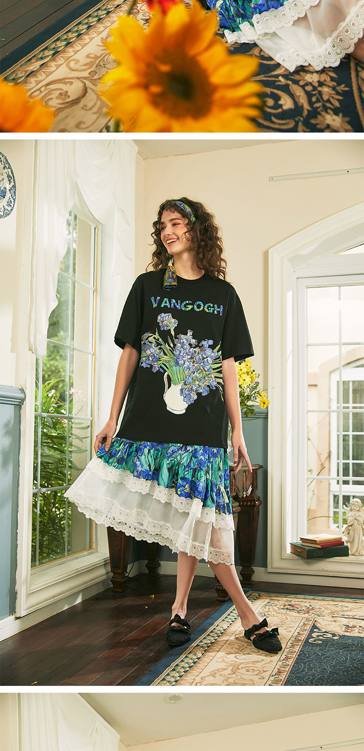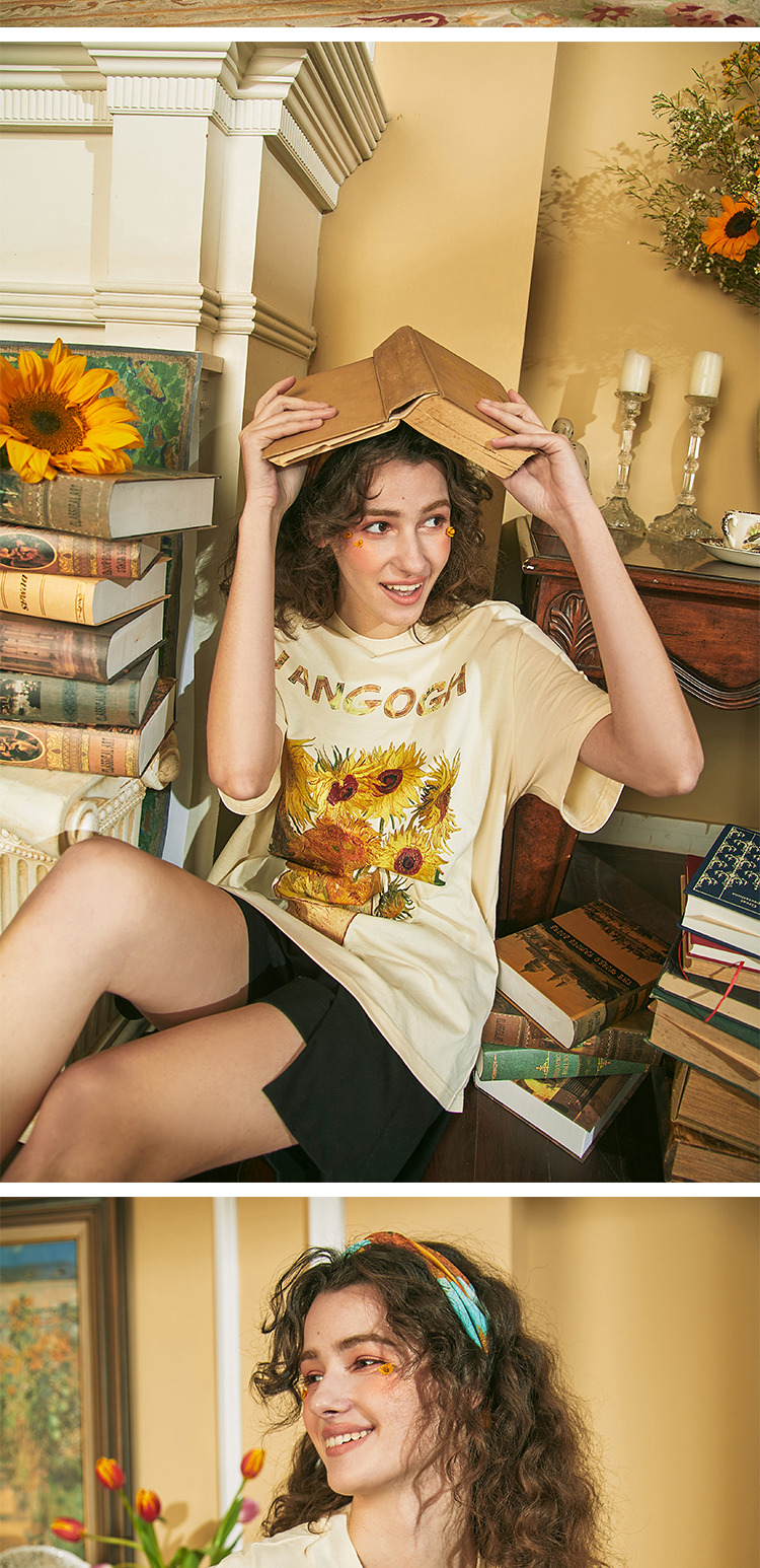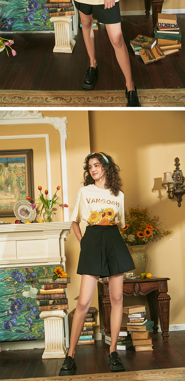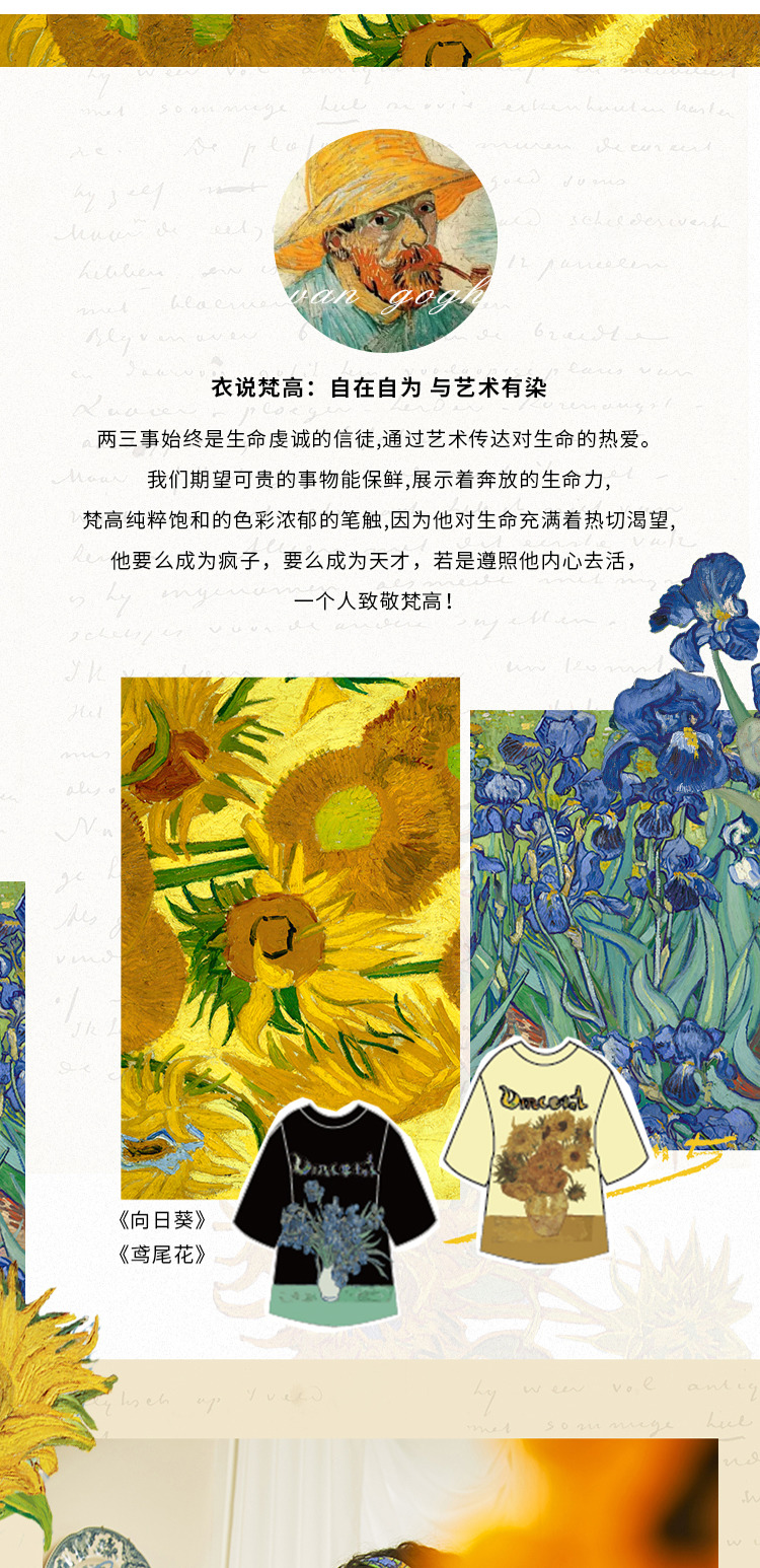 T恤 两三事梵高艺术花丛撒野夏新款短袖t恤女黑色设计感宽松上衣