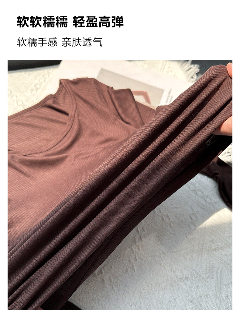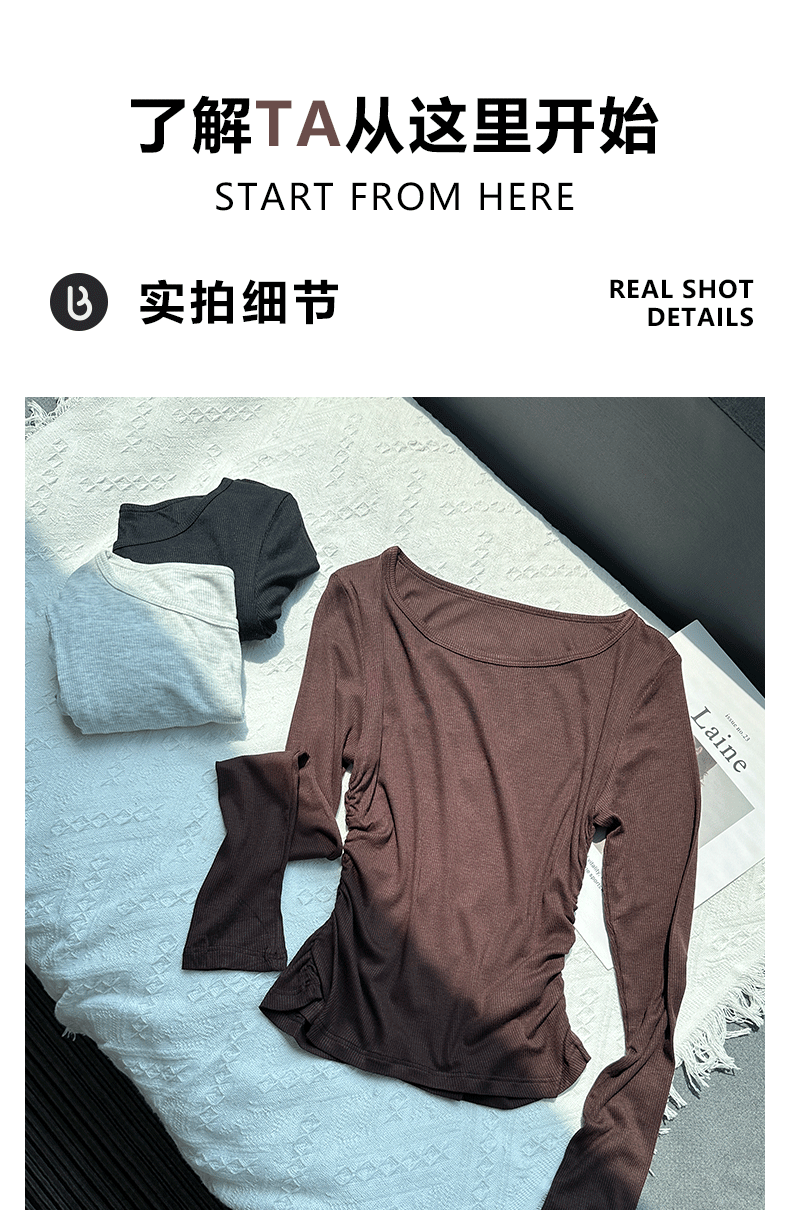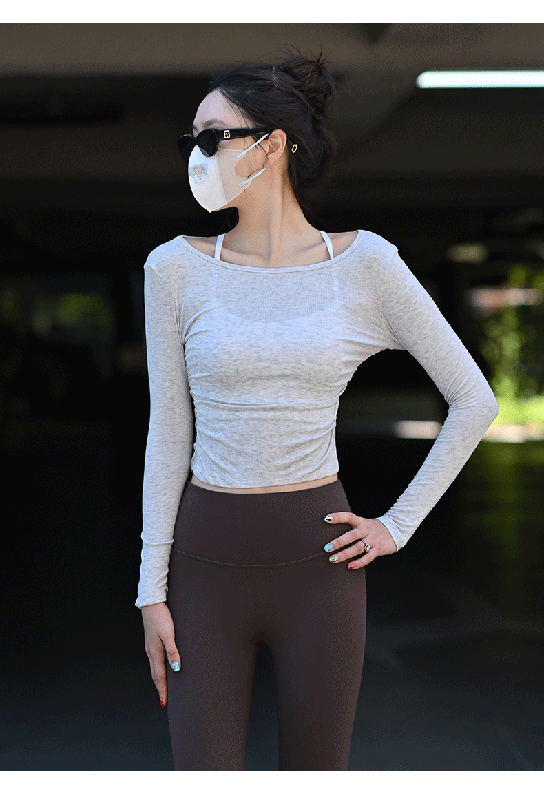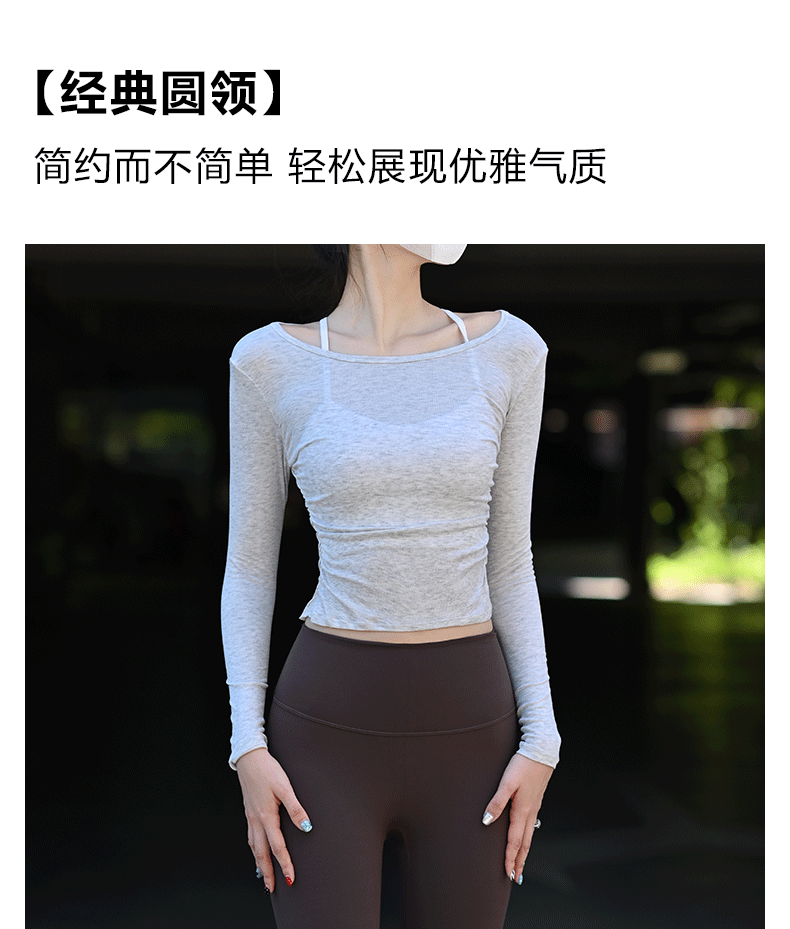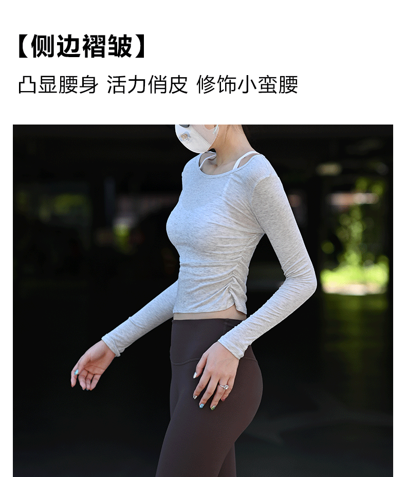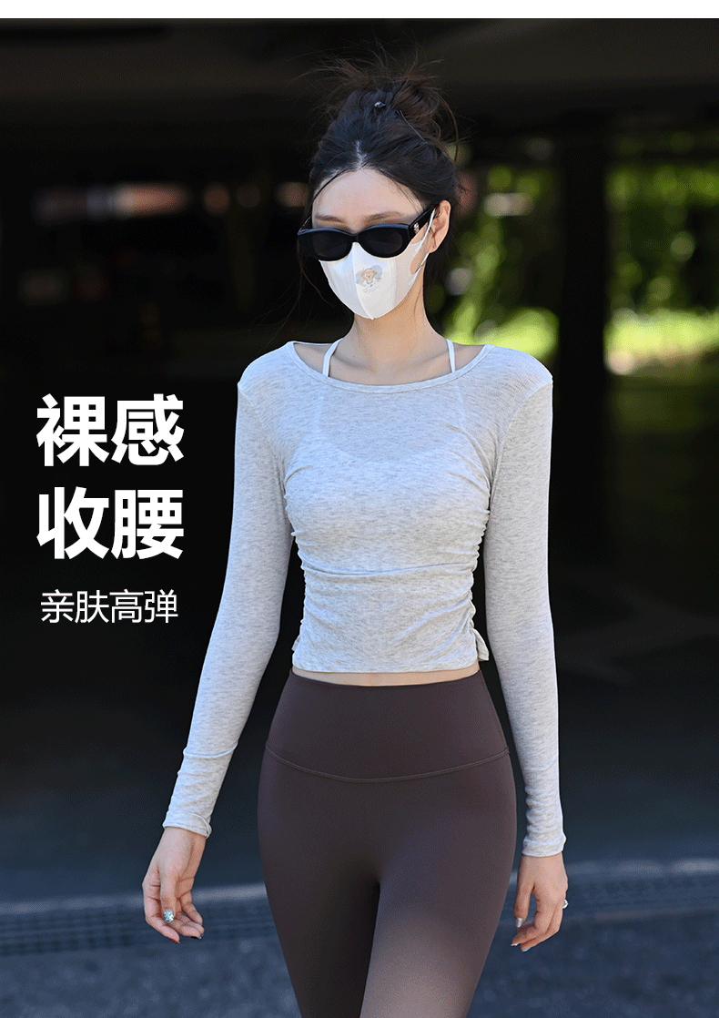 Beemen秋季新款莫代尔罗纹瑜伽长袖上衣女 腰部褶皱设计收腰修身显曲线 外穿运动瑜伽普拉提