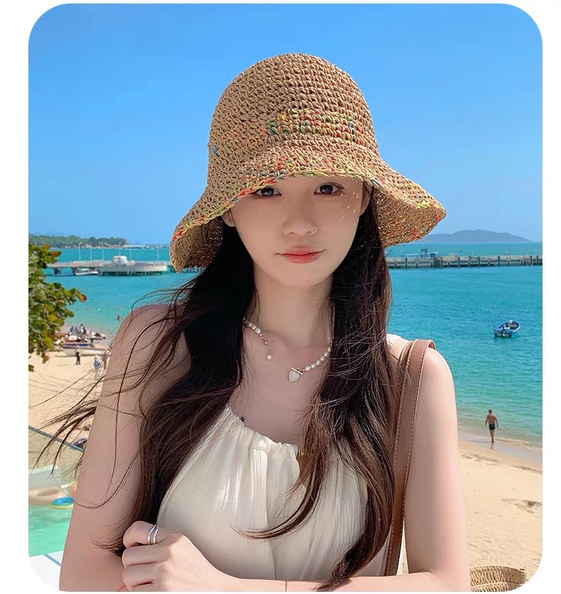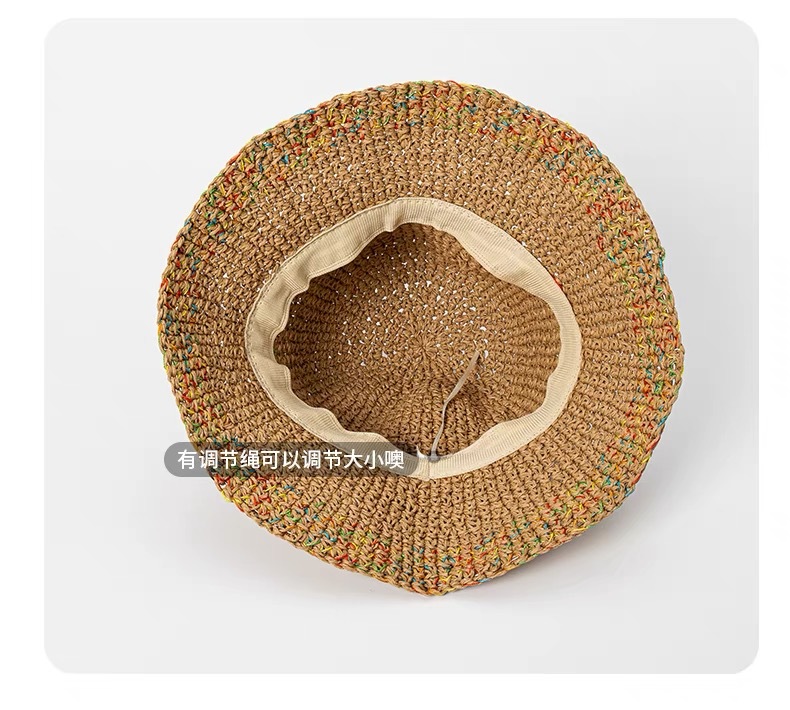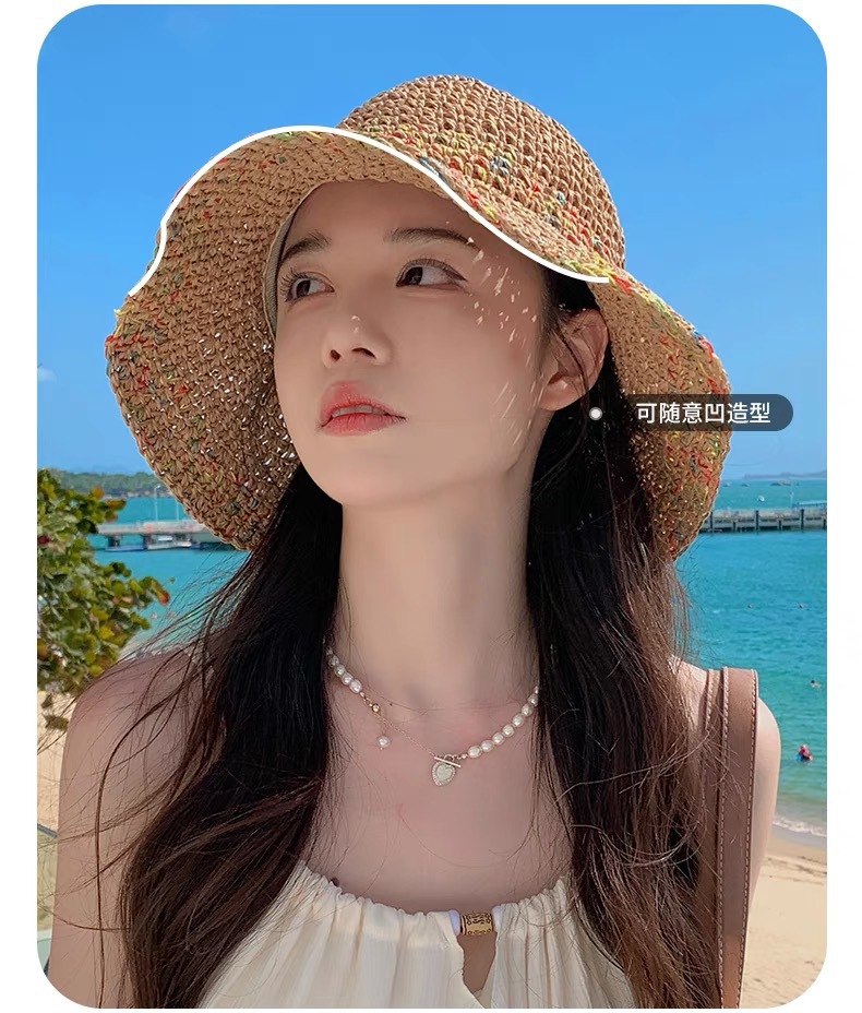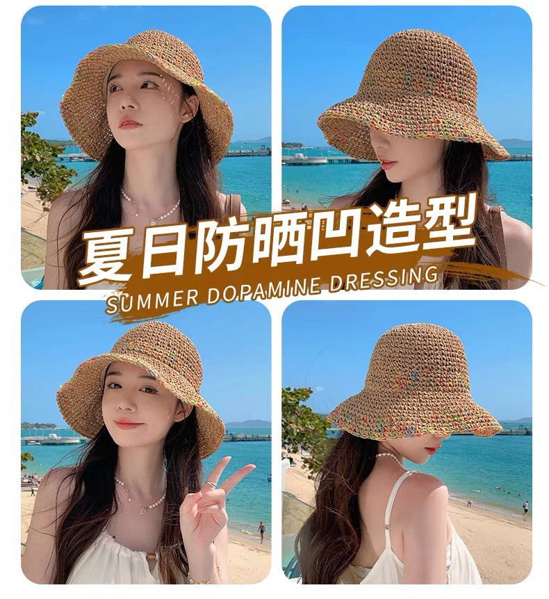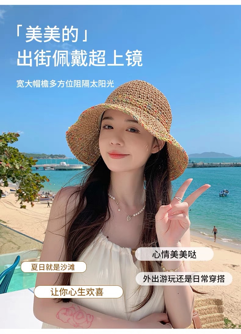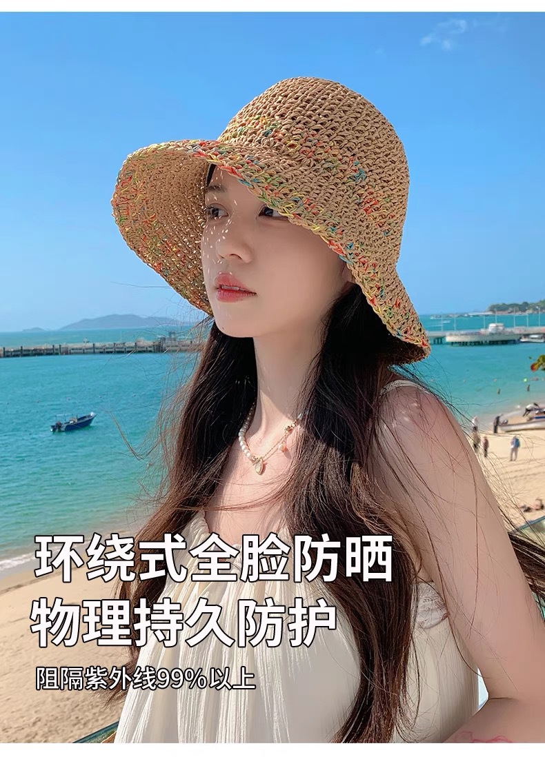 夏季镂空防晒遮阳帽透气沙滩帽彩色海边度假风宽檐编织渔夫草帽女