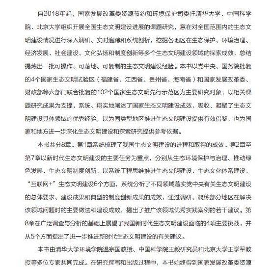 本书系统讲述新时代中国生态文明的建设成效以及最佳管理实践,为全国生态文明试点区域优化建设模式、其他地区加快探索生态文明机制体制改革,提供了一批可复制、可参考、可操作的优秀经验做法;为国家深化生态文明体制改革、推动美丽中国建设迈上新台阶,以及制定“十四五”期间生态文明建设的战略方向提供了决策参考;为各行各业的精英人才和社会公众深入掌握习近平生态文明思想和生态文明建设实践方法提供了学习培训教材,为促进形成全社会共建共享的新局面、加快推动国家治理体系和治理能力现代化作出积极的贡献。