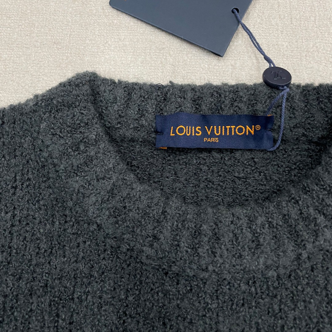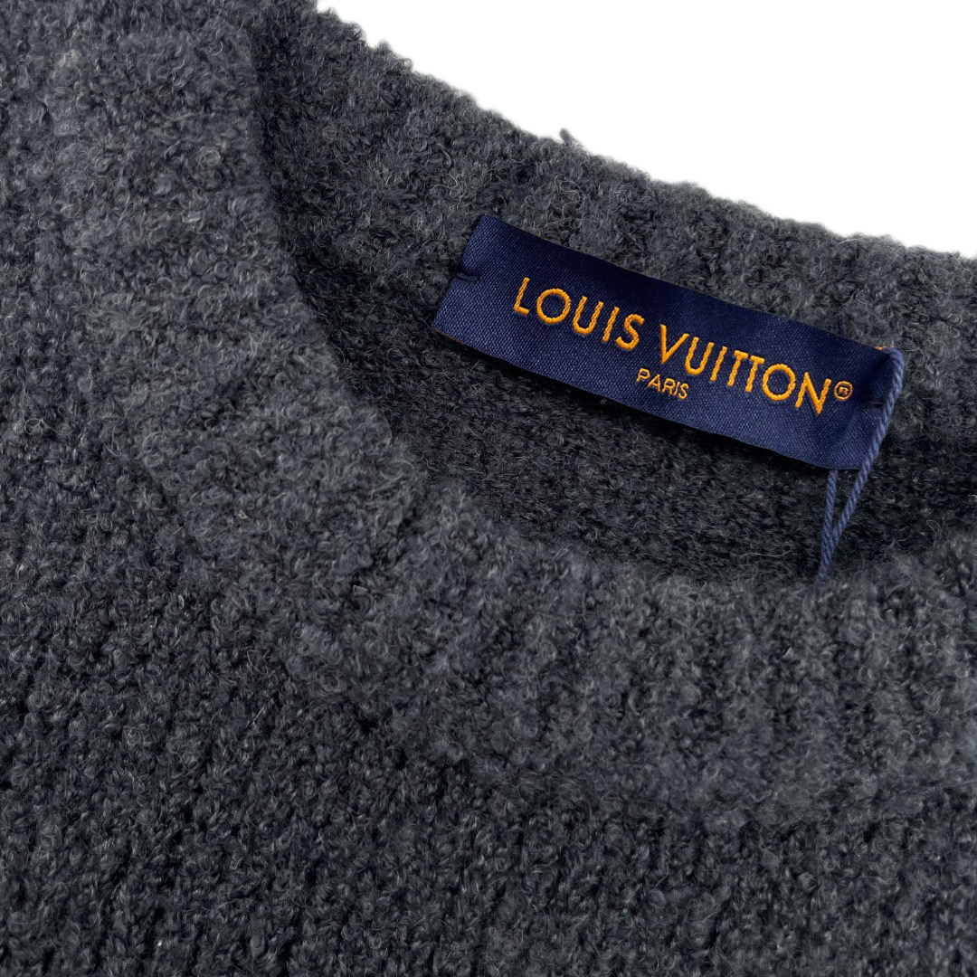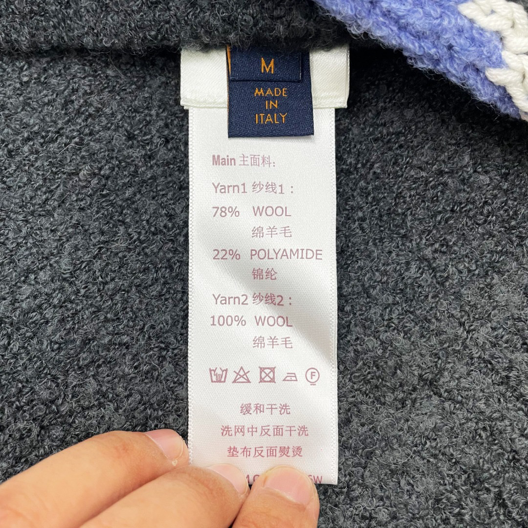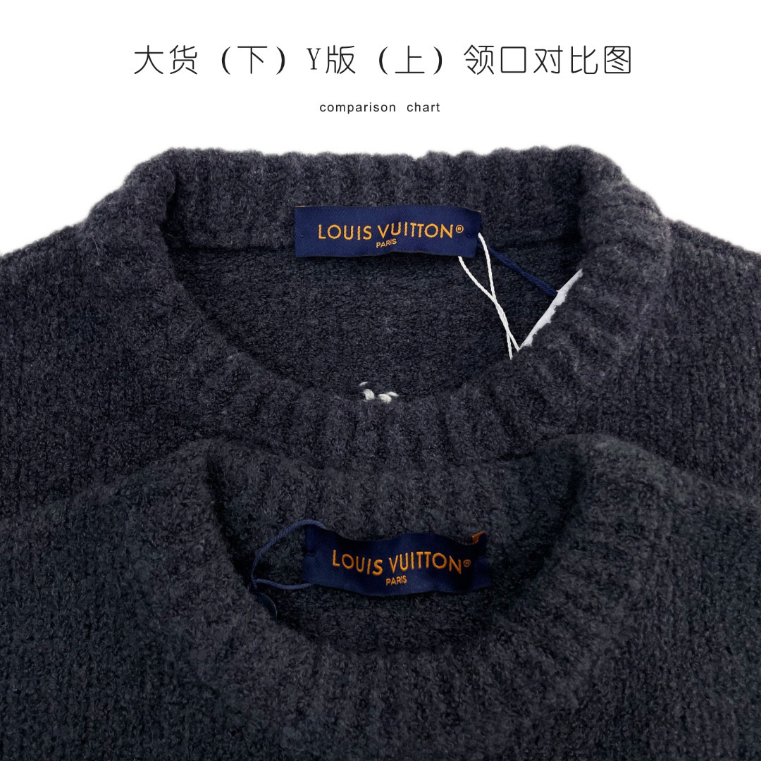 工艺说明:采用定制羊毛混纺面料,纱线定织定染,特殊水洗工艺非常酥软亲肤7针织工,胸前徽标嵌花的粗细每一针与ZP一致,后背为镜像嵌花,本款圆领衫取材绵羊毛和牦牛绒混纺,以厚实纱线营造舒柔质感,撞色LV标识融入针织,后部巧妙呈现镜像效果标识,定制辅料,三标齐全,男女同款!