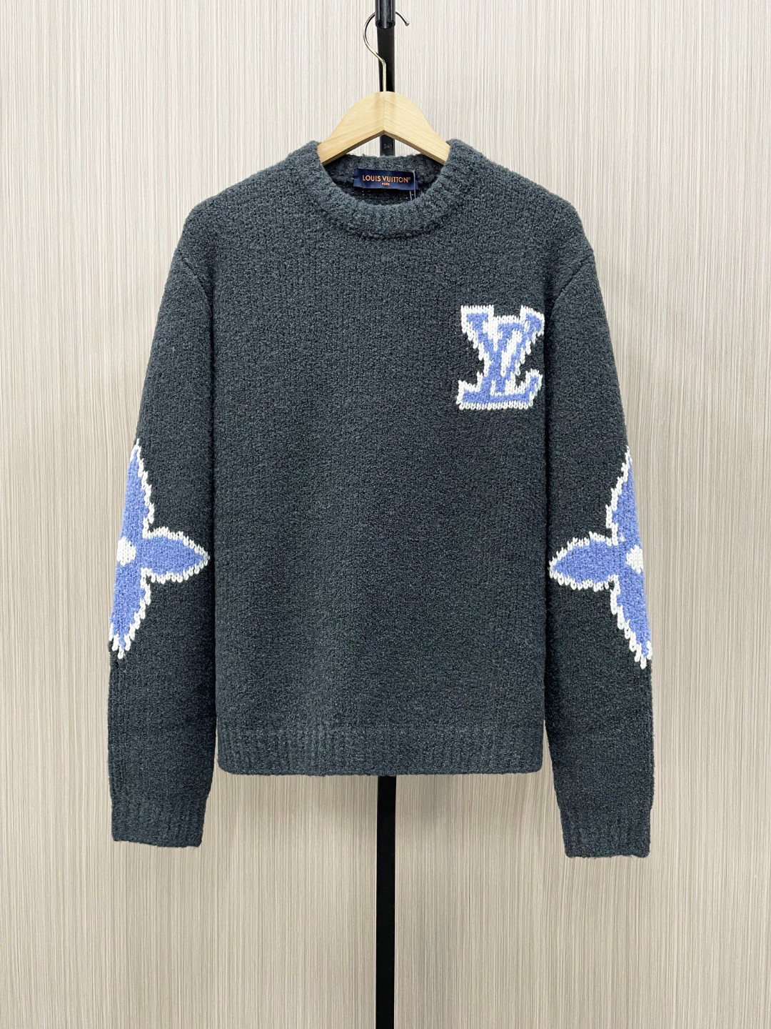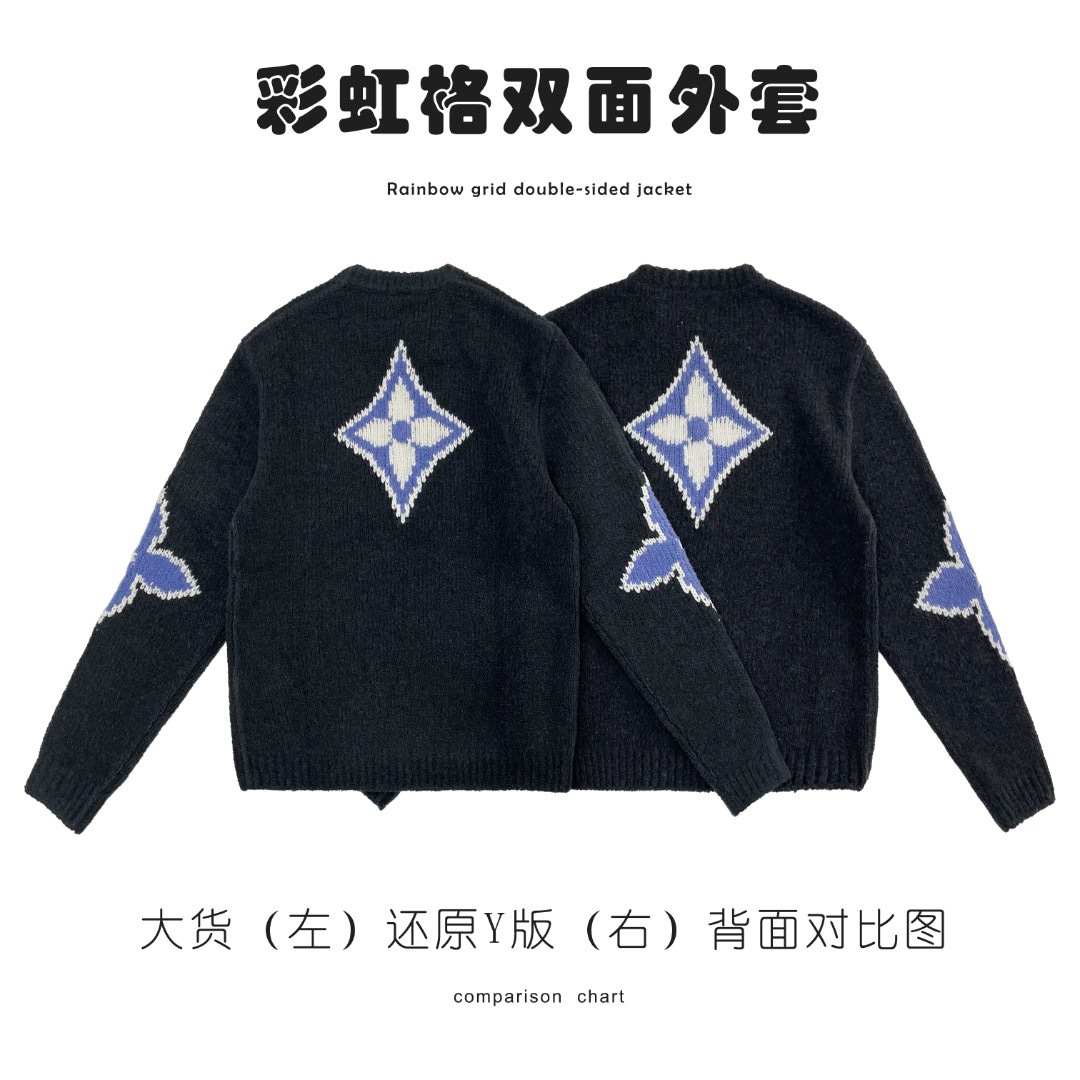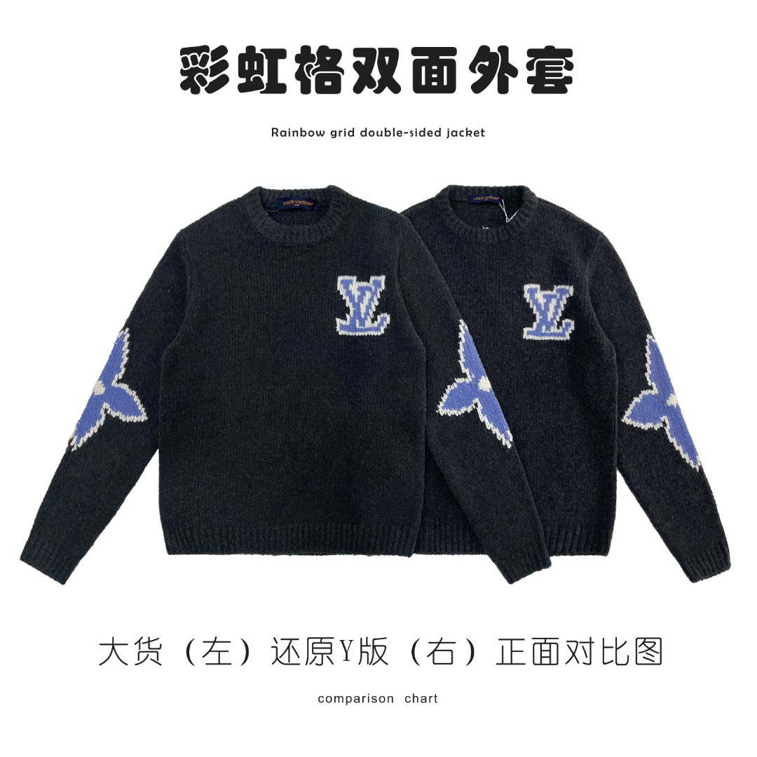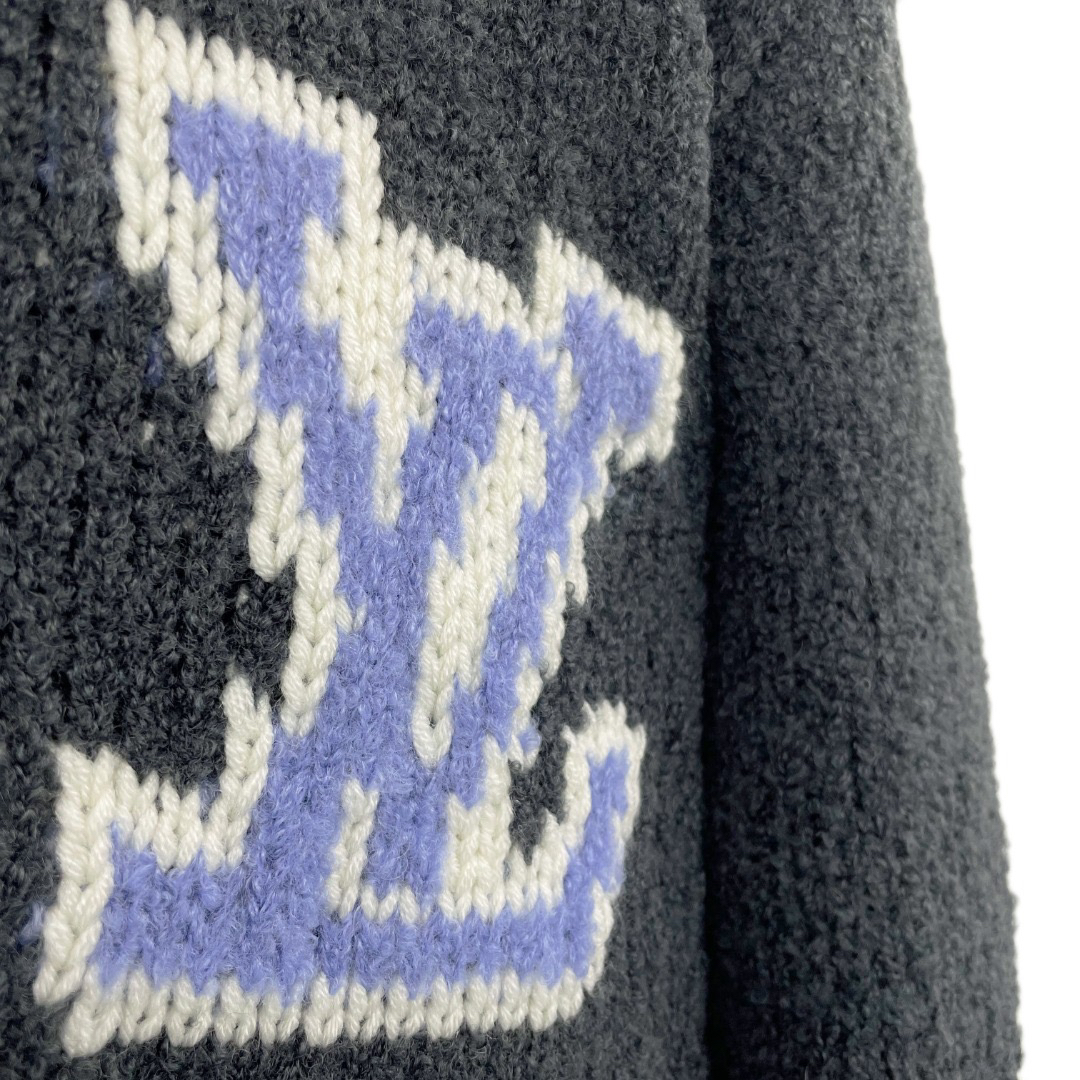 工艺说明:采用定制羊毛混纺面料,纱线定织定染,特殊水洗工艺非常酥软亲肤7针织工,胸前徽标嵌花的粗细每一针与ZP一致,后背为镜像嵌花,本款圆领衫取材绵羊毛和牦牛绒混纺,以厚实纱线营造舒柔质感,撞色LV标识融入针织,后部巧妙呈现镜像效果标识,定制辅料,三标齐全,男女同款!