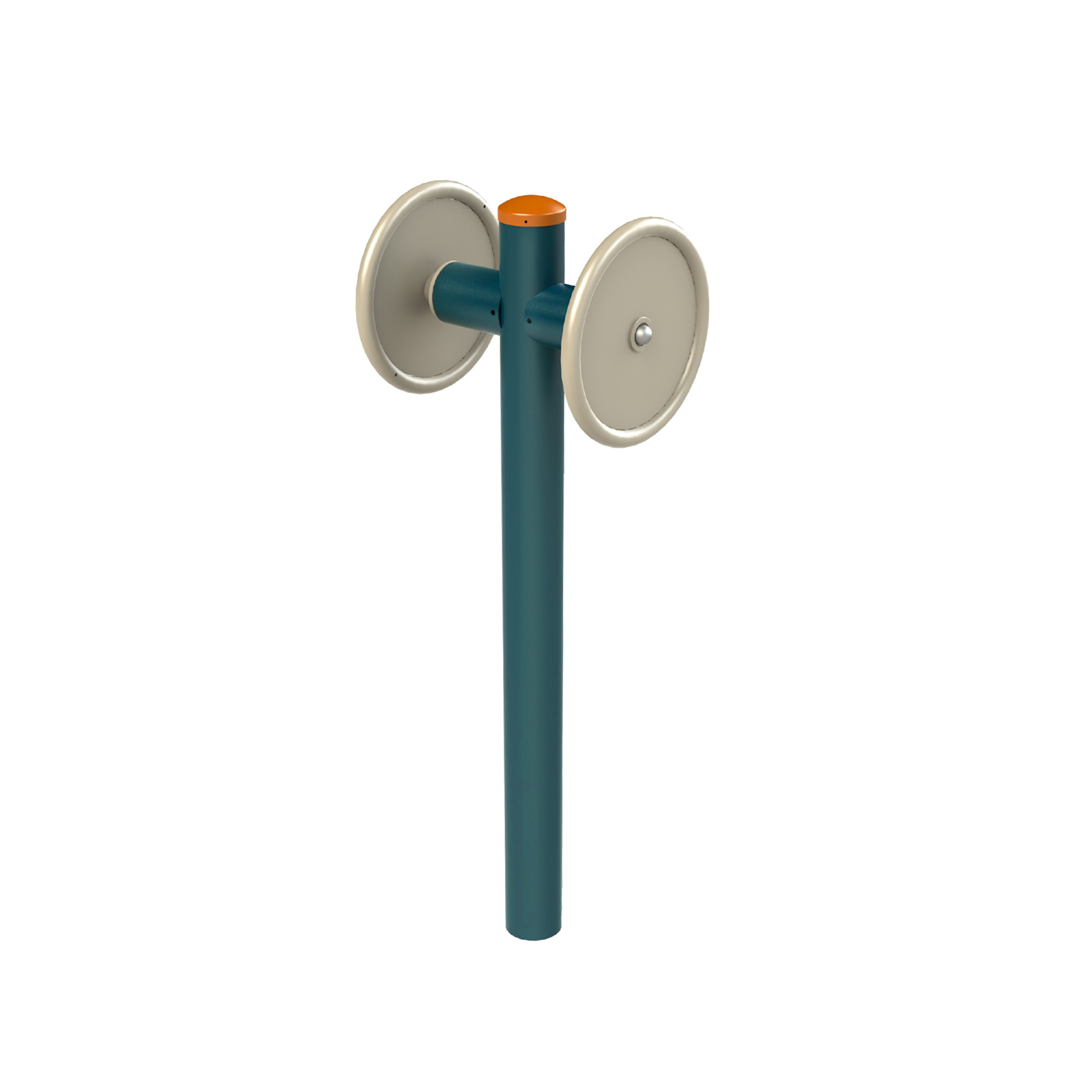 2、锻炼方法:两人分别在转轮两侧向对方相反的用力方向推动转轮边缘,以相互较力锻炼上臂肌肉。