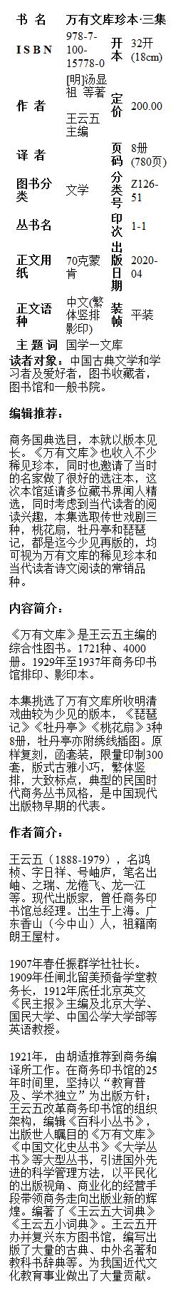 万有文库珍本·三集 (繁体竖排影印) [明]汤显祖 等著 王云五 主编 商务印书馆