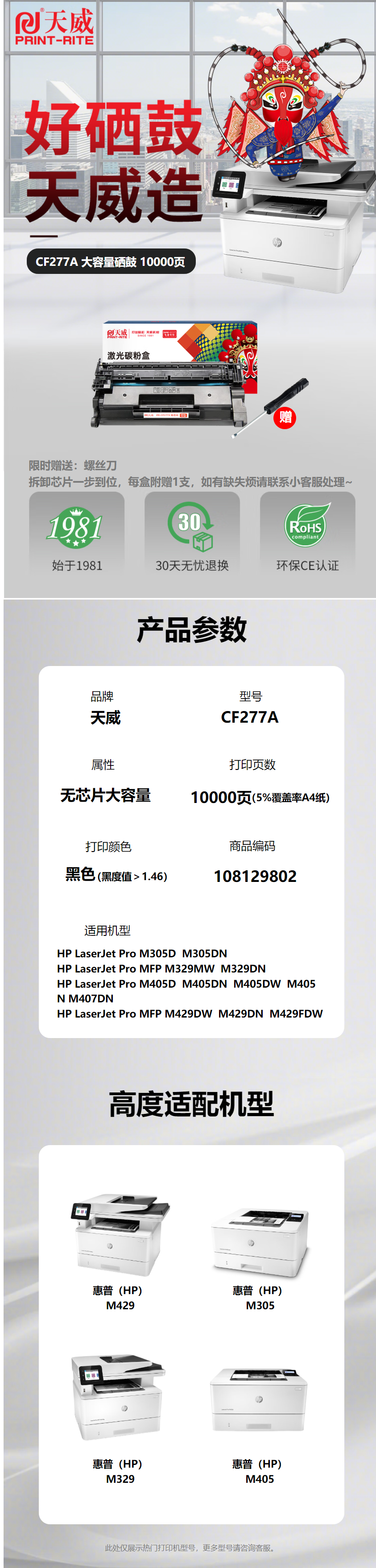 天威cf277a硒鼓 适用惠普329dw硒鼓 405d 329dw 305dn 329dn 405dw 429fdw 惠普77a墨粉硒鼓大容量无芯片