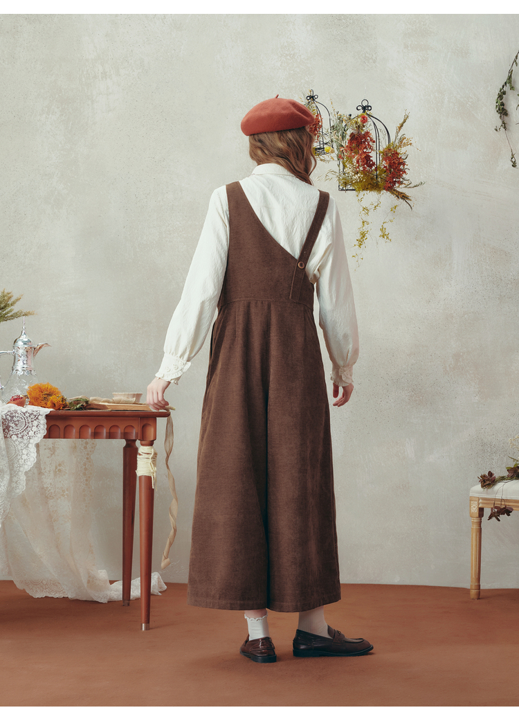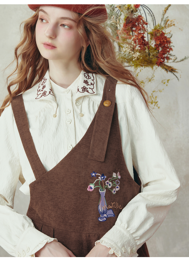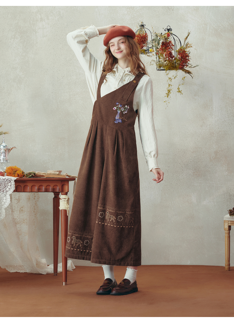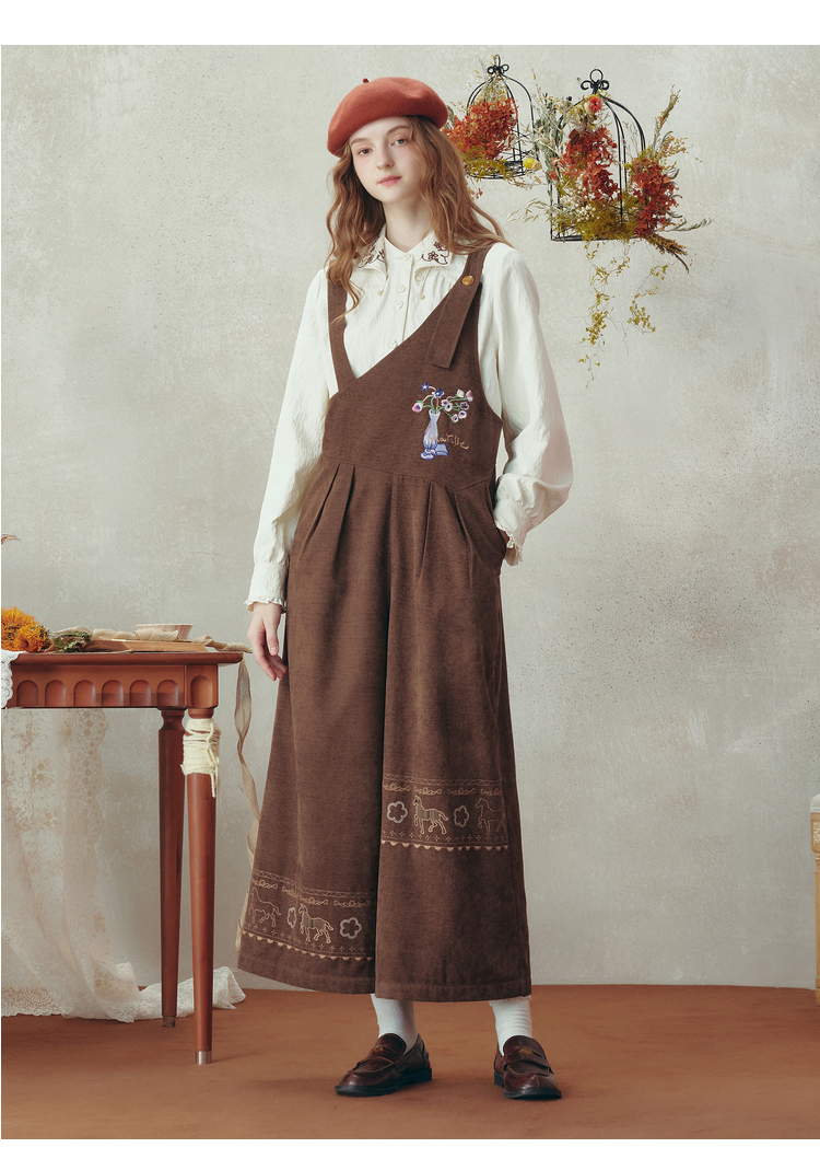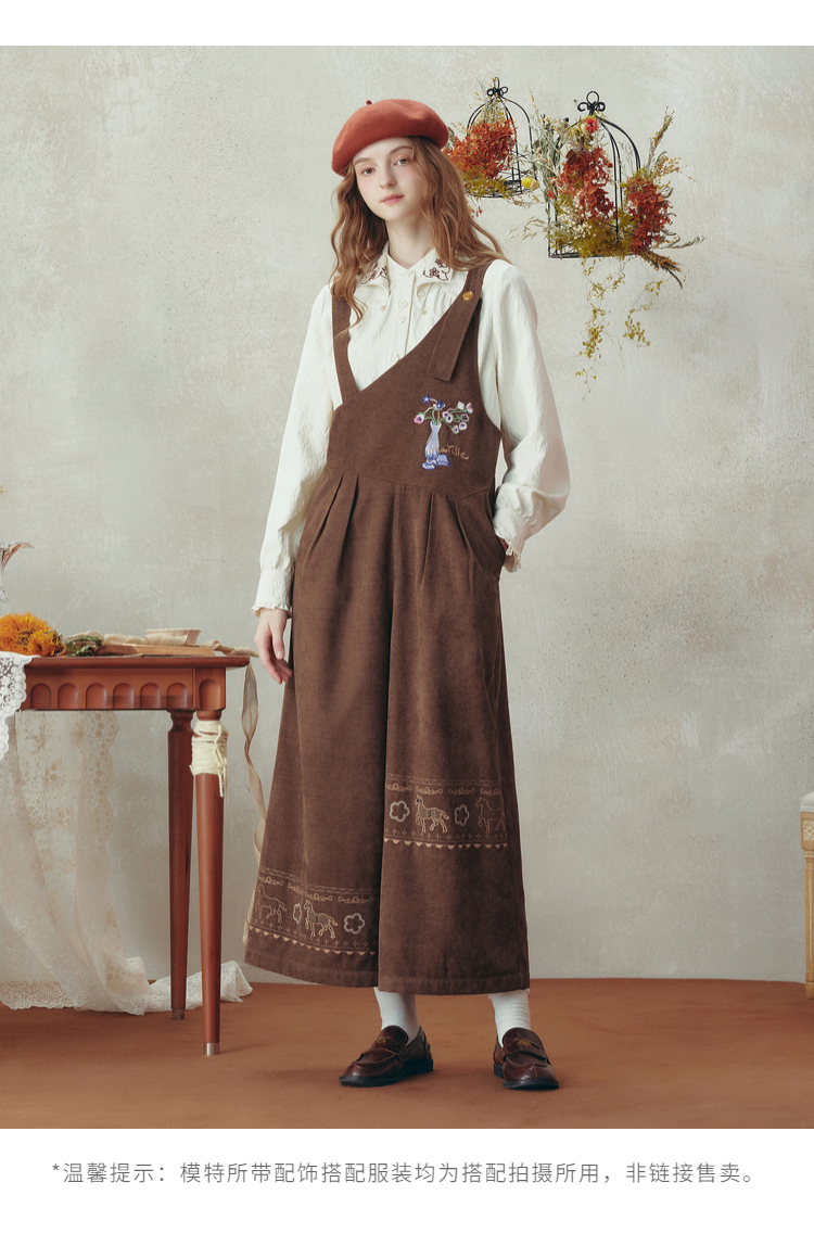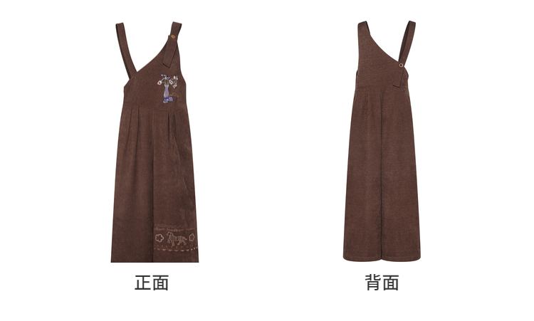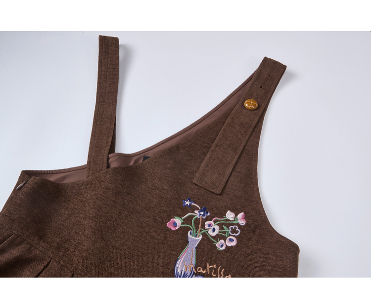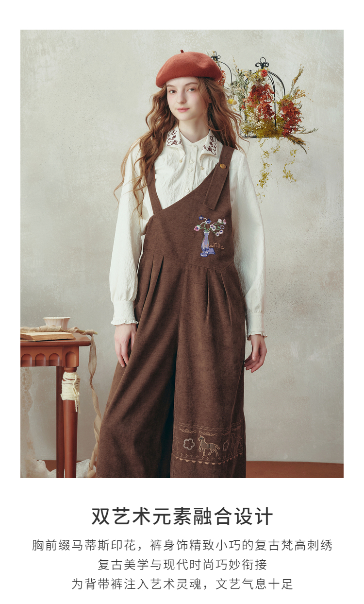 两三事梵高文艺 落日回音 2025冬季新款森女风刺绣不对称背带裤女