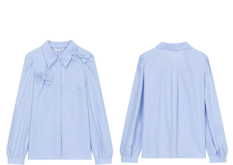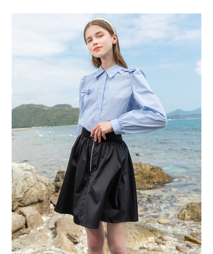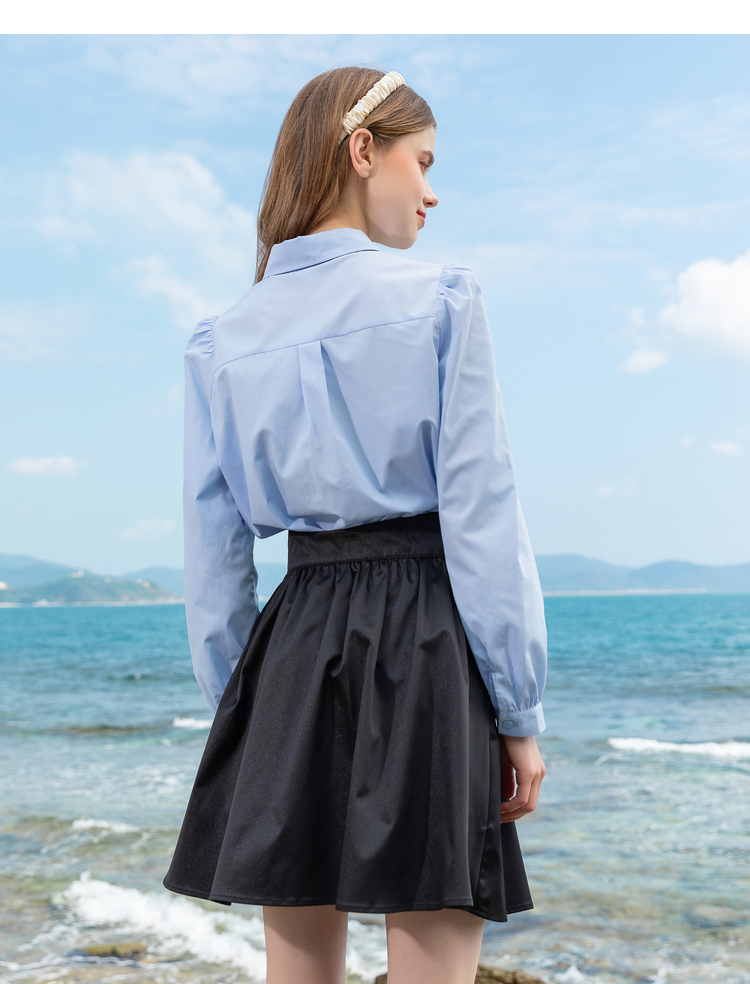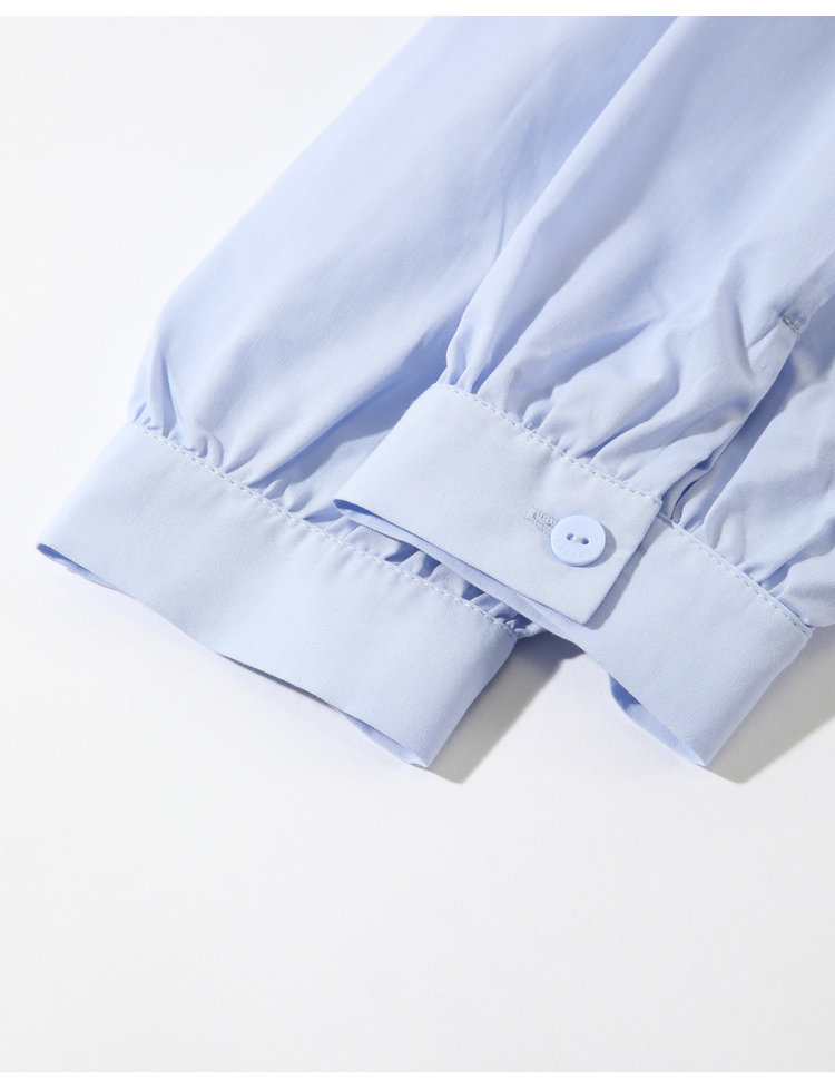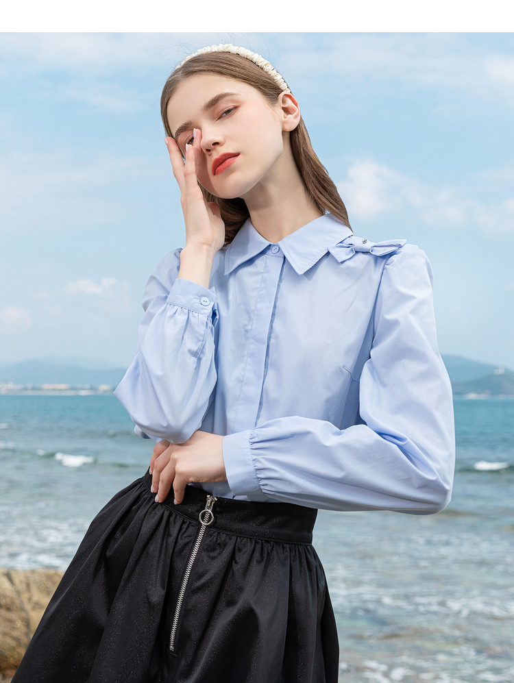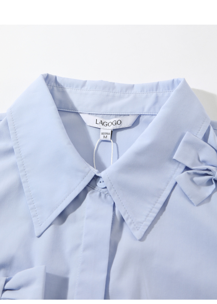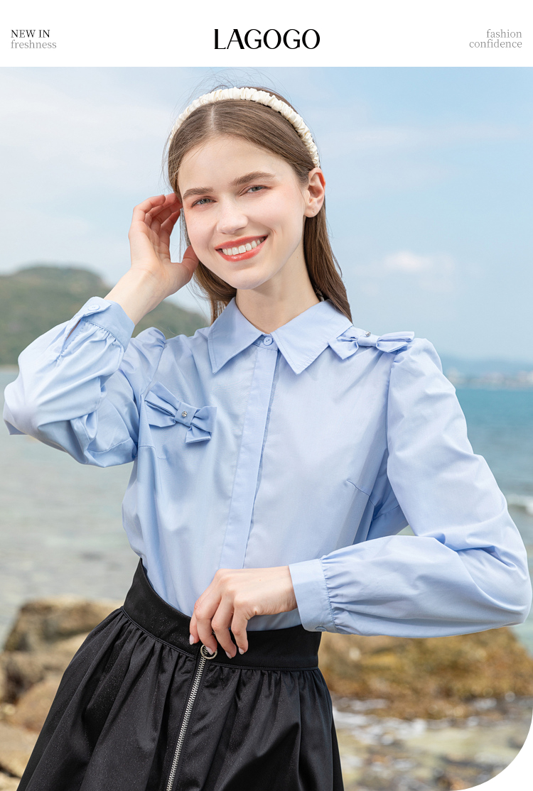 Lagogo拉谷谷2022春季新款翻领蝴蝶结泡泡袖衬衫女长袖浅蓝色上衣LACC432C21