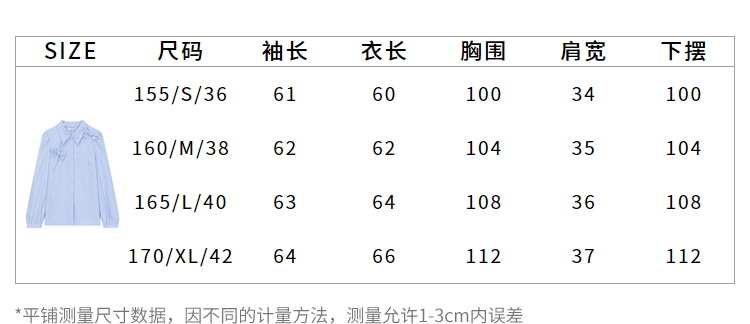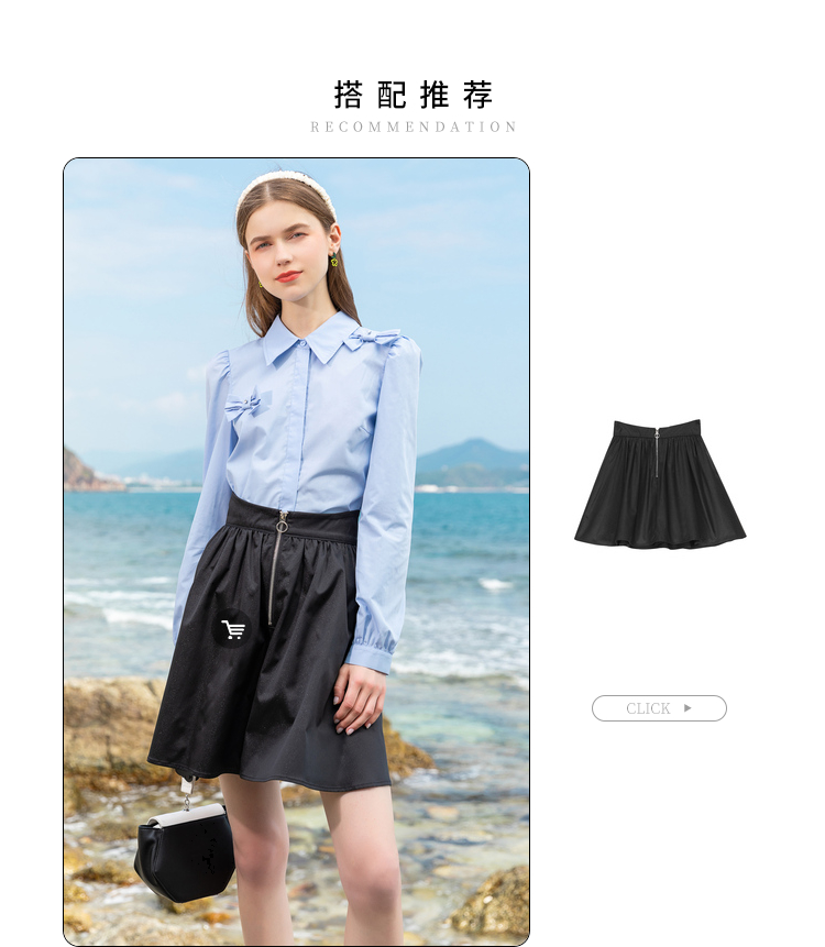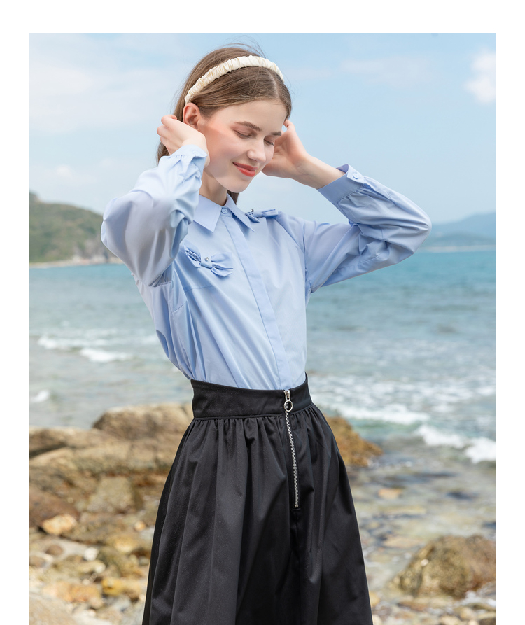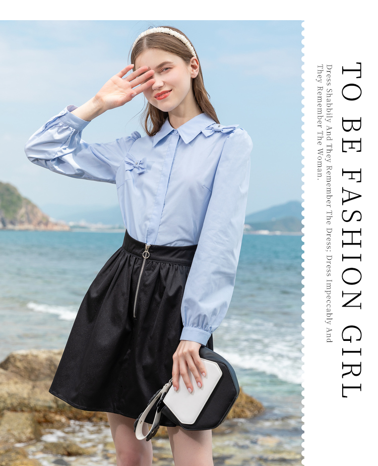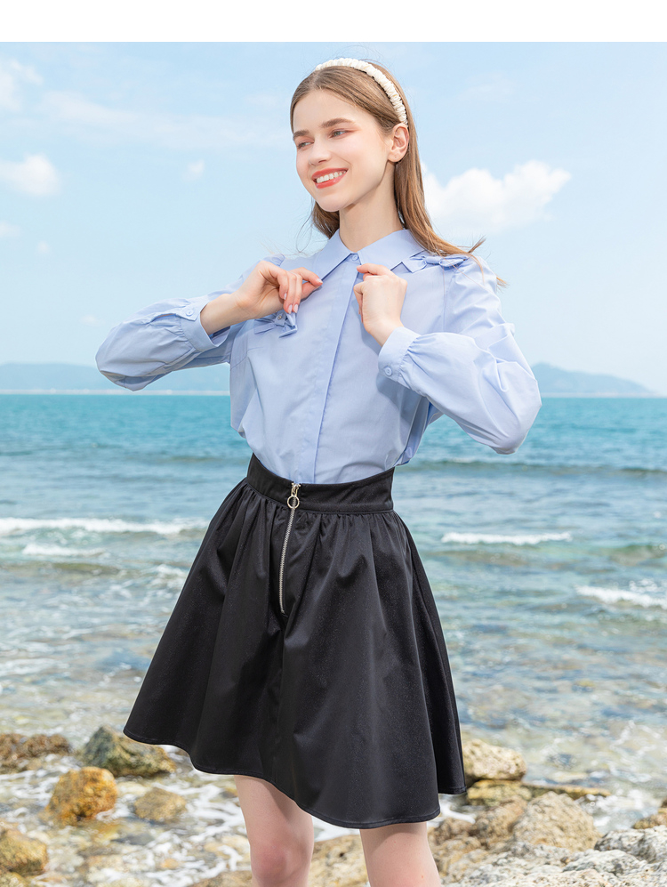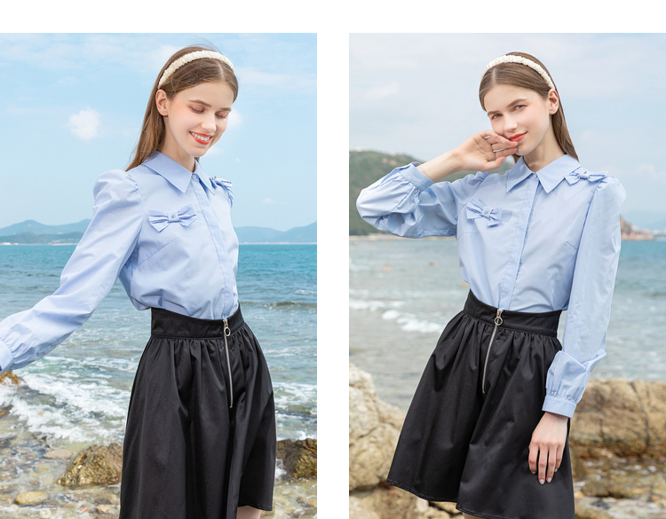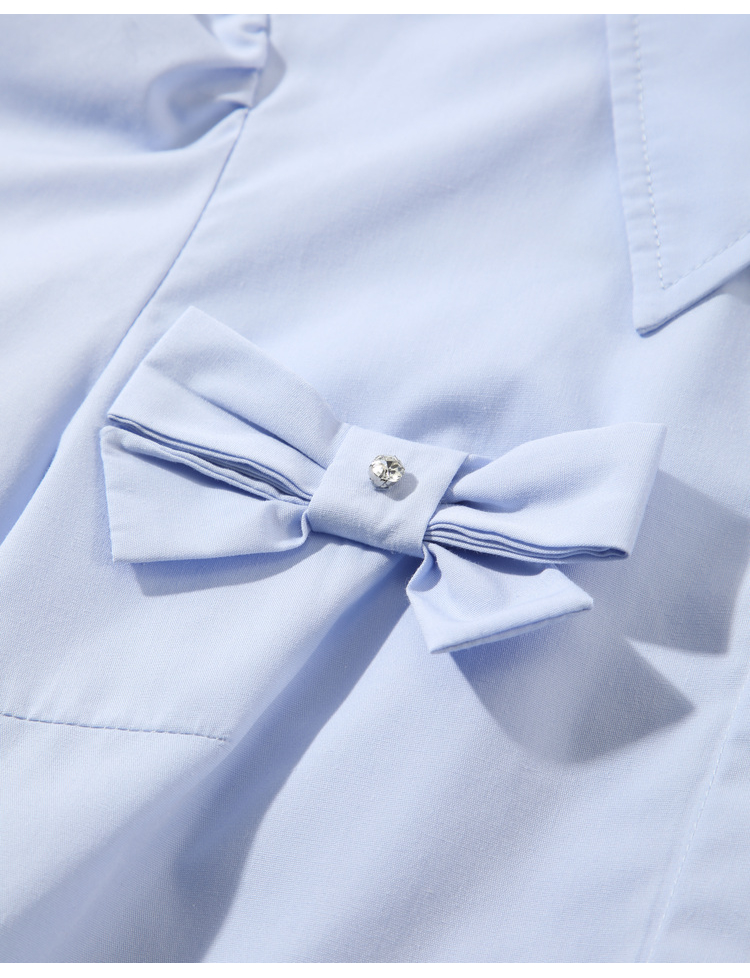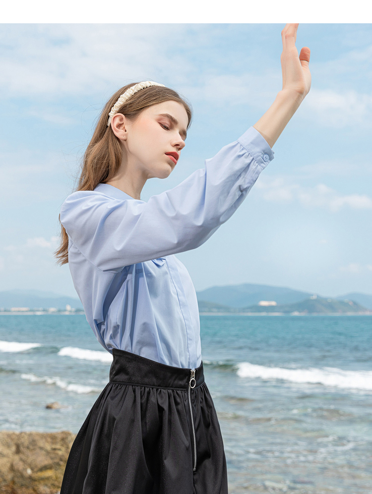 Lagogo拉谷谷2022春季新款翻领蝴蝶结泡泡袖衬衫女长袖浅蓝色上衣LACC432C21