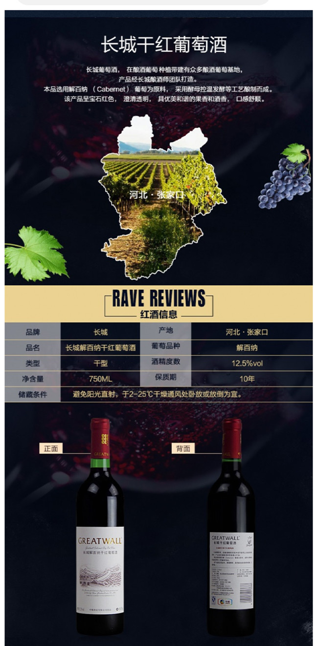长城解百纳干红葡萄酒福建白标 整箱750ml*6瓶包邮