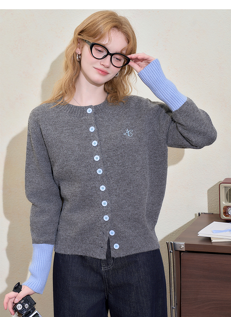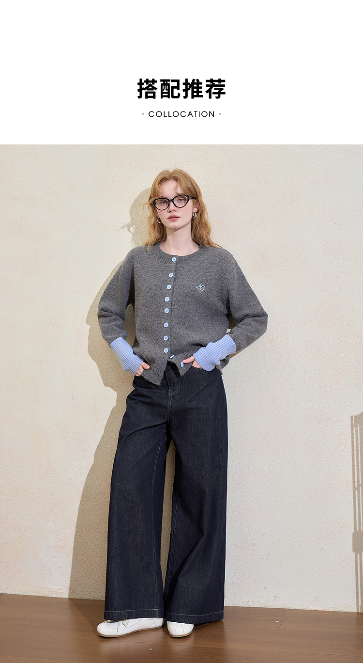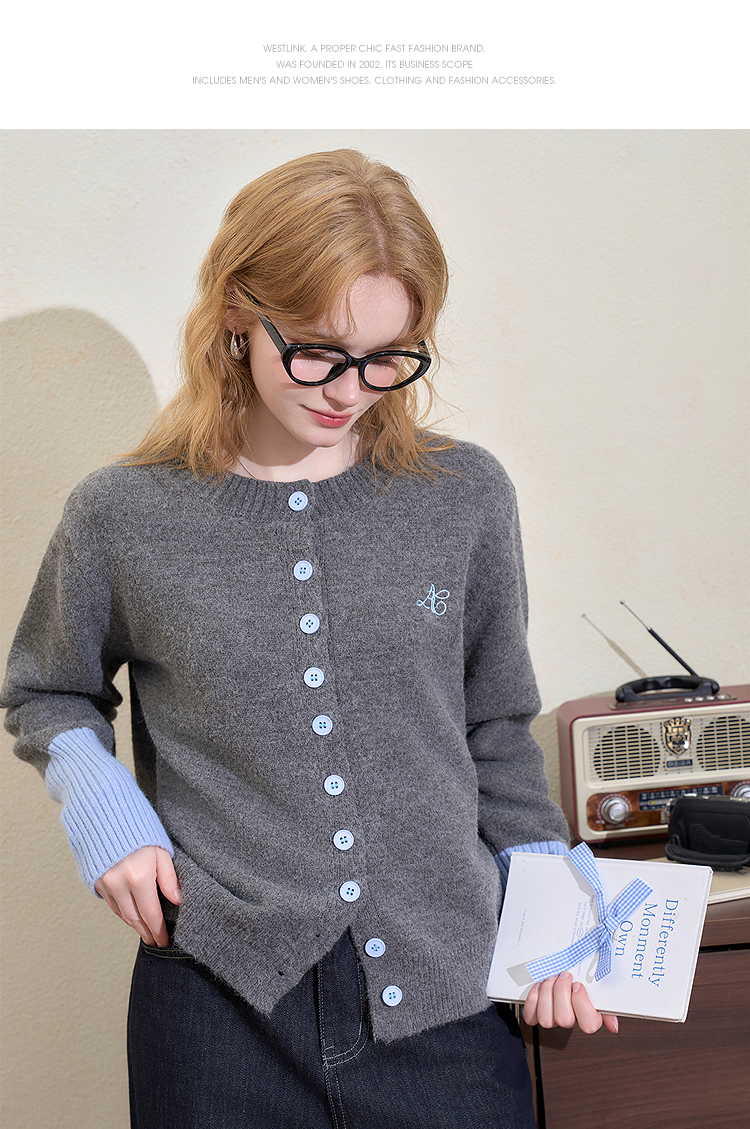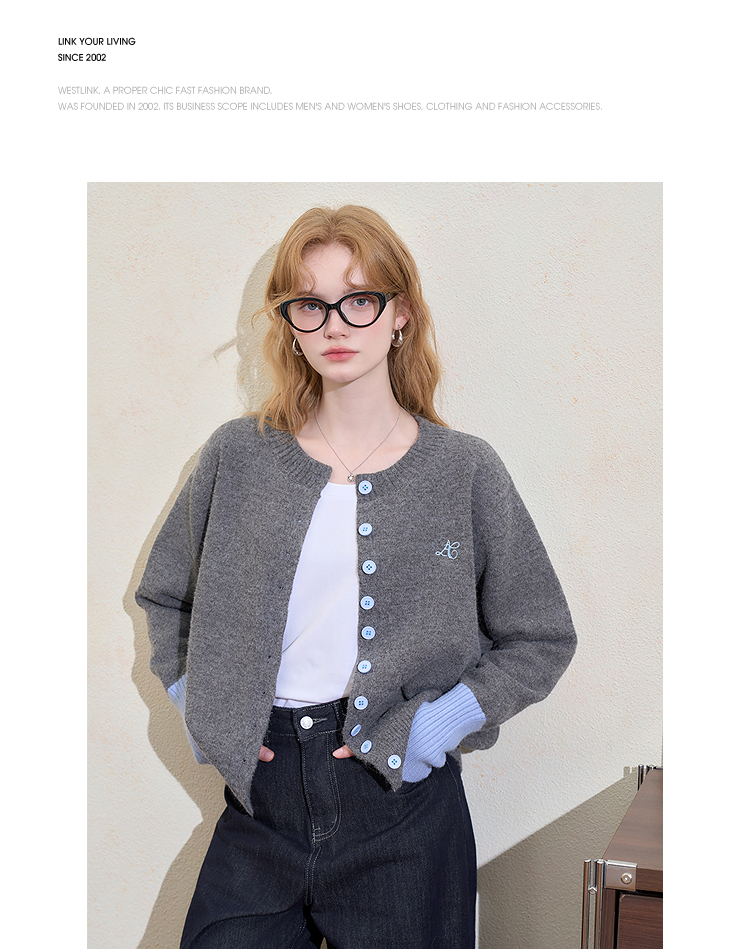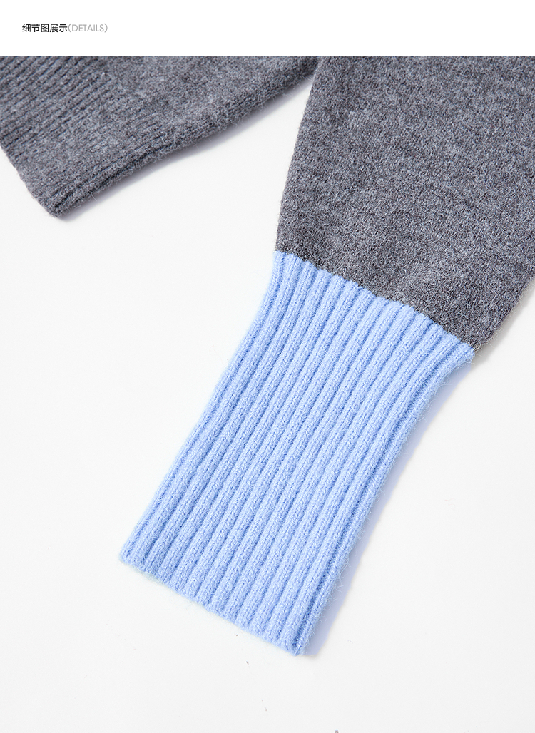 西遇撞色拼接刺绣针织衫女冬季温柔减龄宽松百搭圆领毛衣外套V3755281