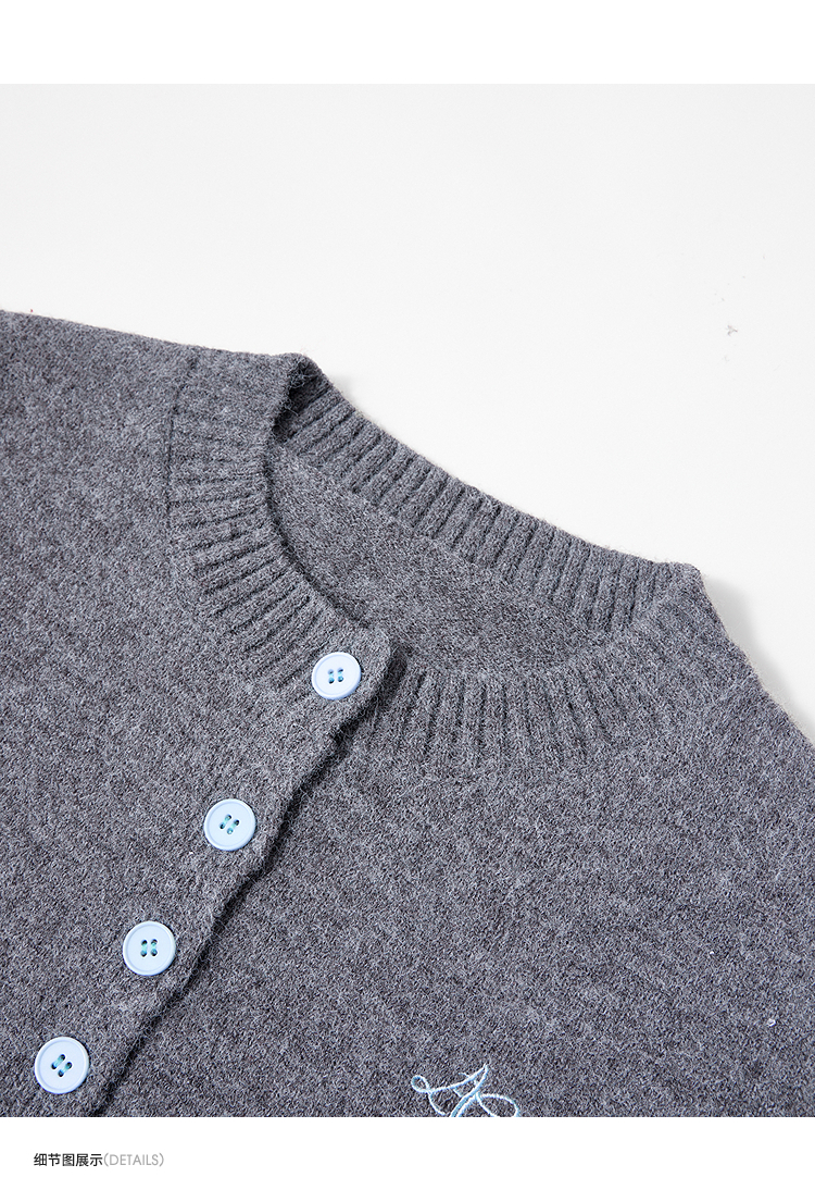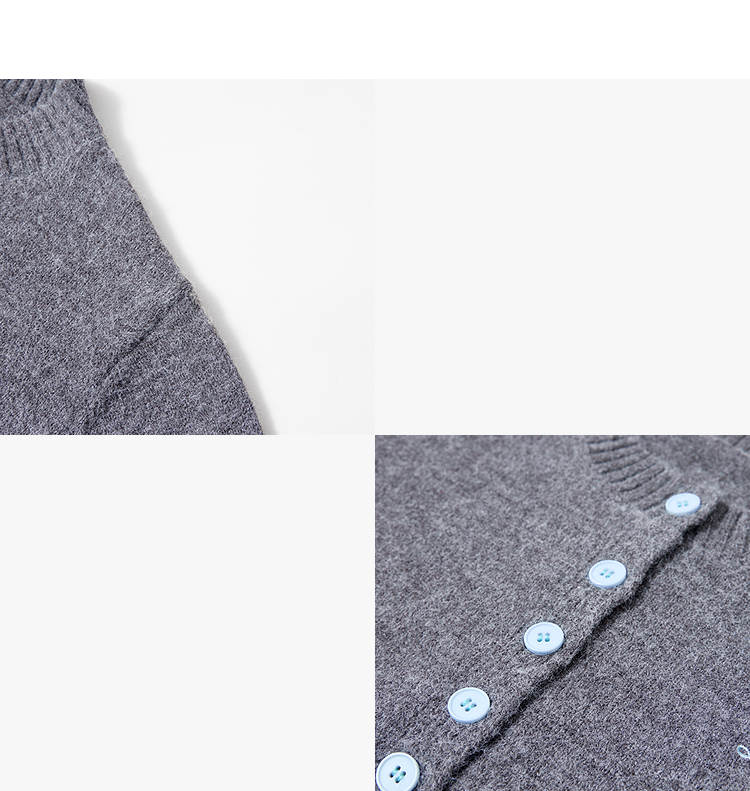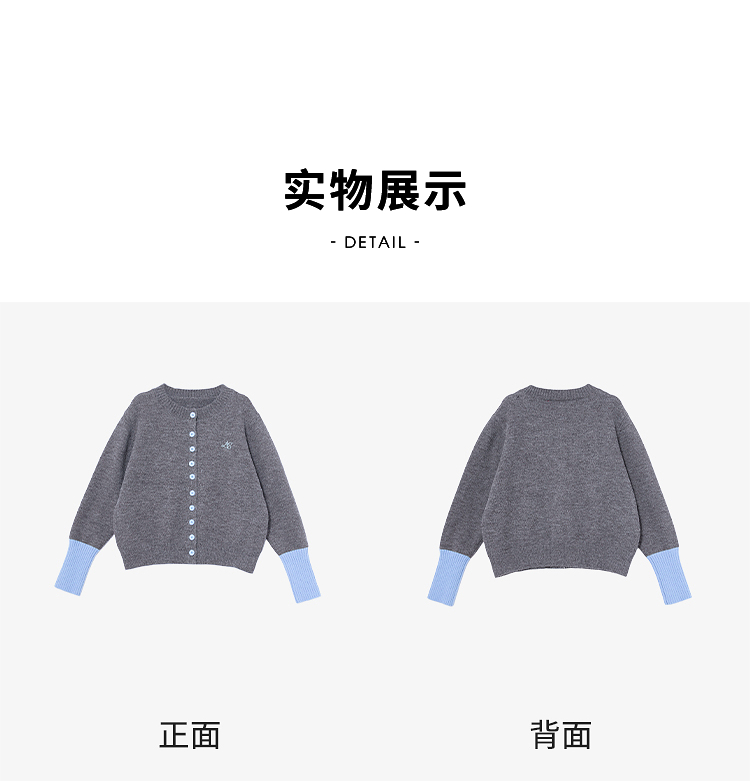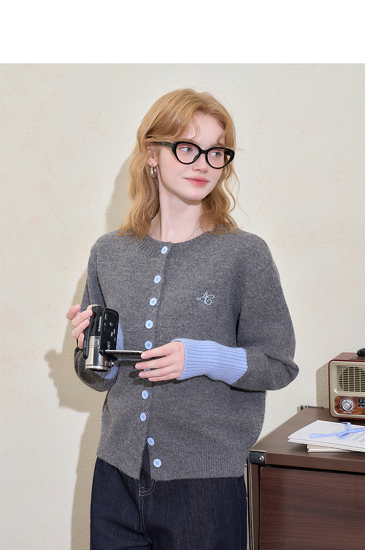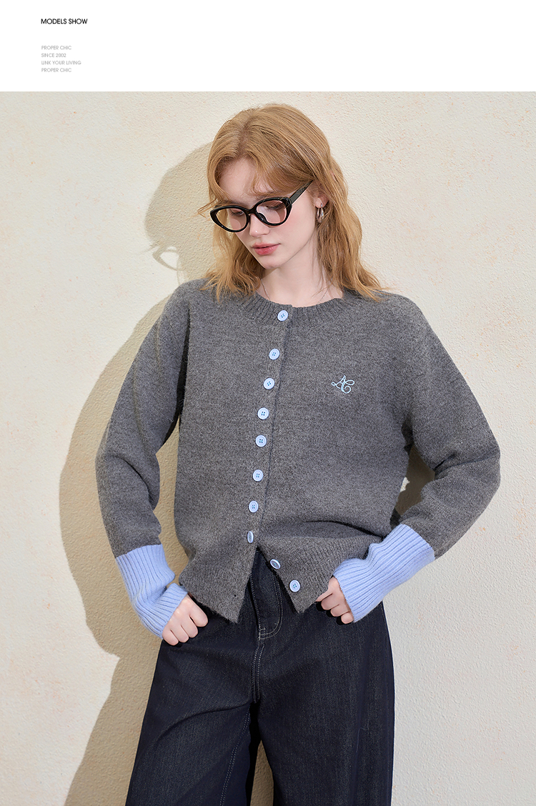 西遇撞色拼接刺绣针织衫女冬季温柔减龄宽松百搭圆领毛衣外套V3755281