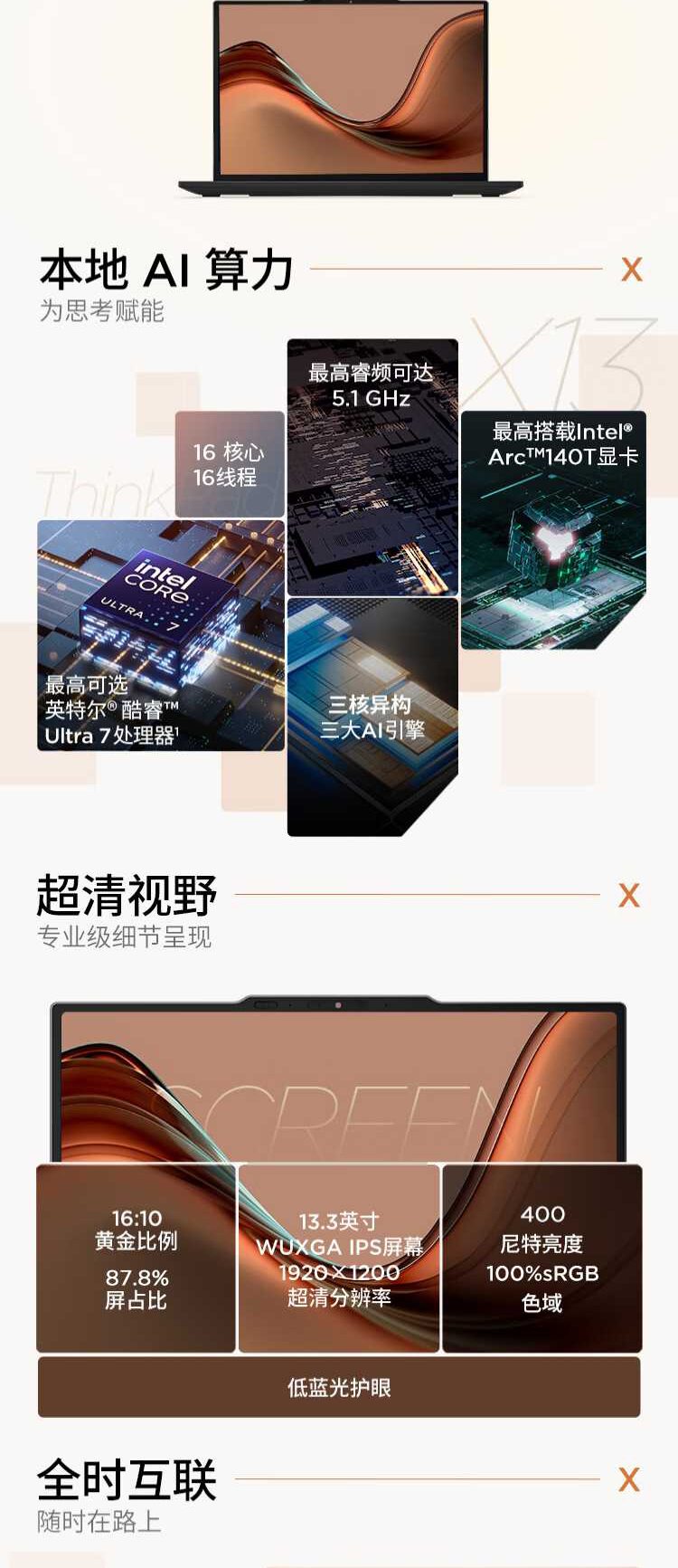 X13-A6CD | Ultra7-255H/32G/1TSSD/13.3"WUXGA/Win11+Office/WiFi7+4G/BT5.4/54.7Whr/2Yr/指纹/红外摄像头/背光键盘 |