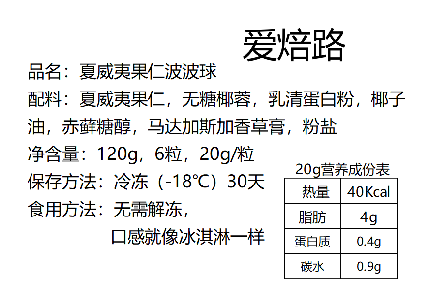 一共6粒,每颗约20克,碳水化合物0.8克,脂肪4克,蛋白质0.4克,热量40大卡
