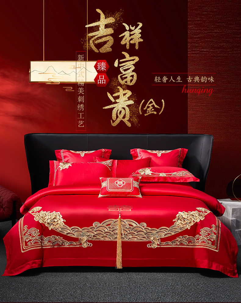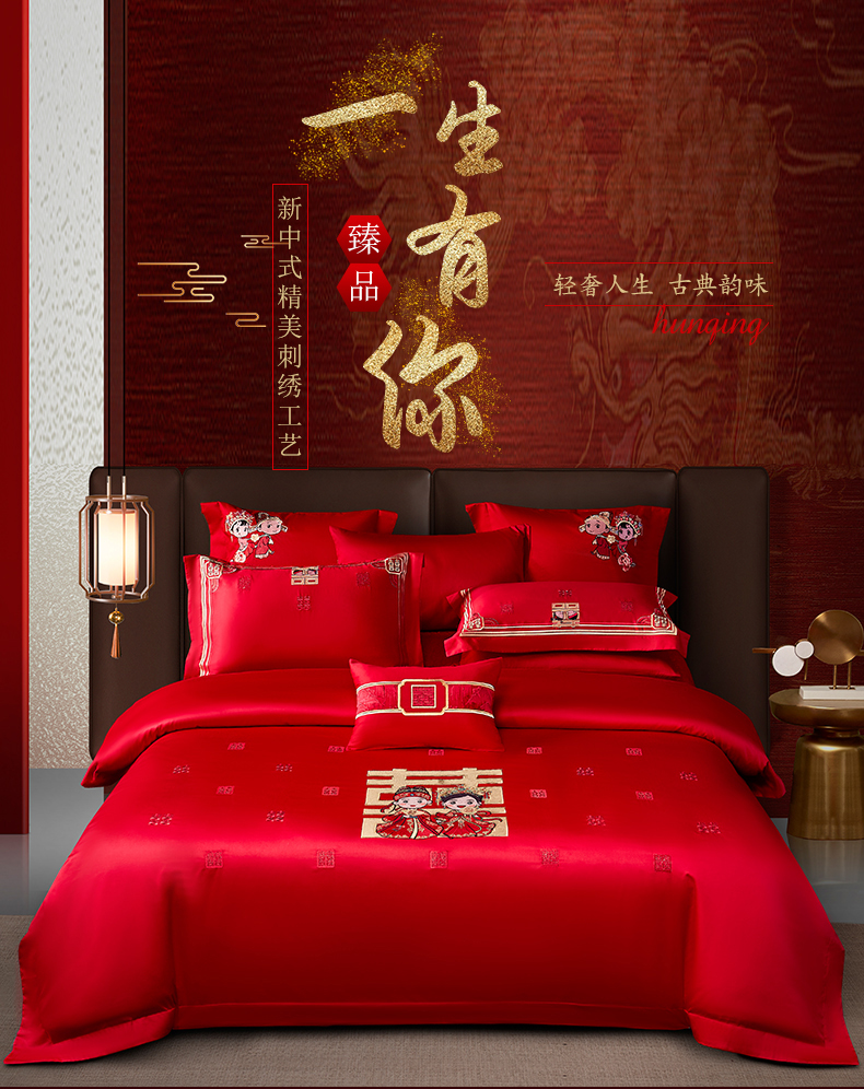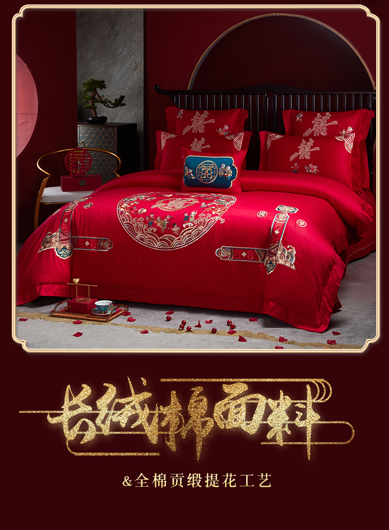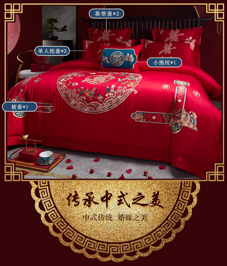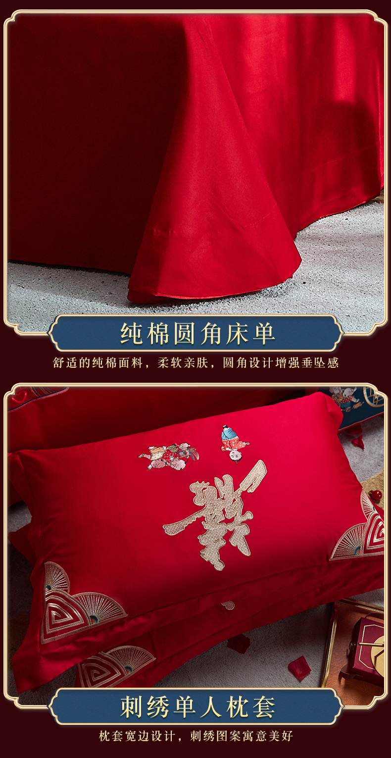自然醒中式婚庆四件套全棉纯棉床单被套结婚床上用品新婚大红婚嫁40支GDS