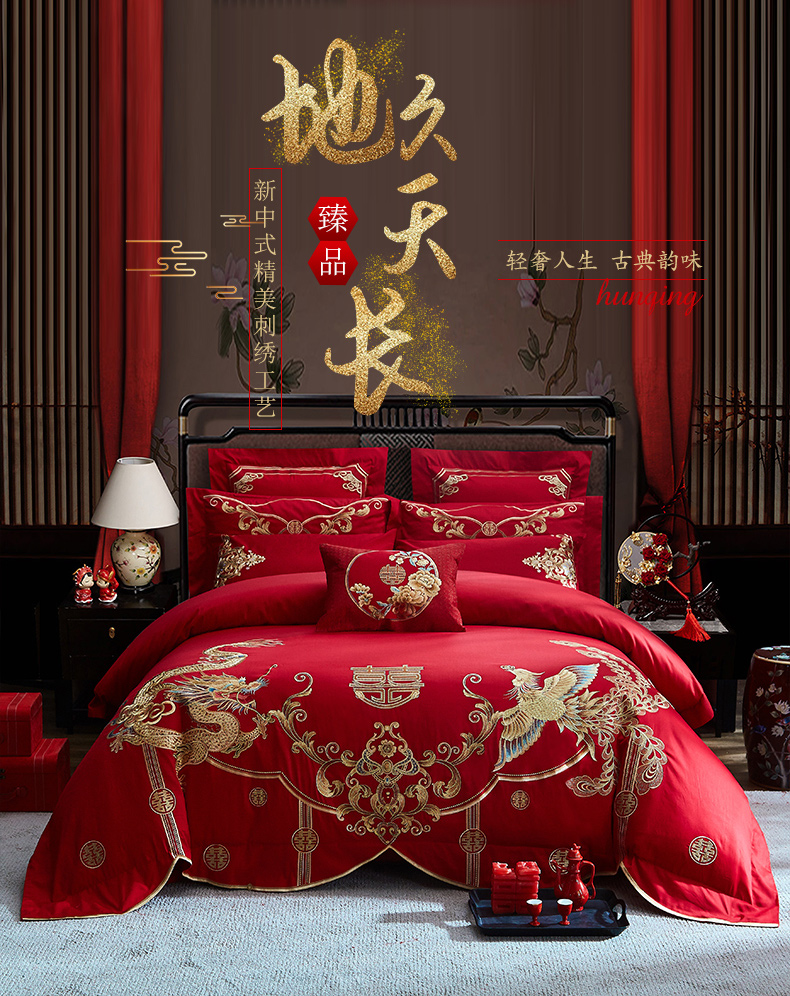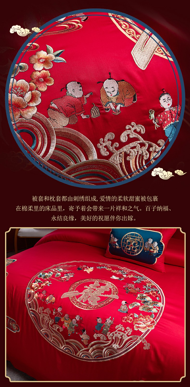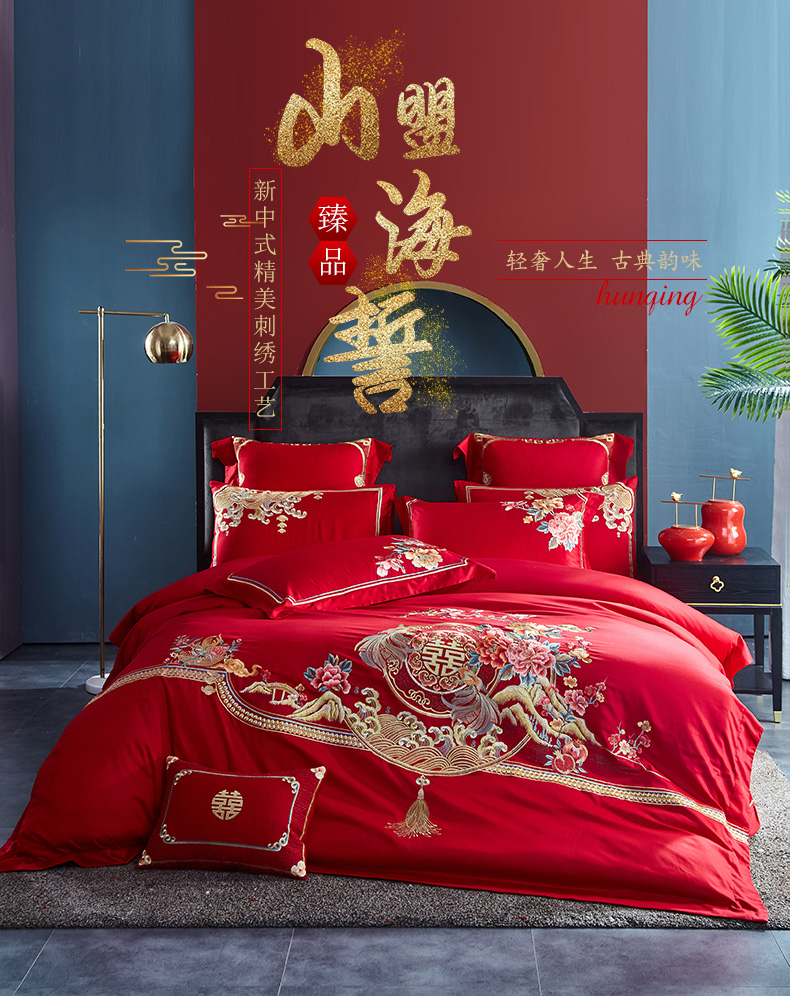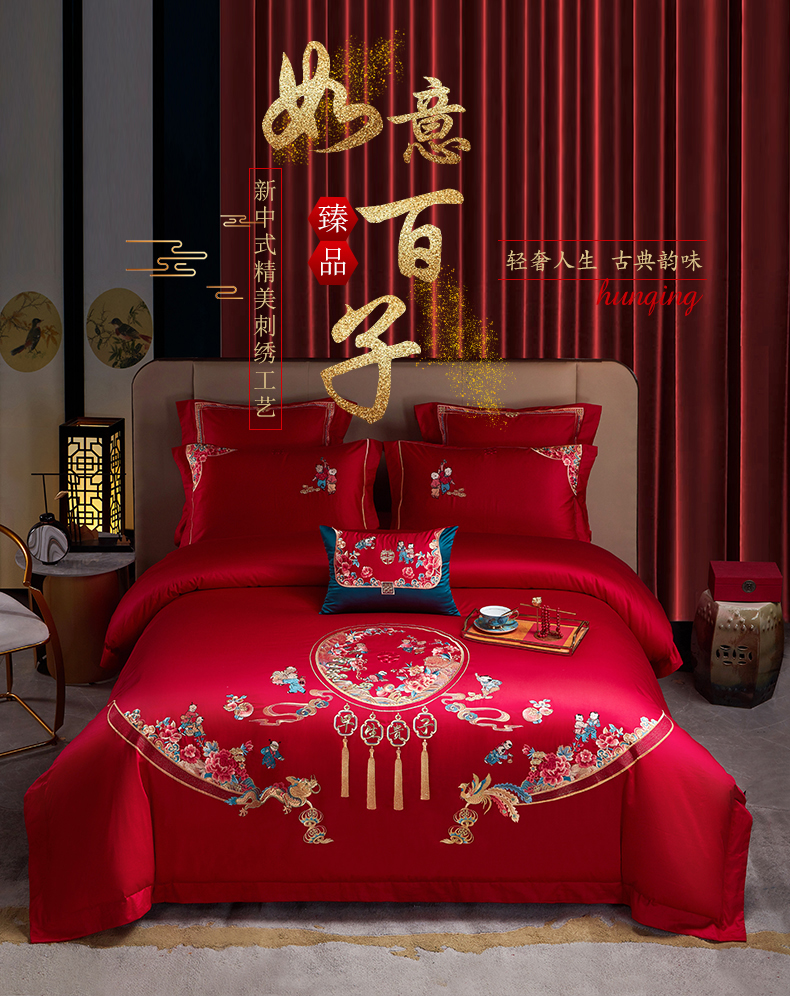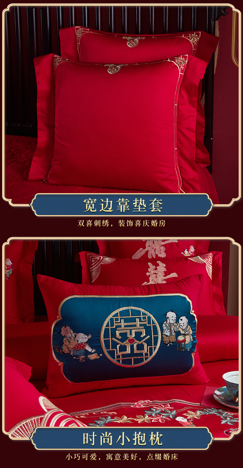 自然醒中式婚庆四件套全棉纯棉床单被套结婚床上用品新婚大红婚嫁40支GDS