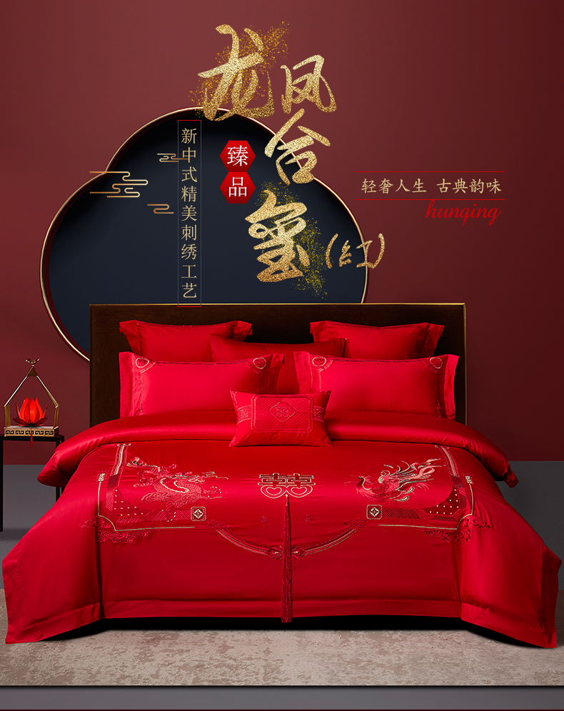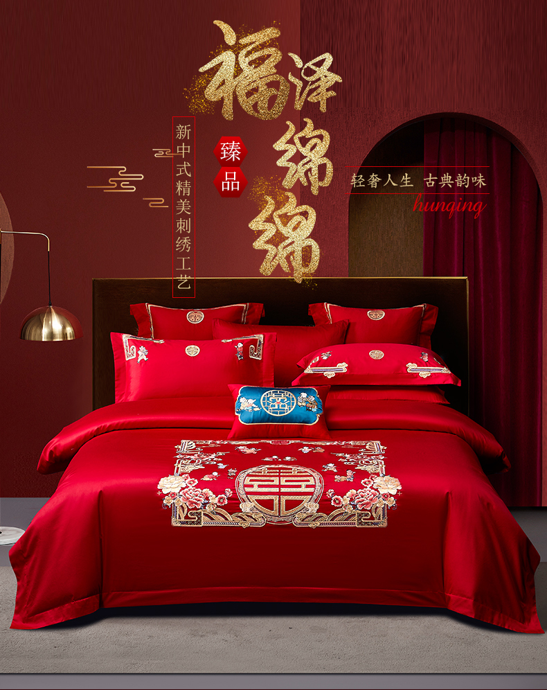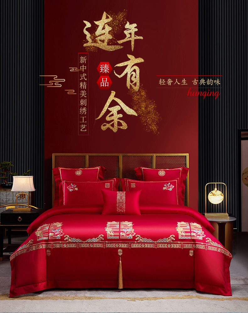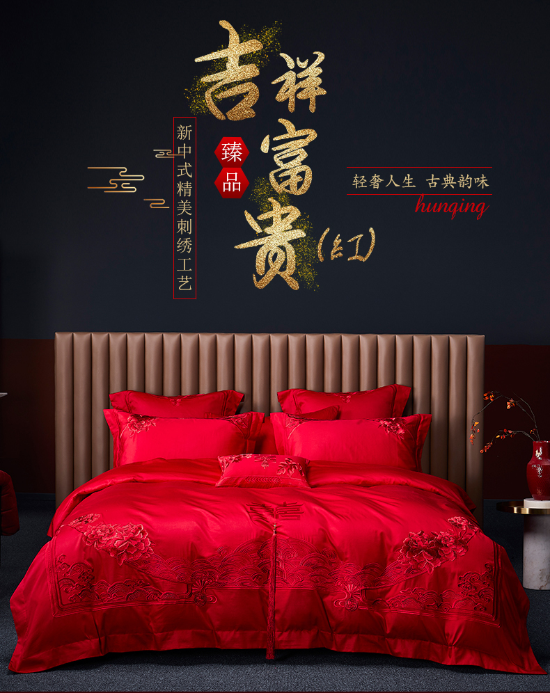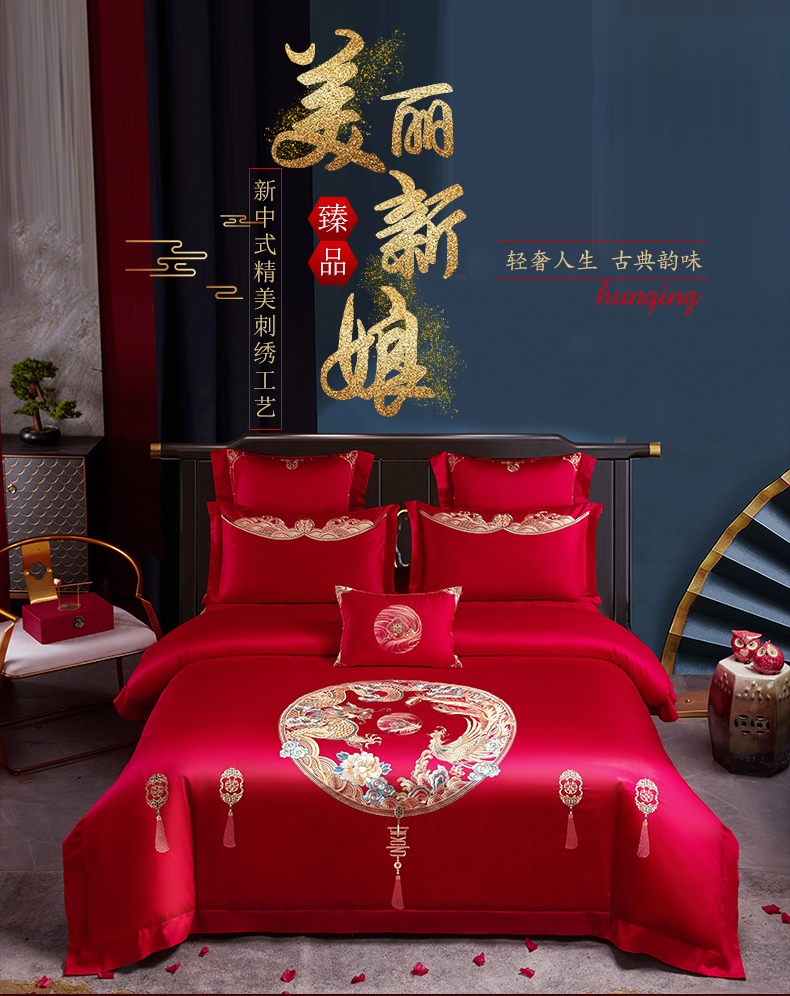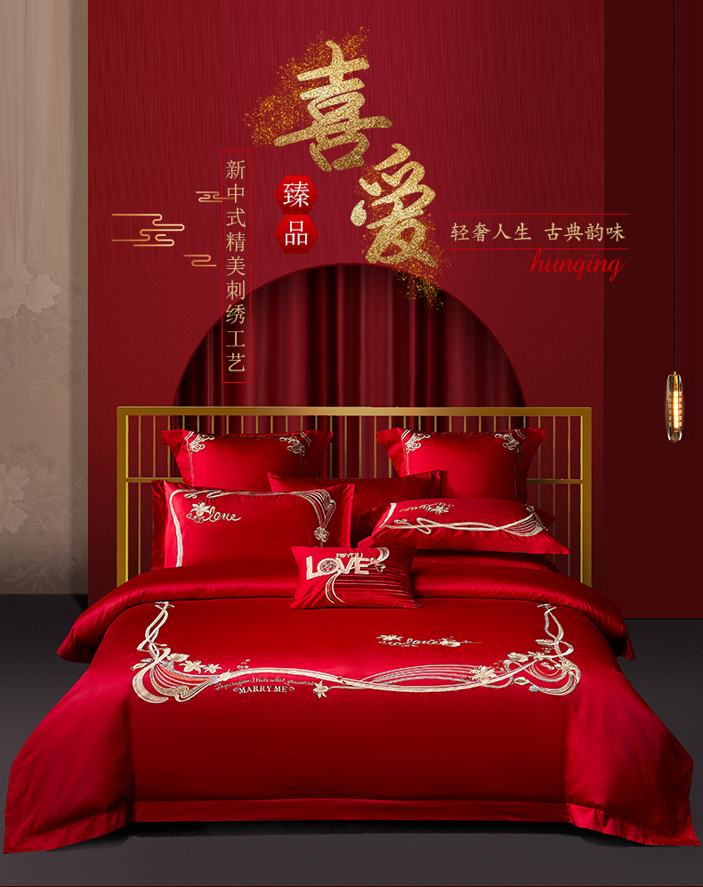 自然醒中式婚庆四件套全棉纯棉床单被套结婚床上用品新婚大红婚嫁40支GDS