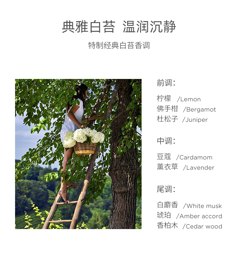 前调是明朗舒爽的柑橘和杜松香,活泼又跳跃;中调是薰衣草和醛香豆蔻,干净又温暖,让人时不时挂念;重头戏全压在后调,杜松子淡淡的咸味慢慢褪去,白苔和麝香的糅合,散发出阵阵迷人的木质香。