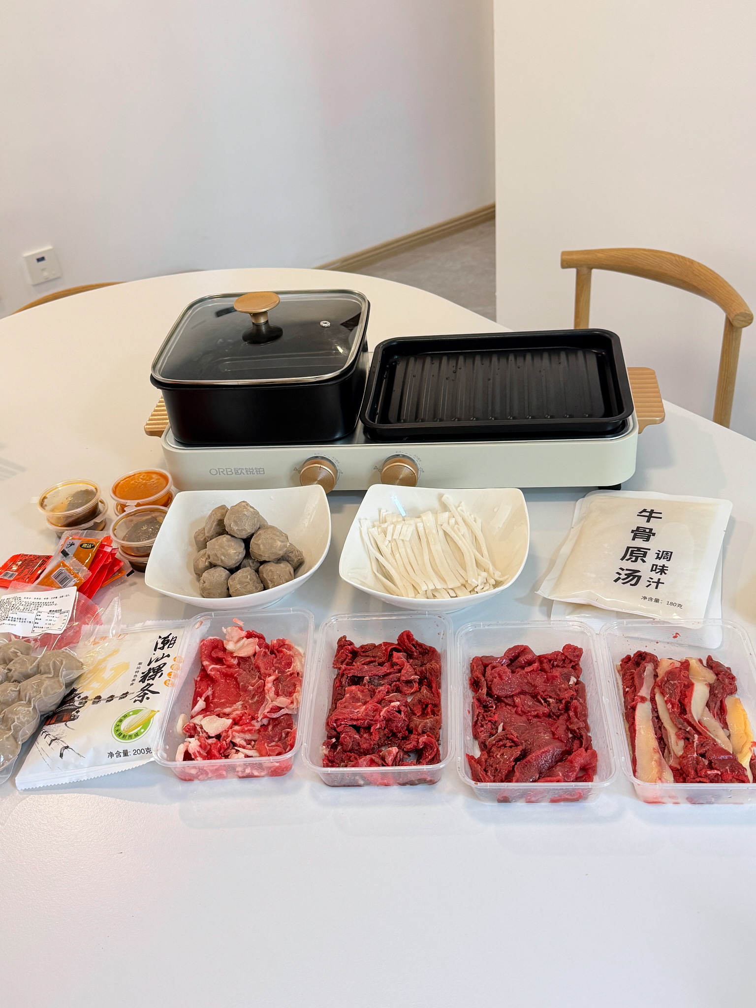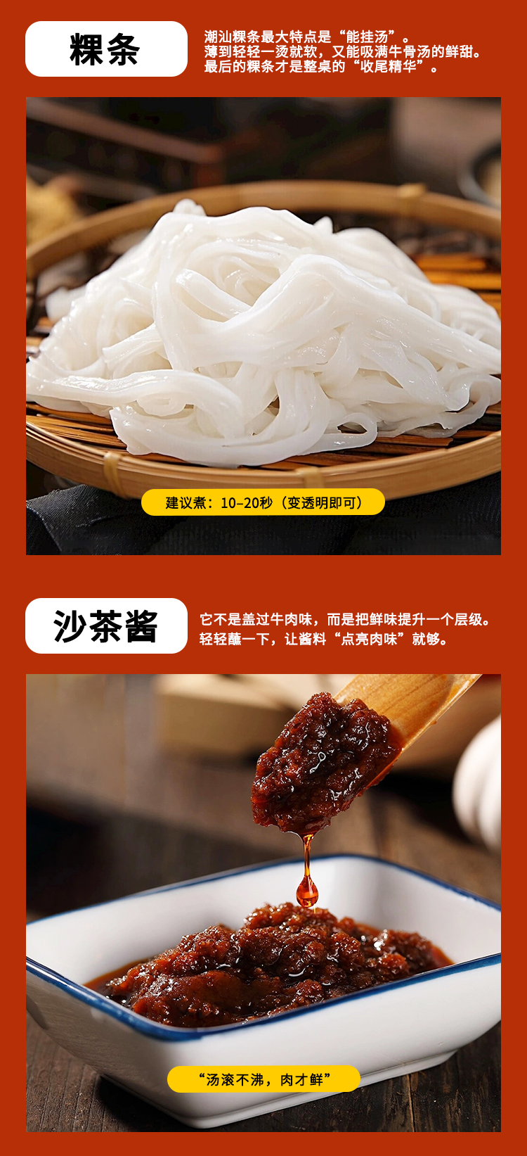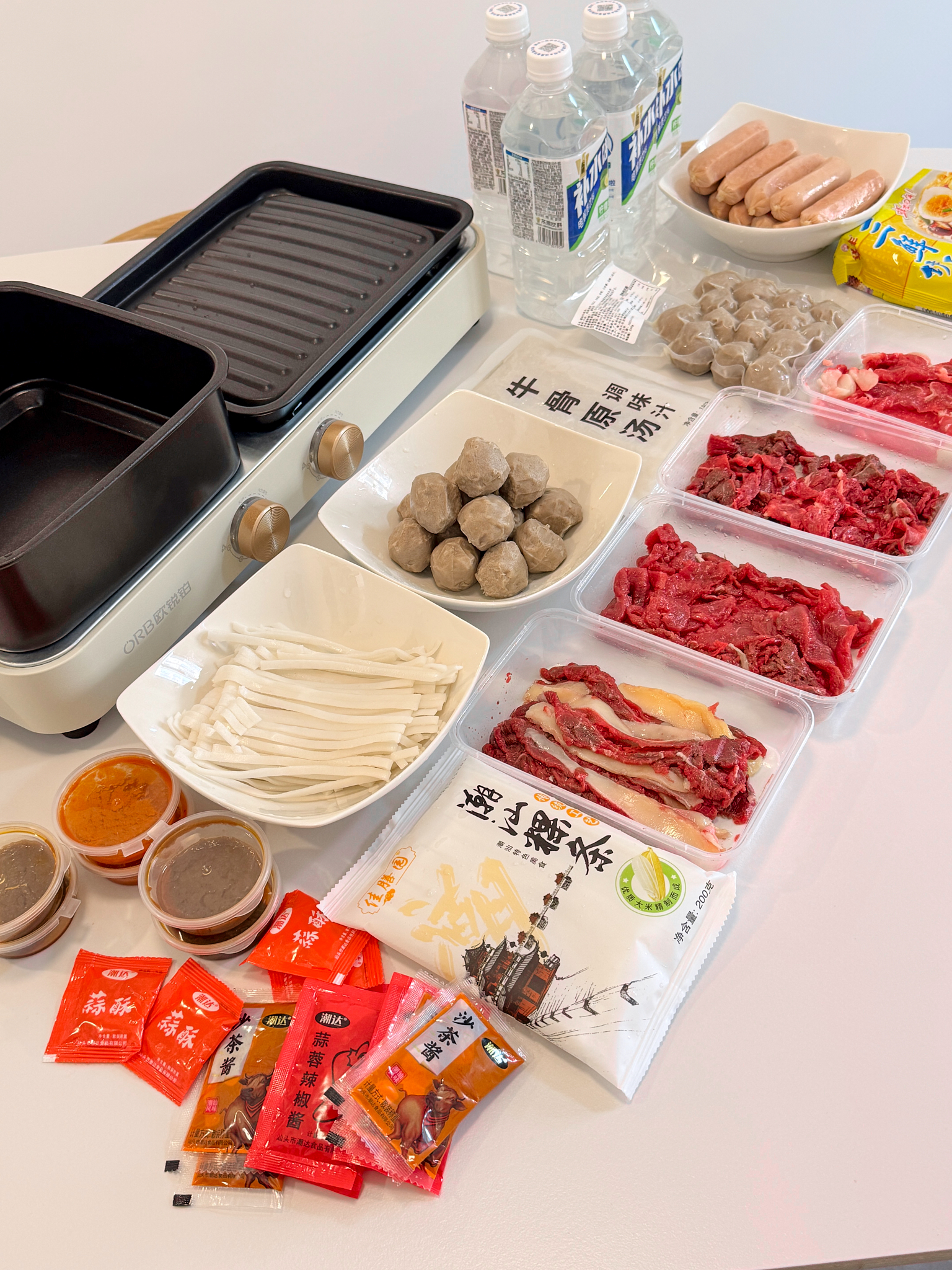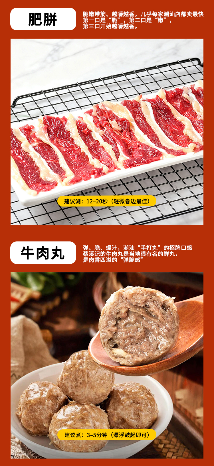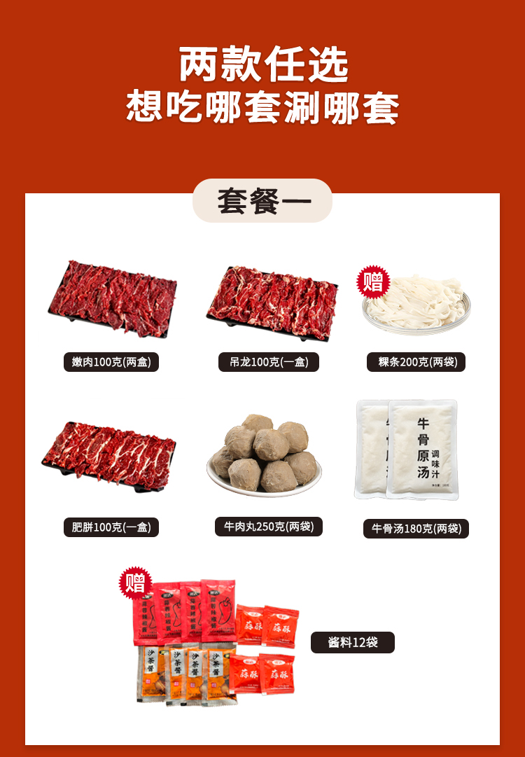 嫩肉100克/2盒,吊龙100克/1盒,肥胼100克/1盒,牛肉丸250克/2袋,粿条200克/2袋,牛骨汤180克/2袋,酱料12袋