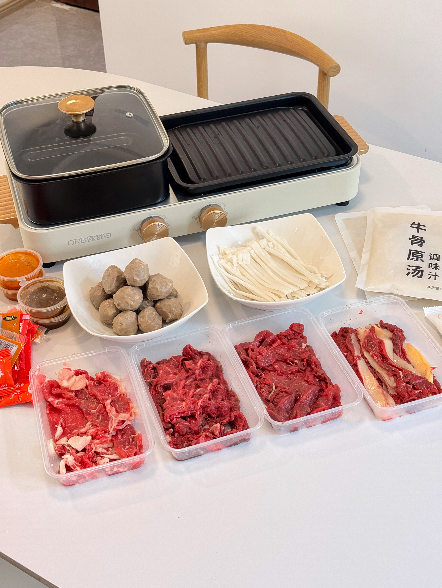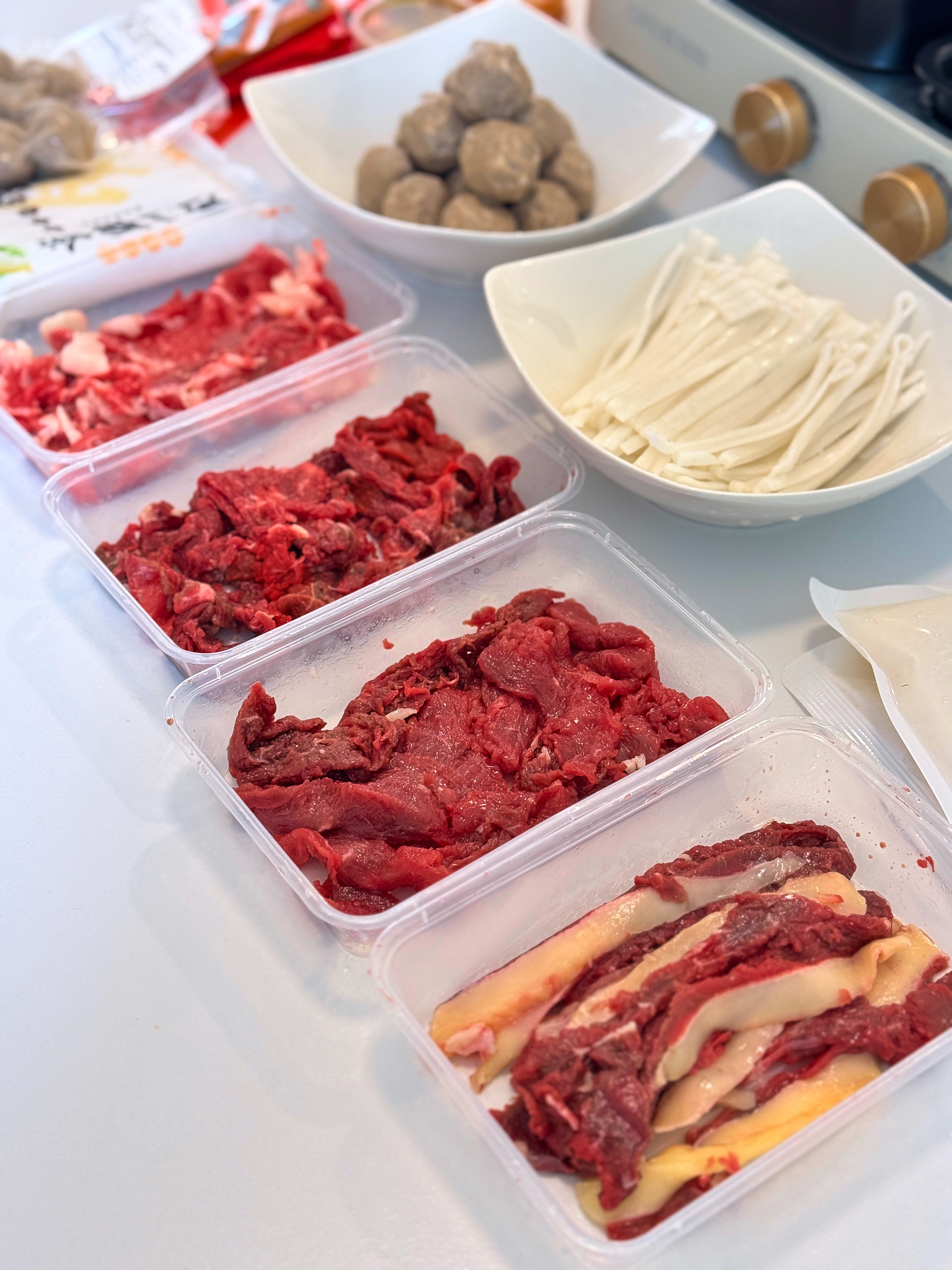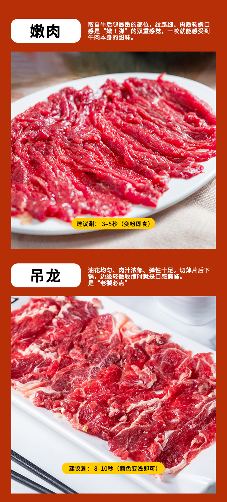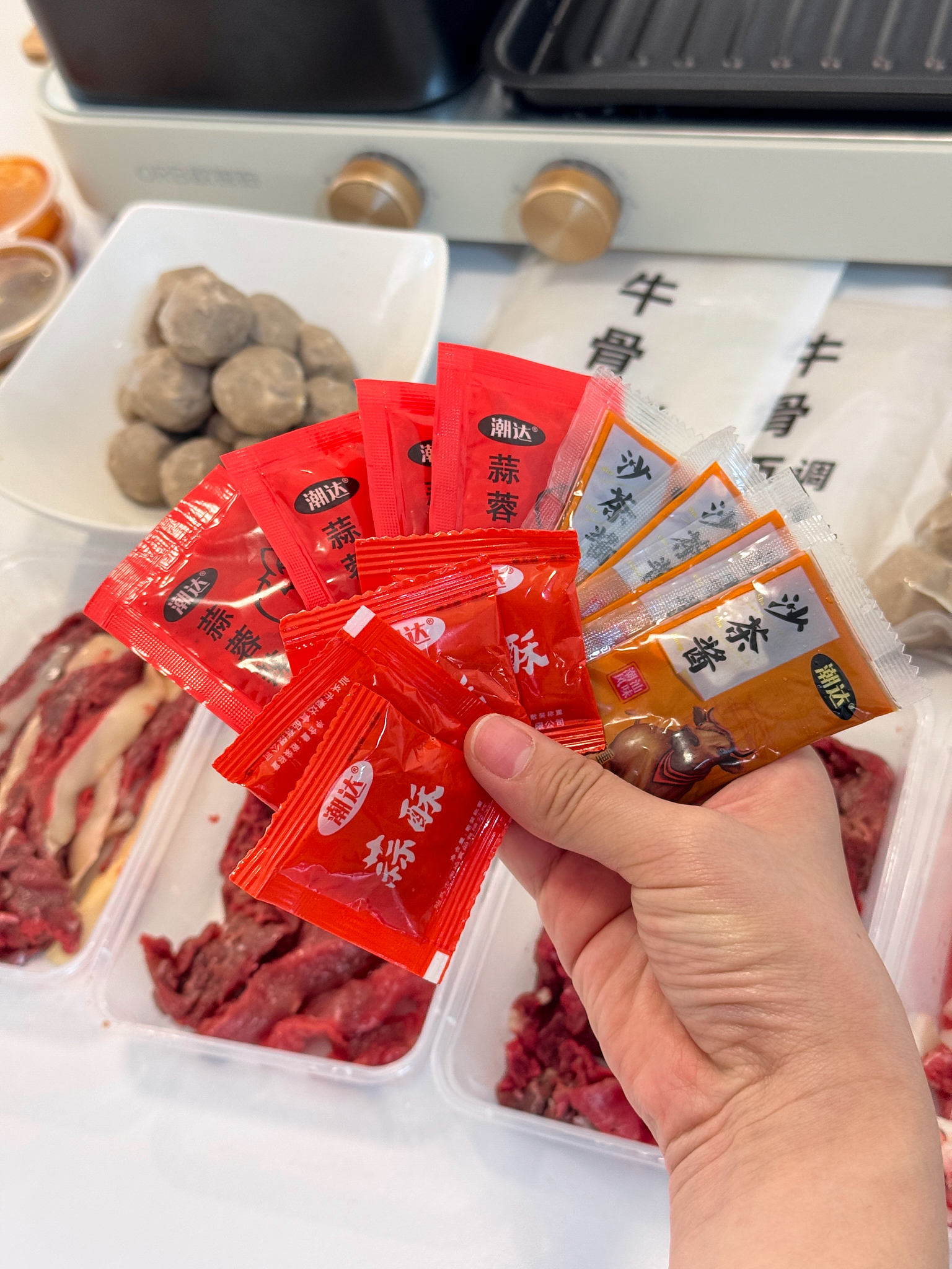 嫩肉100克/2盒,吊龙100克/1盒,肥胼100克/1盒,牛肉丸250克/2袋,粿条200克/2袋,牛骨汤180克/2袋,酱料12袋