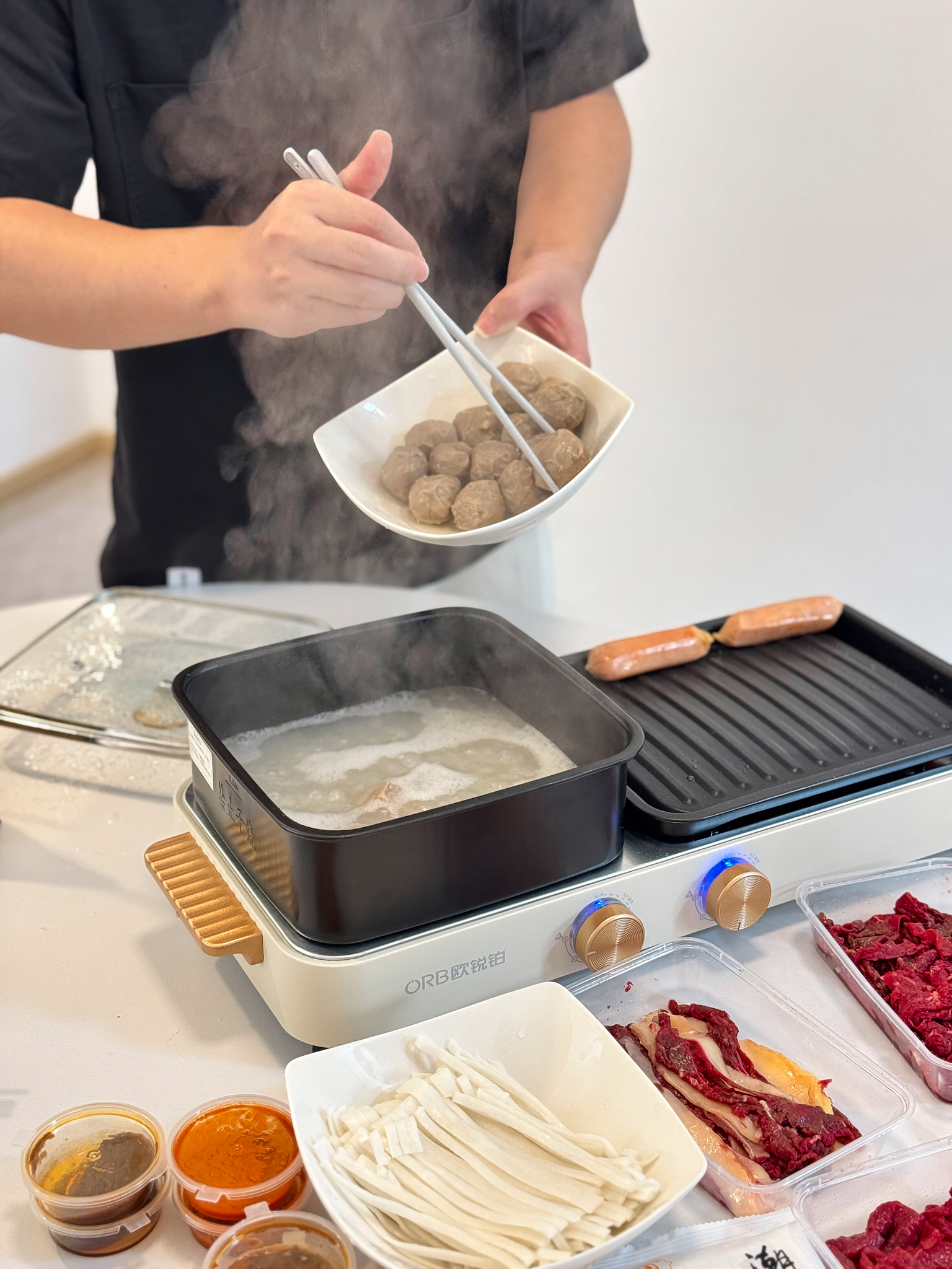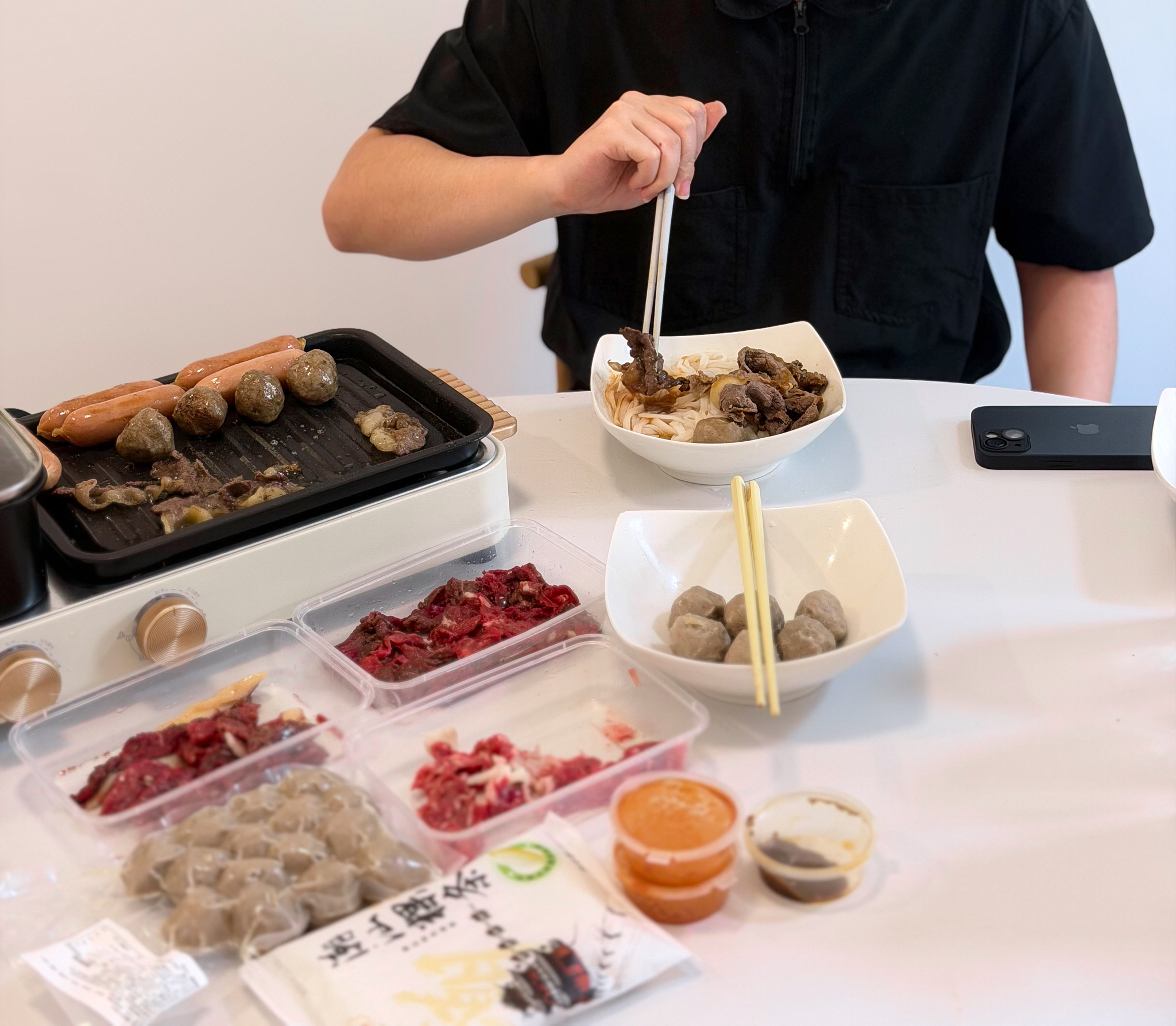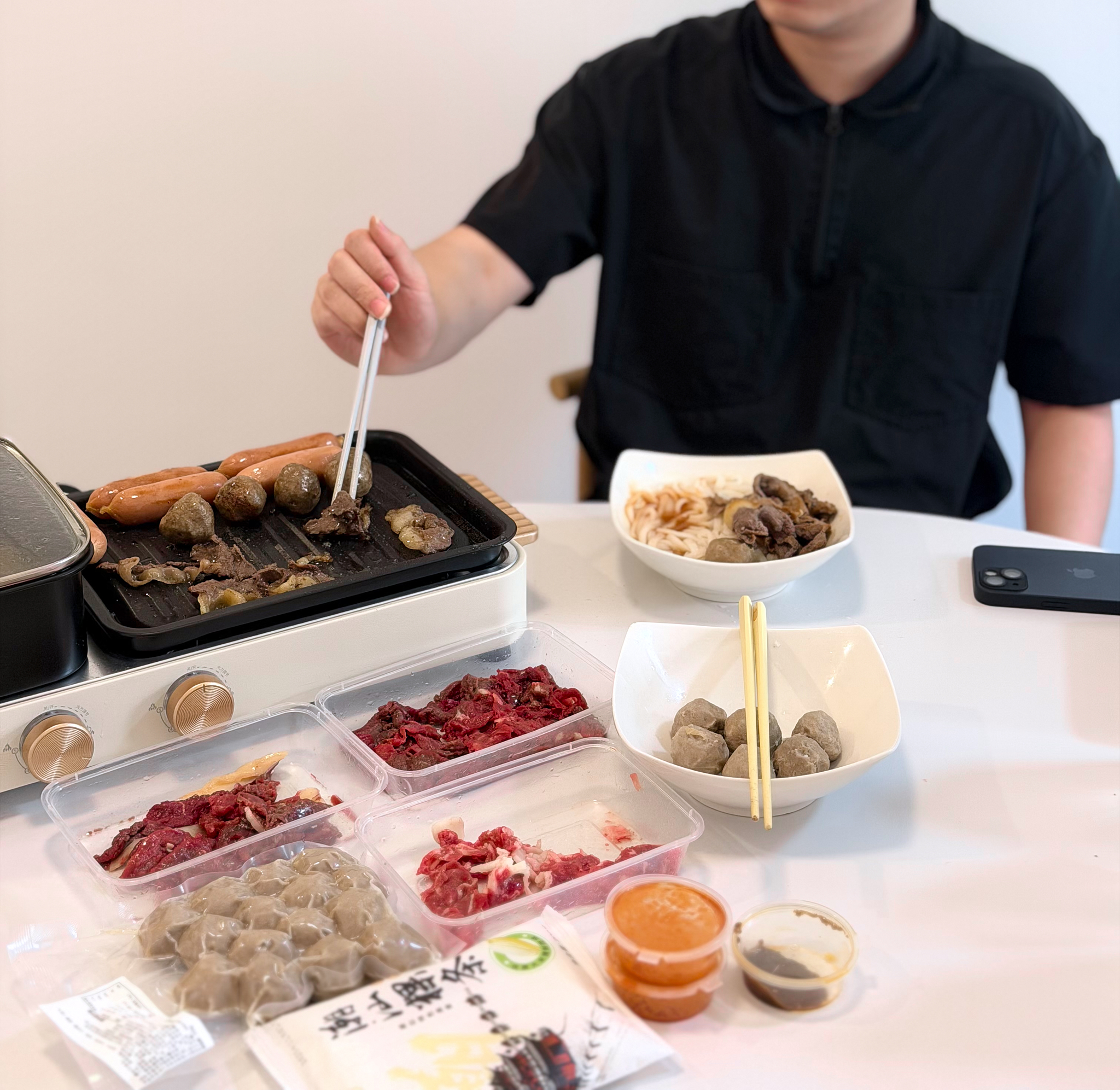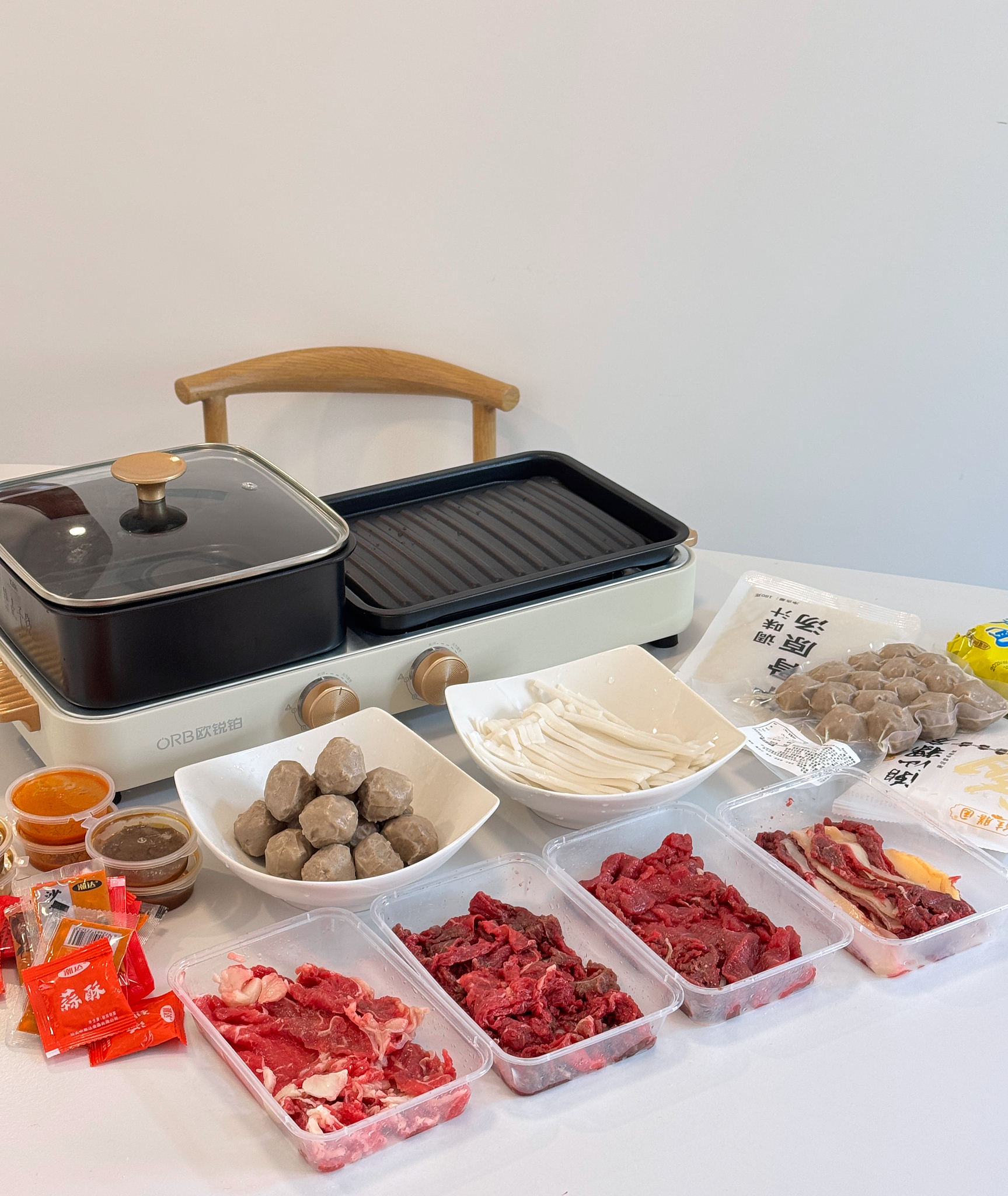 嫩肉100克/2盒,吊龙100克/1盒,肥胼100克/1盒,牛肉丸250克/2袋,粿条200克/2袋,牛骨汤180克/2袋,酱料12袋