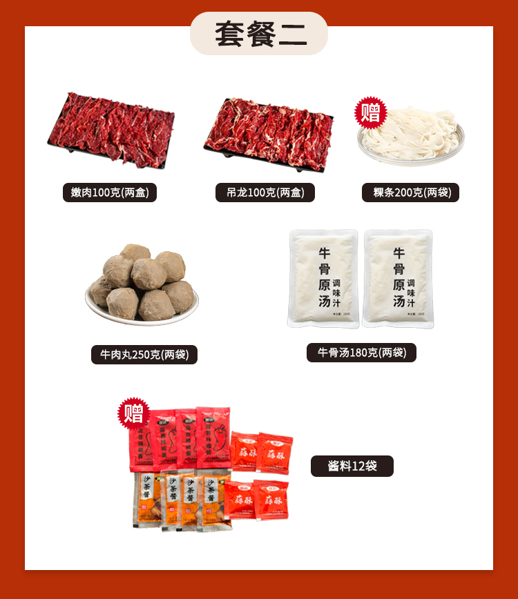 嫩肉100克/2盒,吊龙100克/2盒,牛肉丸250克/2袋,粿条200克/2袋,牛骨汤180克/2袋,酱料12袋