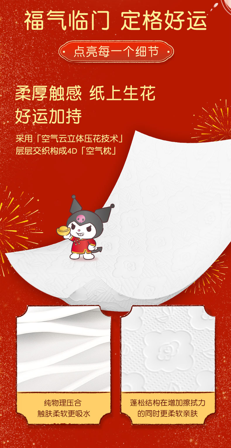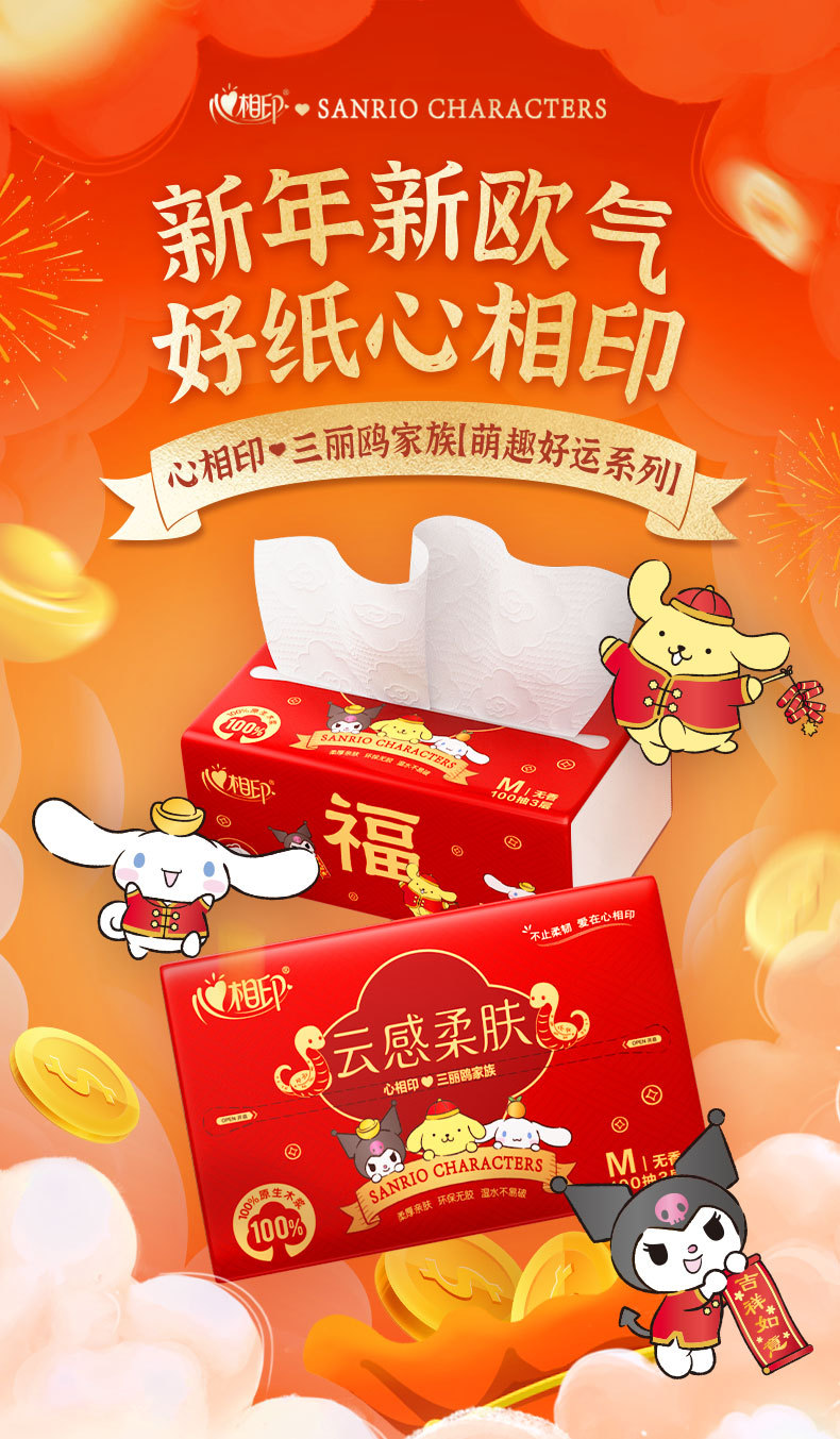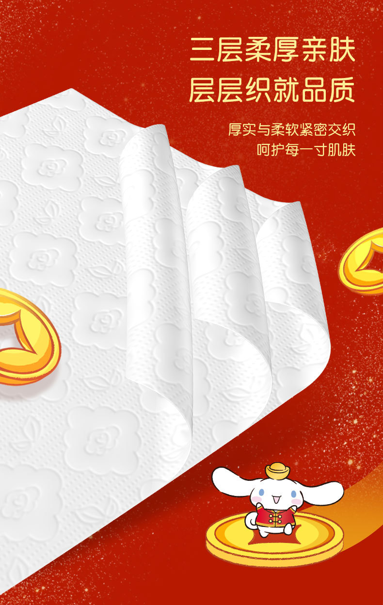 【三丽鸥新春限定,贴心相伴!】新款新年心相印,原生木浆,环保无胶,柔厚亲肤,湿水不破,让您感受4D空气枕般的柔软触感,一纸千金,浪漫新春;萌趣好运系列!