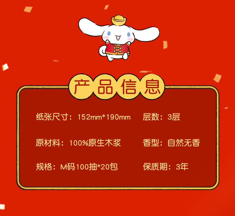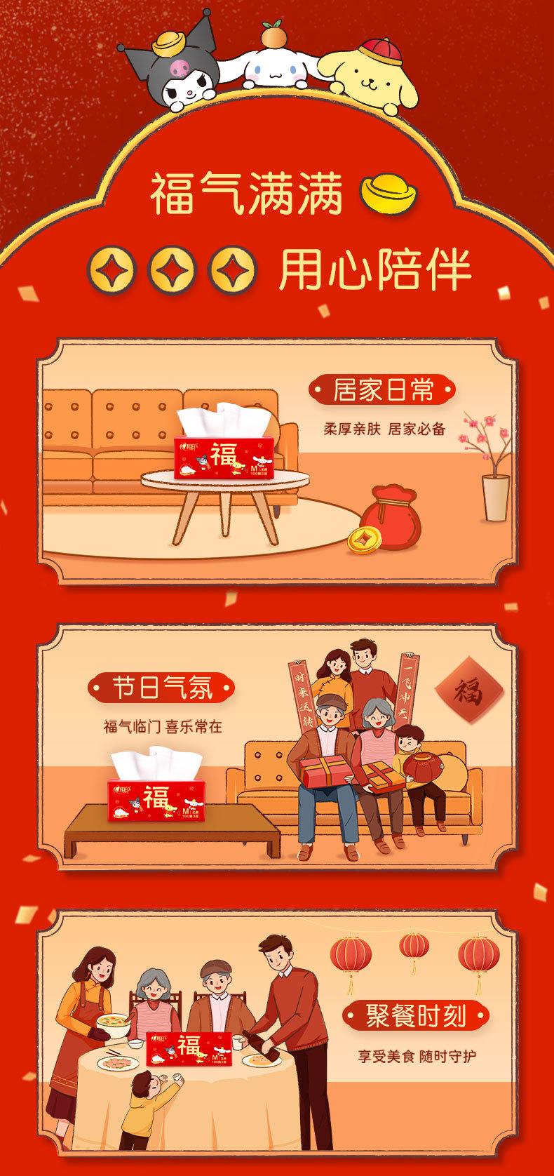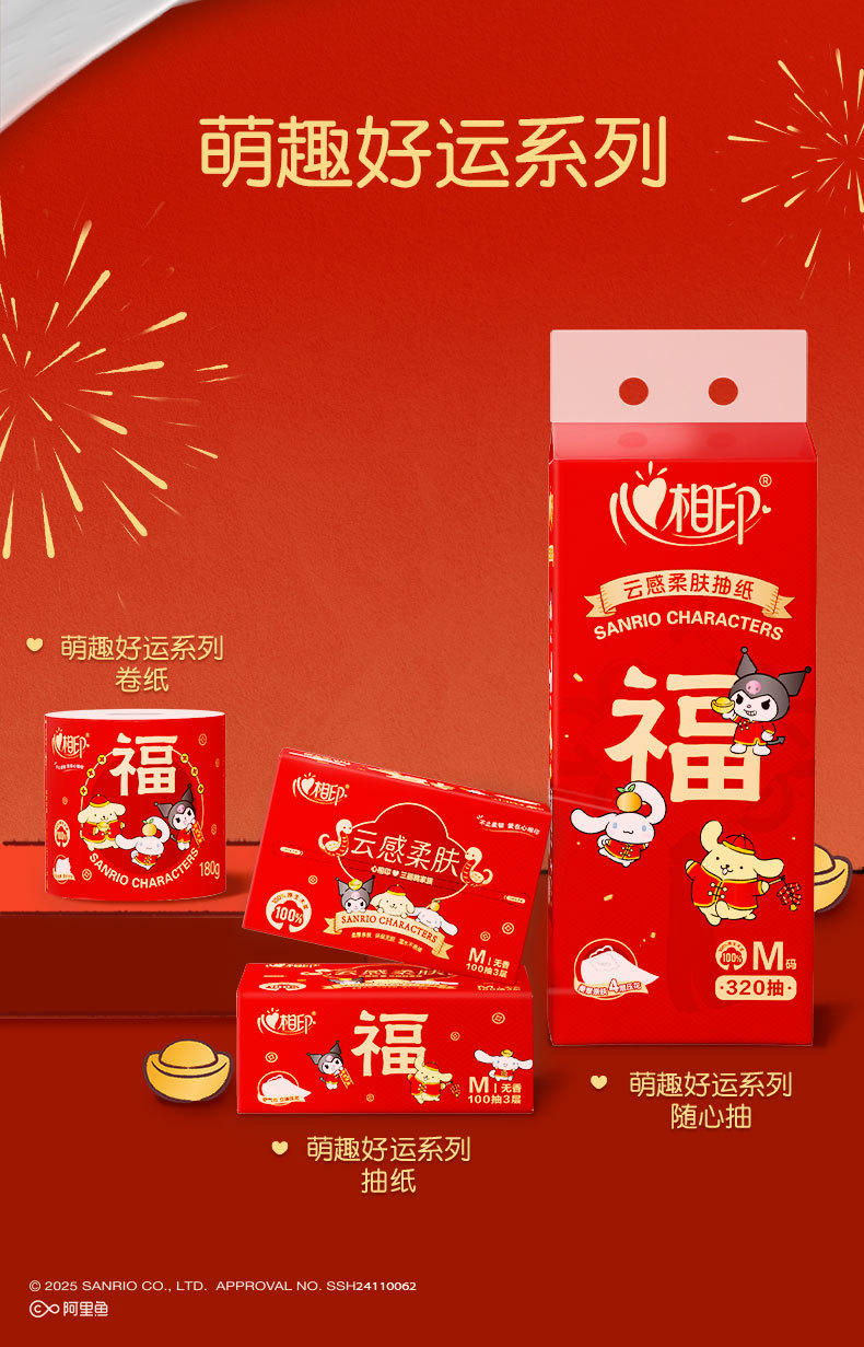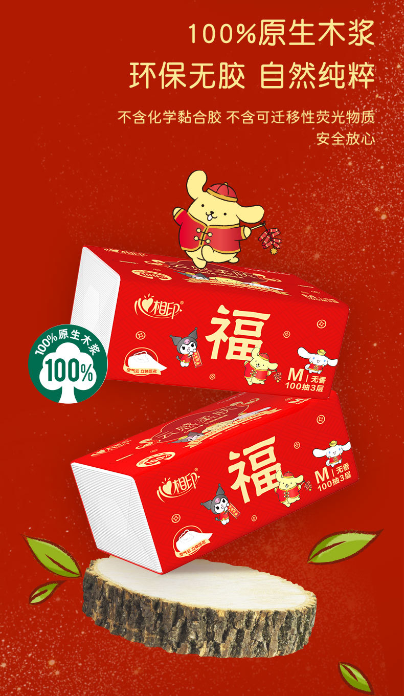 【三丽鸥新春限定,贴心相伴!】新款新年心相印,原生木浆,环保无胶,柔厚亲肤,湿水不破,让您感受4D空气枕般的柔软触感,一纸千金,浪漫新春;萌趣好运系列!