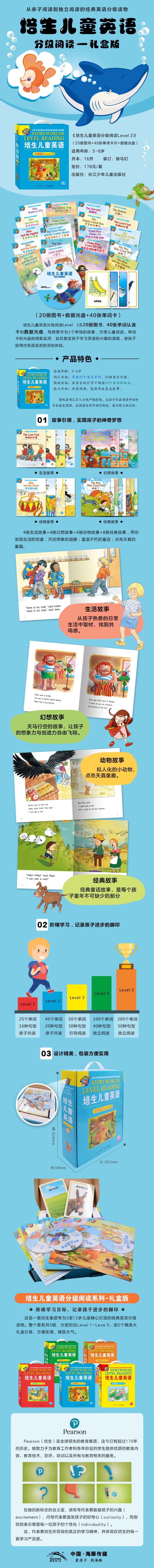 这是一套培生集团为3至12岁儿童精心打造的启蒙、进阶与提高的经典英语读物。整套分为Level 1、Level 2、Leve 3、Leve 4、Leve 5共5级,由5个精美大礼盒分装,方便实用,精致大气。Level 1-Leve 3每盒有20册图书、40张单词认读卡和5张DVD,Level 4有16册图书和1张CD,Level 5有20册图书和1张CD。每级图书以儿童喜欢的经典故事、幻想故事、动物故事、生活故事为主导,用单词卡、图画以及DVD动画的形式,激起孩子学习英语的兴趣和潜能,使孩子在心灵的深处获得对英语语言的体验。在本套读物中,重点单词不断重复地出现在故事内容中,通过这种方式把重点单词系统地引入到孩子的学习中去,让孩子们通过不断地重复,快速地熟悉生活中常用的高频词汇。每级在词汇引入方面的严格控制,可以让孩子们在阅读开始时不会感觉到困难,从而增强阅读的成就感,培养阅读的兴趣。每个故事......