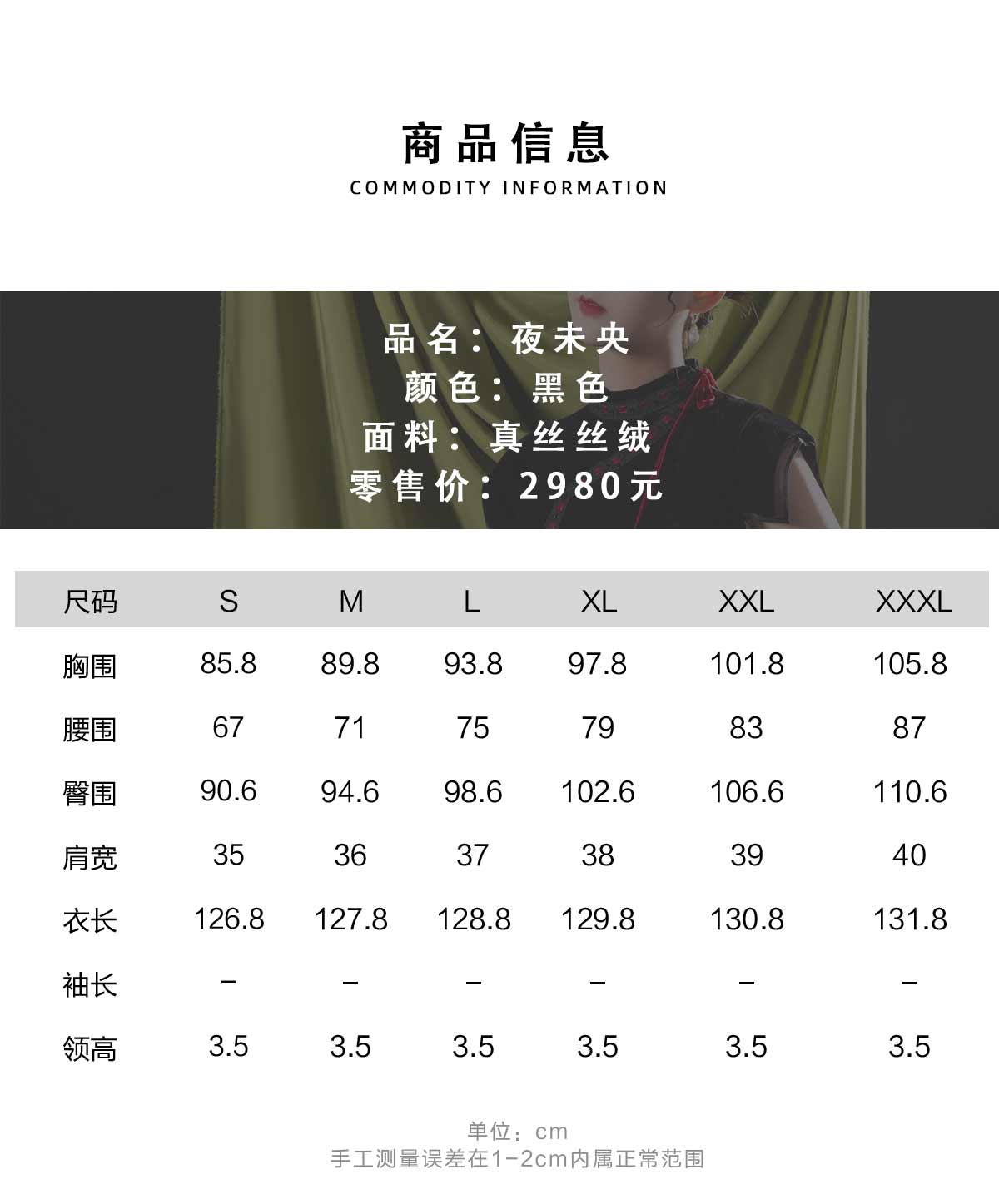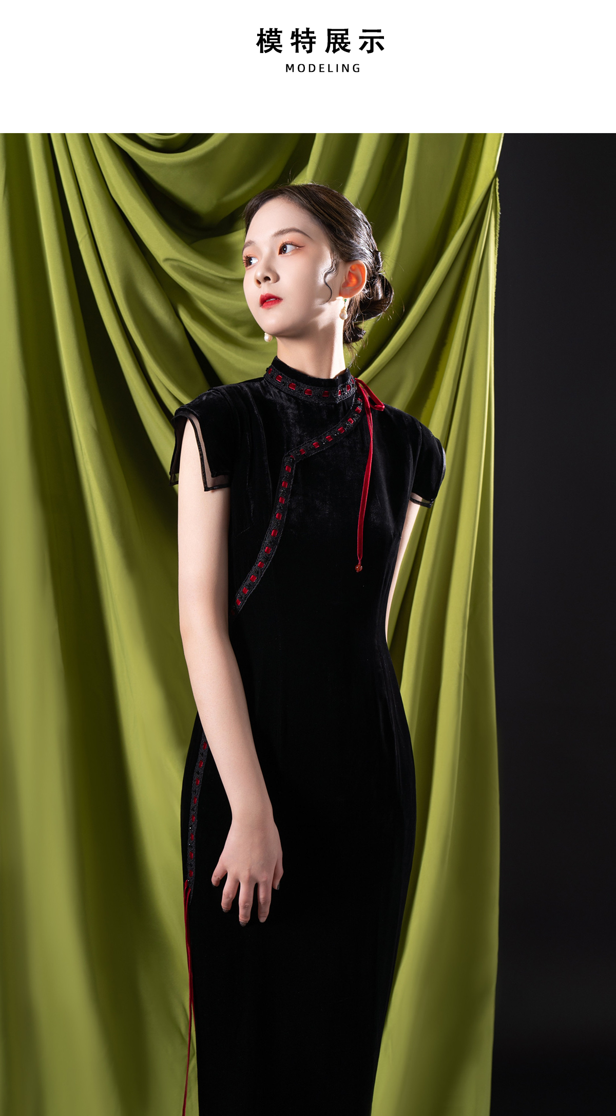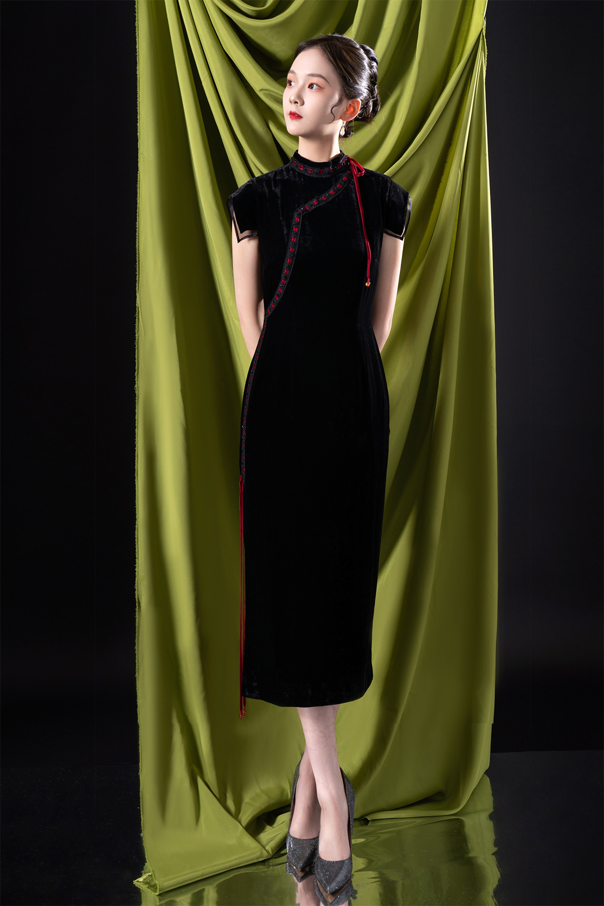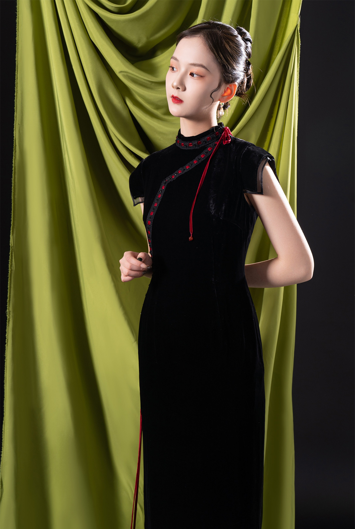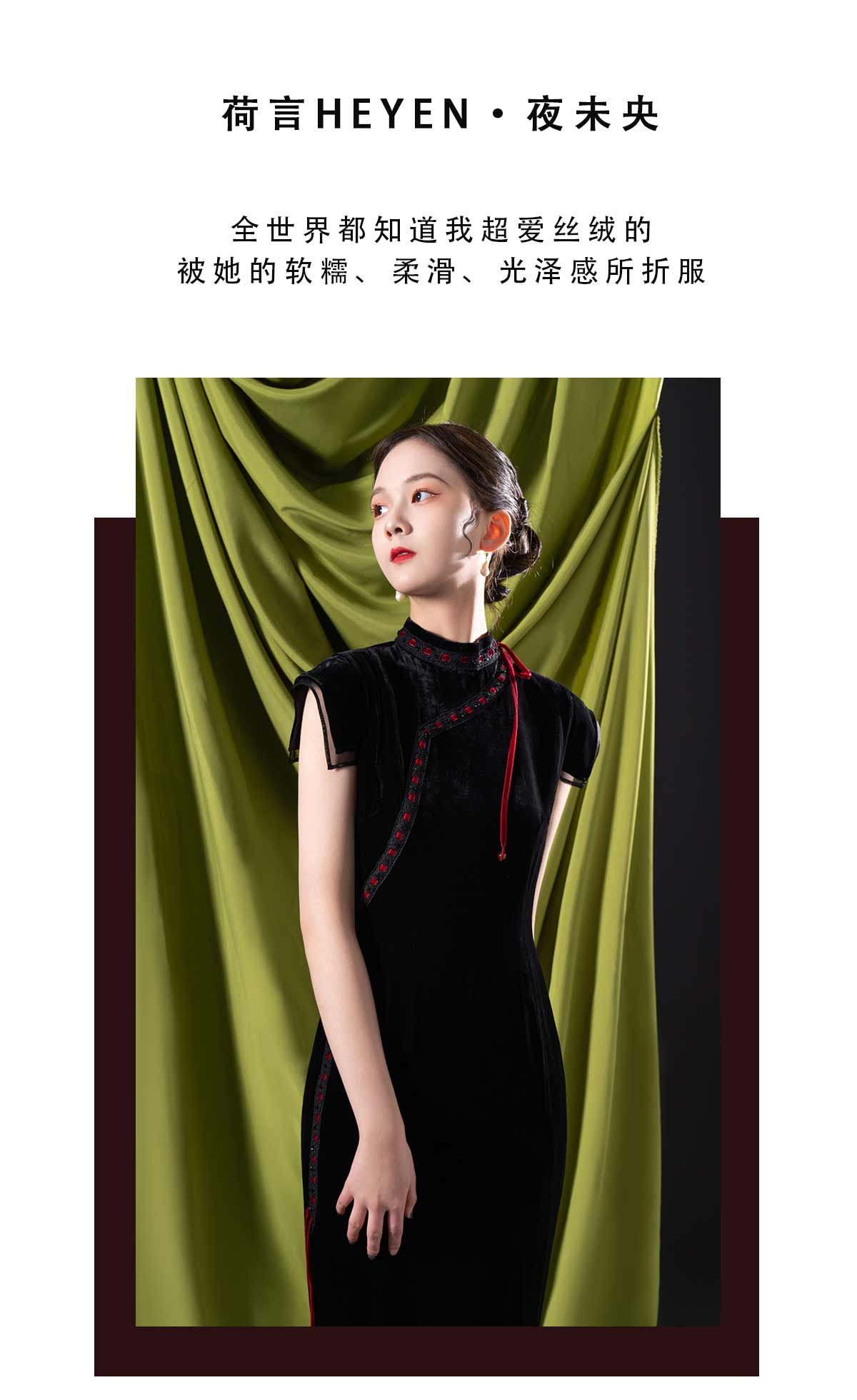 荷言HEHEN纯手工定制 夜未央 黑色百分真丝丝绒复古筒子领特色拼接袖细带改良旗袍裙
