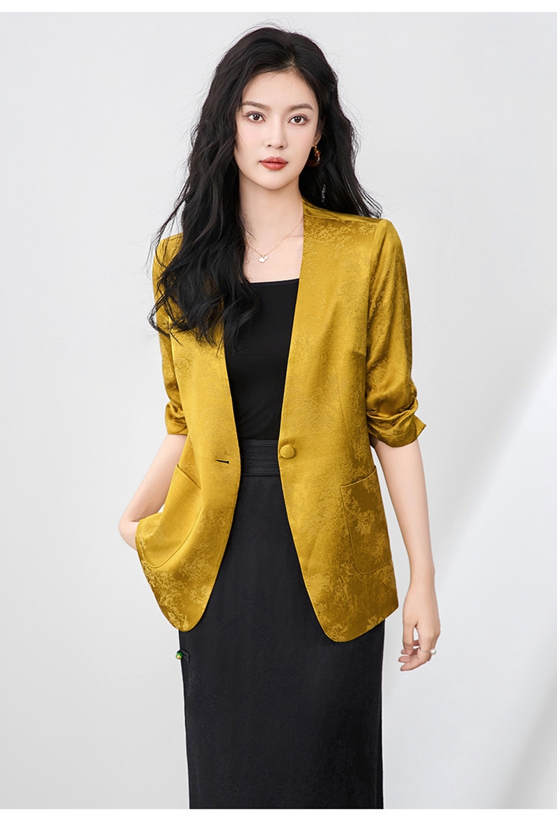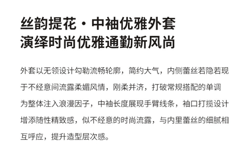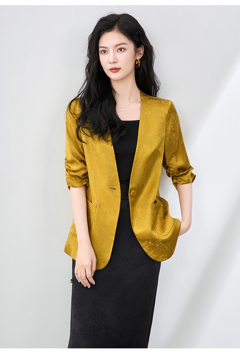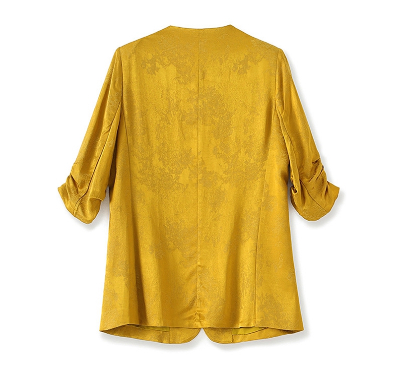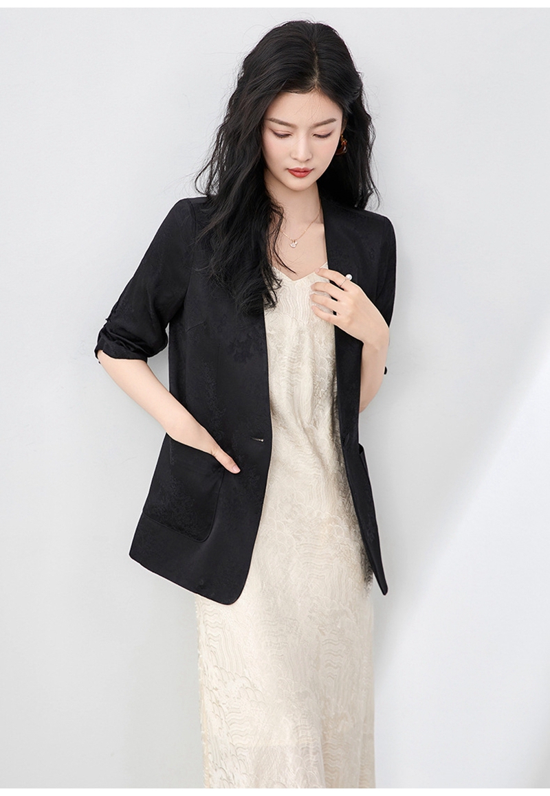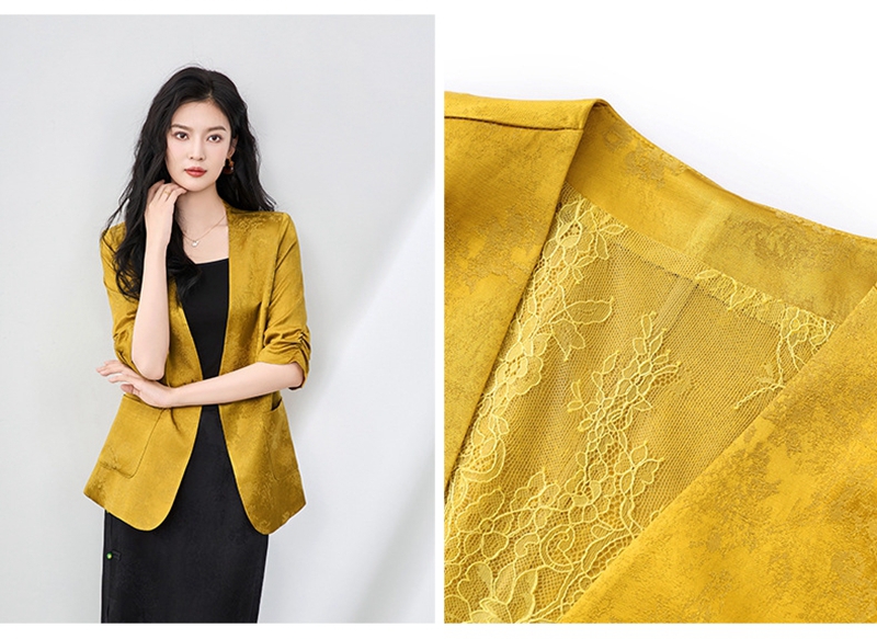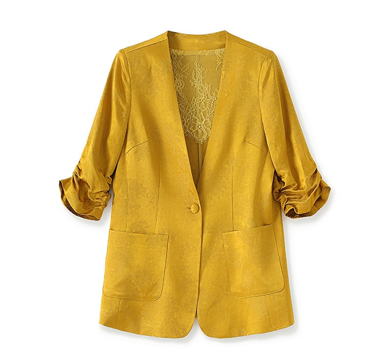 时尚提花人丝抽褶五分袖V领蕾丝西装外套