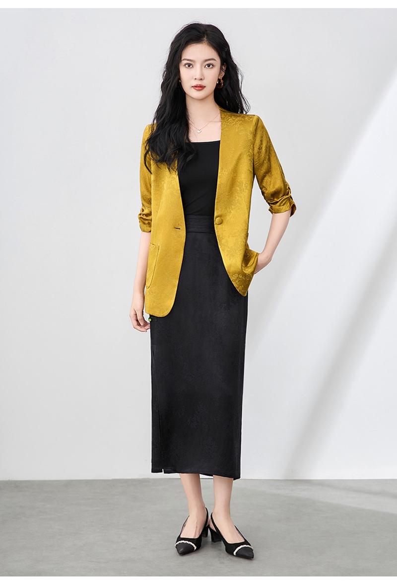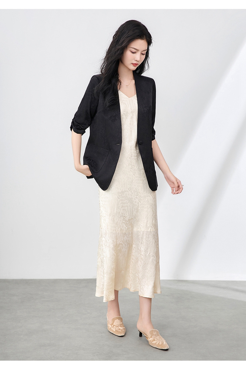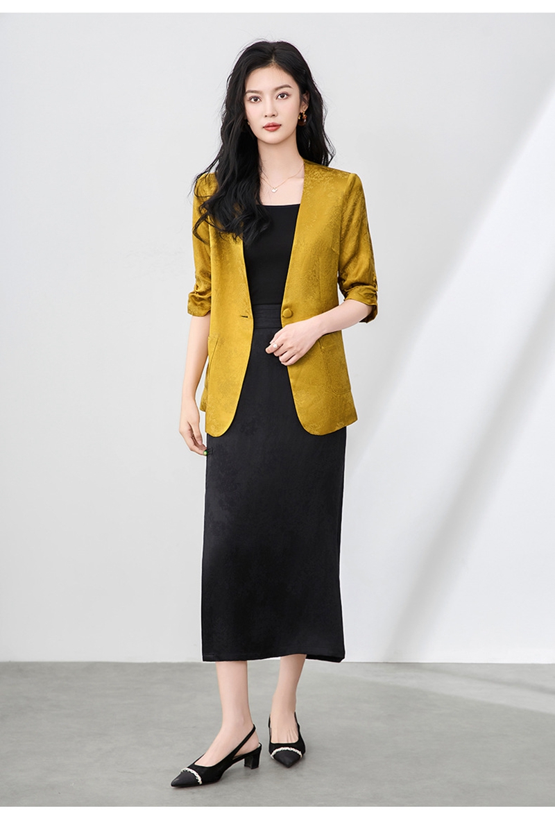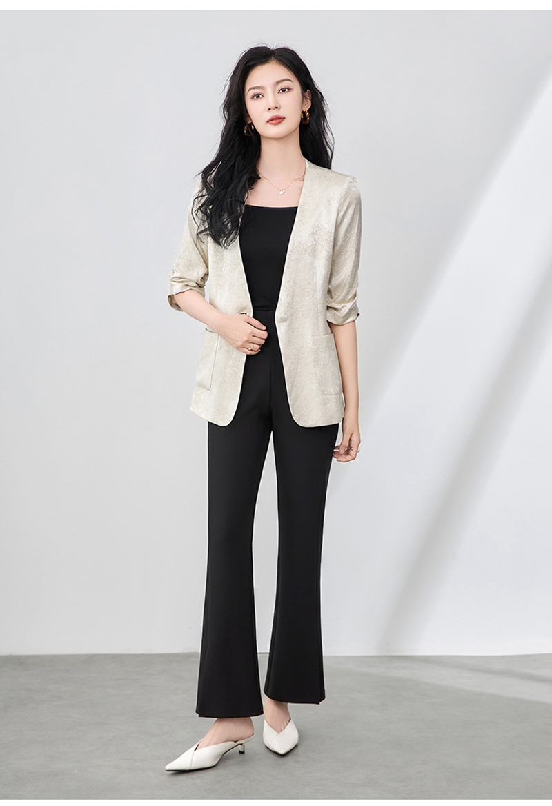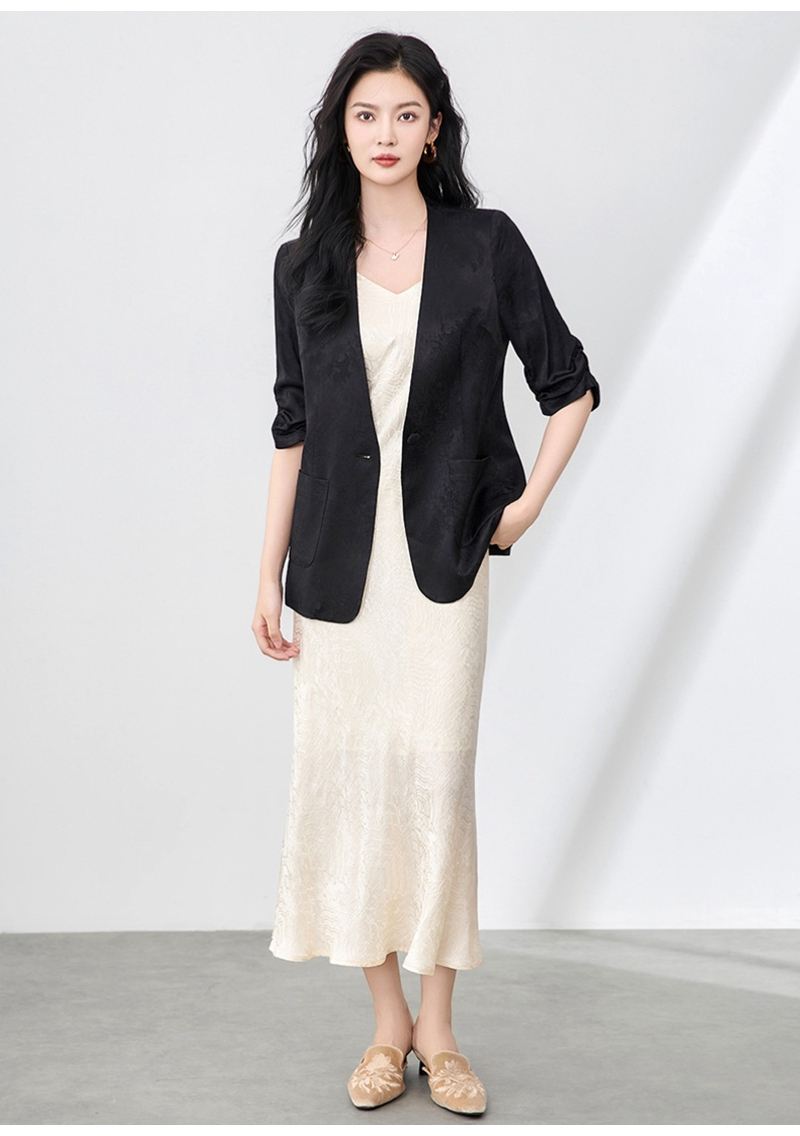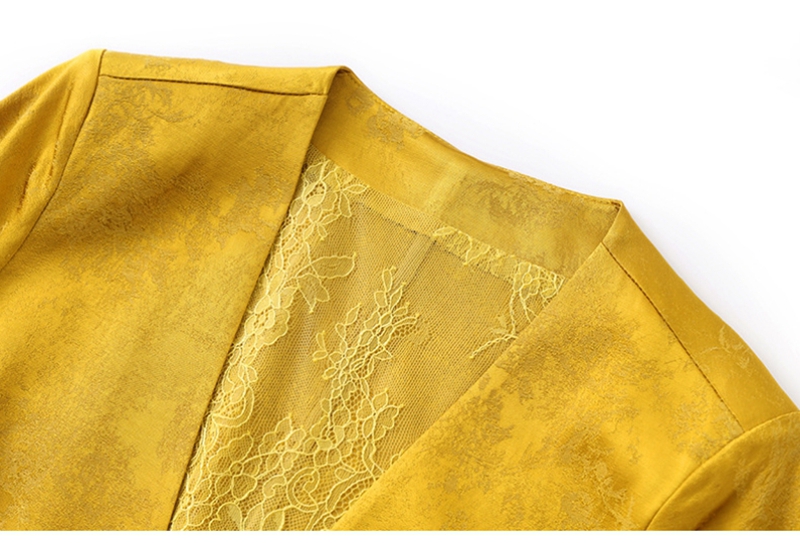 时尚提花人丝抽褶五分袖V领蕾丝西装外套