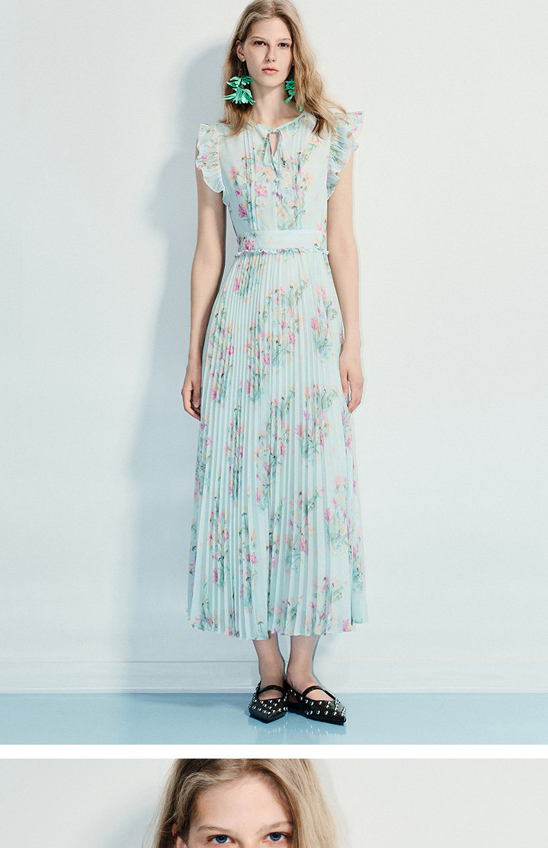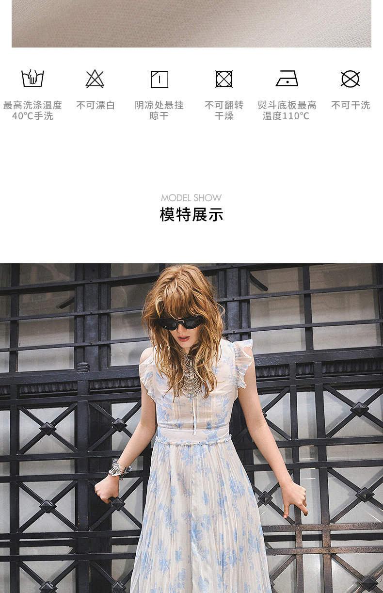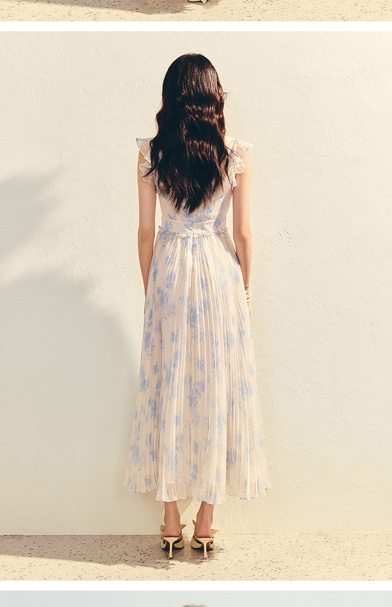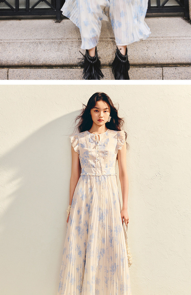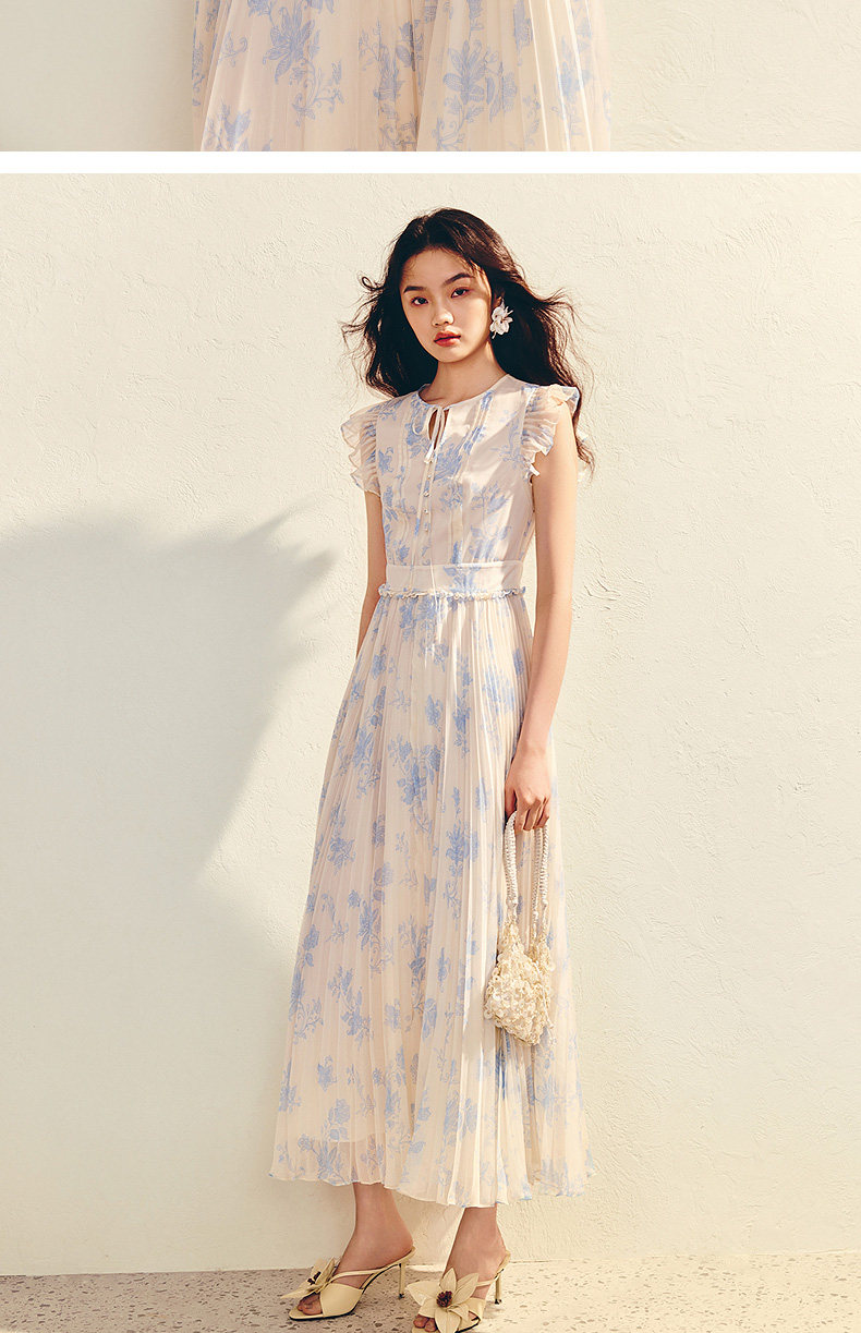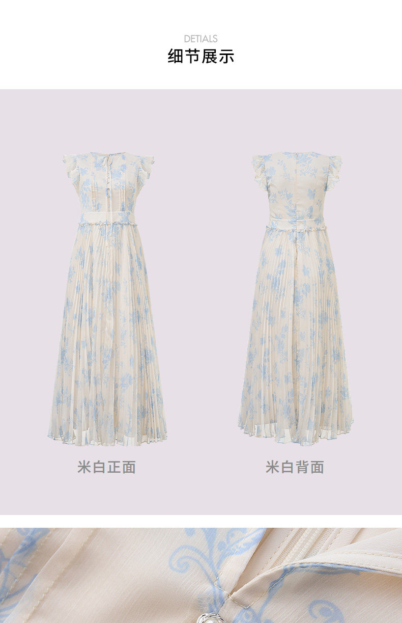 玛克门店发货:蓝星花连衣裙25夏款优雅百褶小飞袖裙子气质感收腰长裙(货号:MS86DR070)