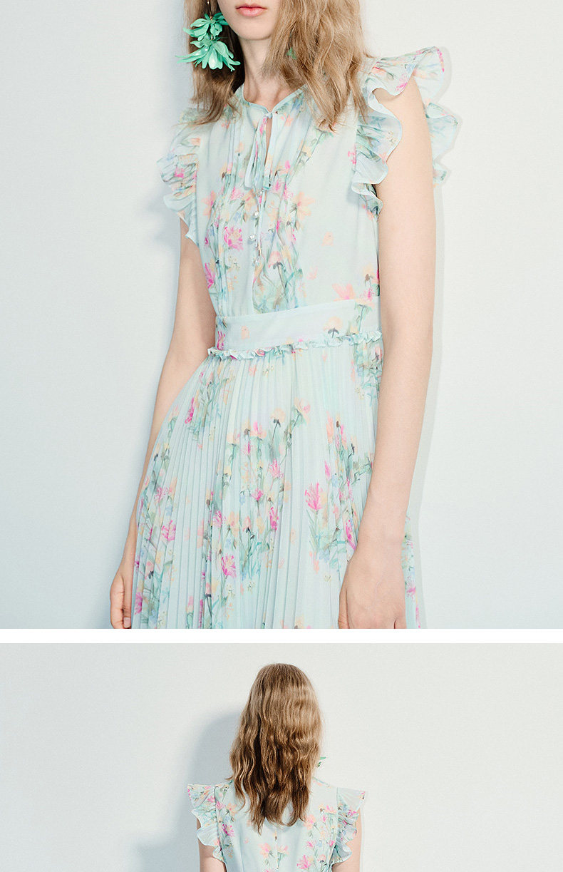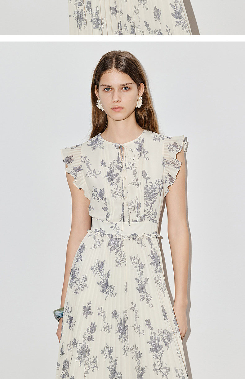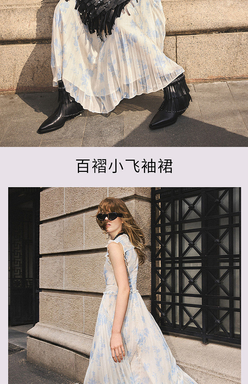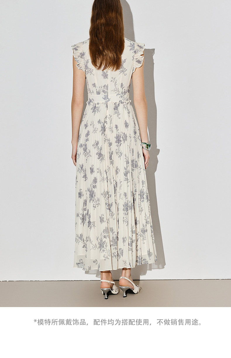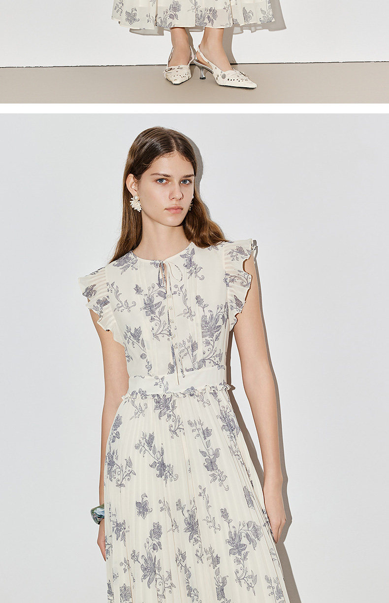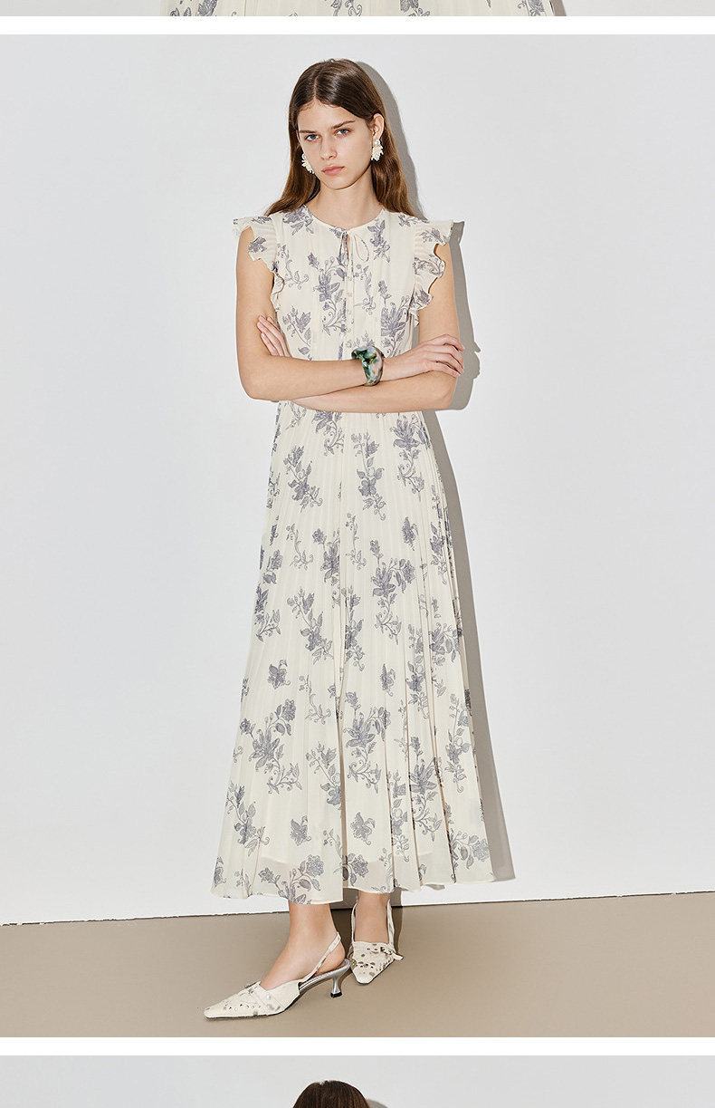 玛克门店发货:蓝星花连衣裙25夏款优雅百褶小飞袖裙子气质感收腰长裙(货号:MS86DR070)