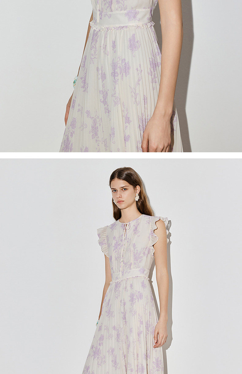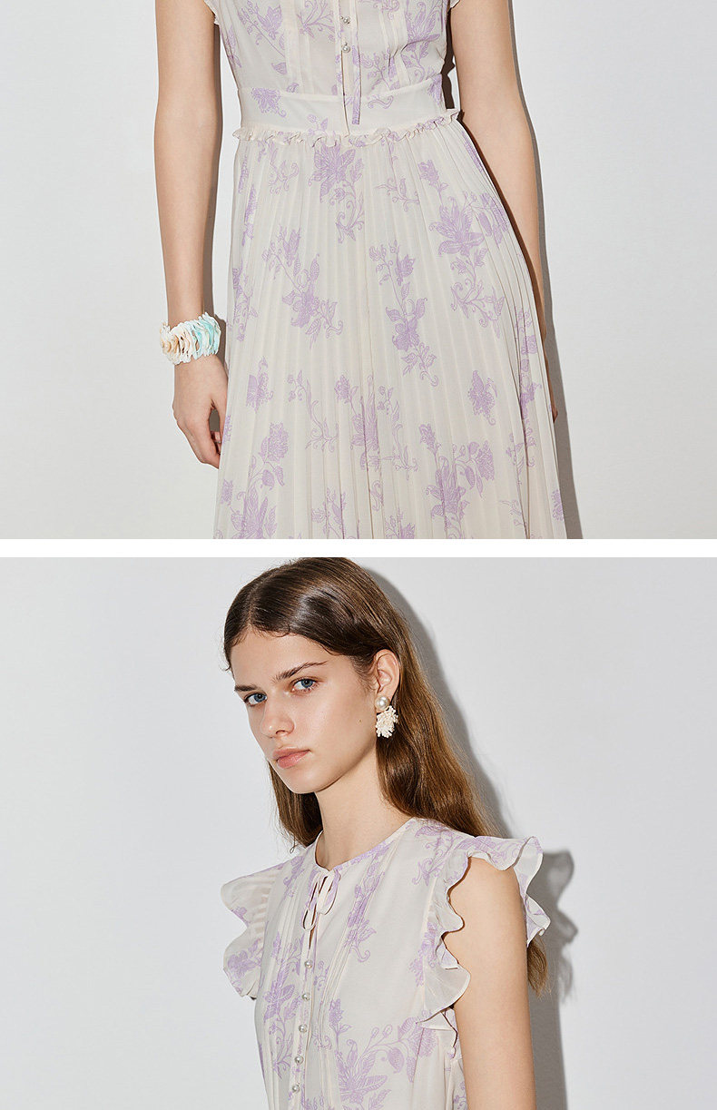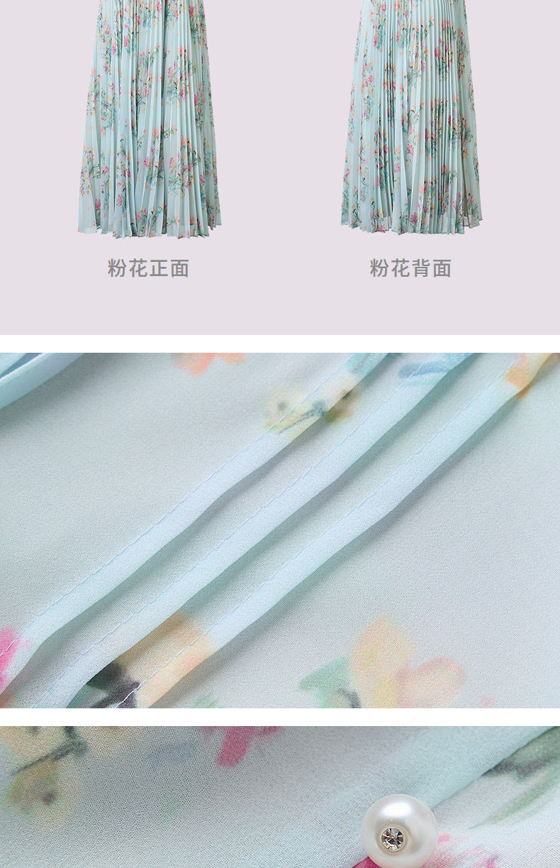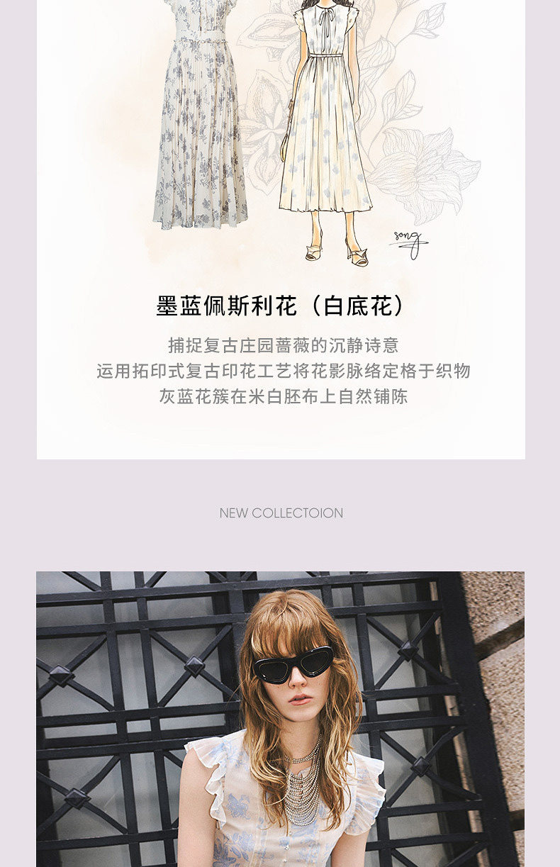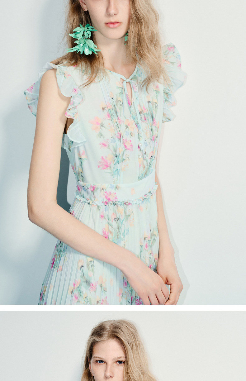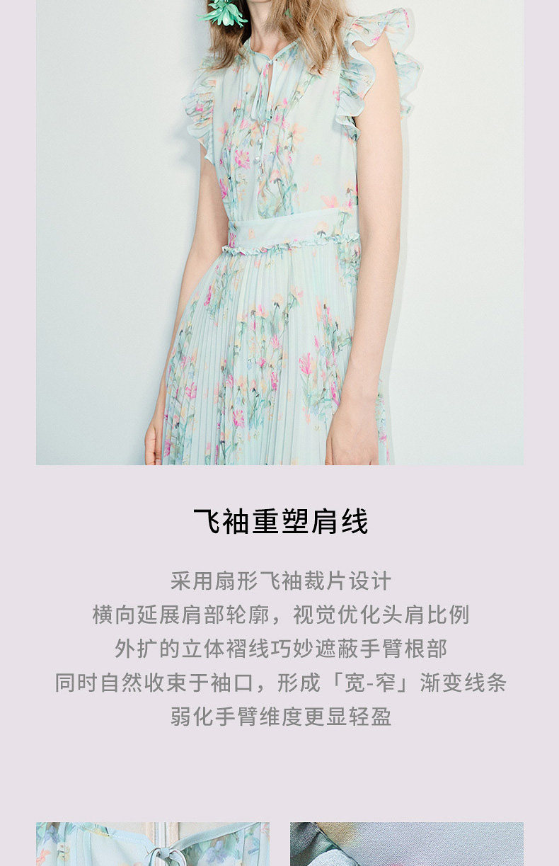 玛克门店发货:蓝星花连衣裙25夏款优雅百褶小飞袖裙子气质感收腰长裙(货号:MS86DR070)